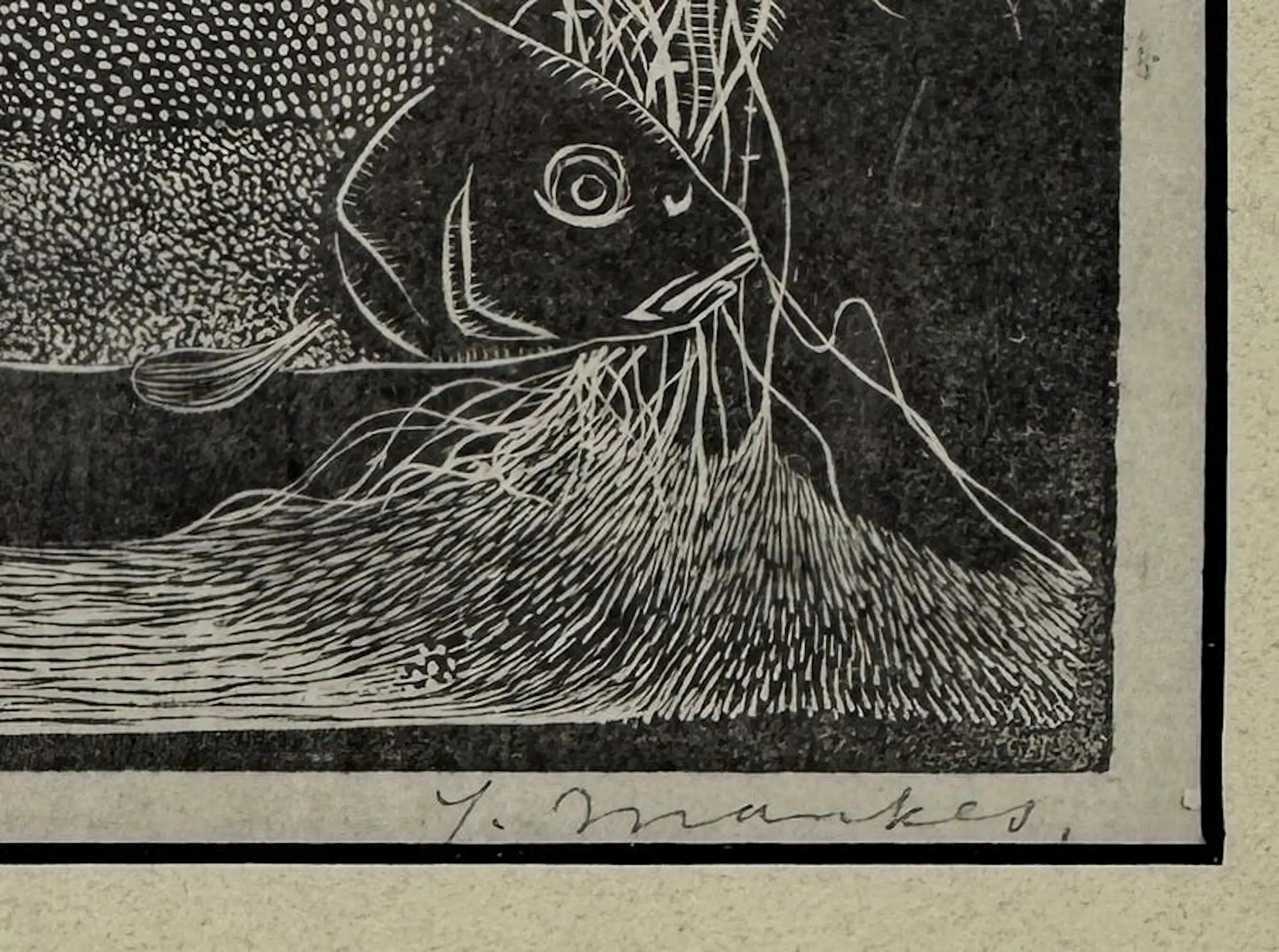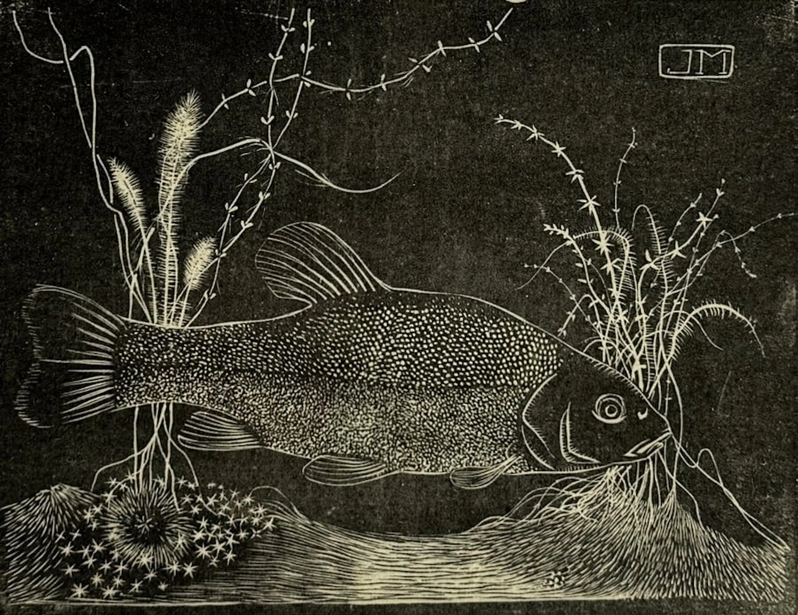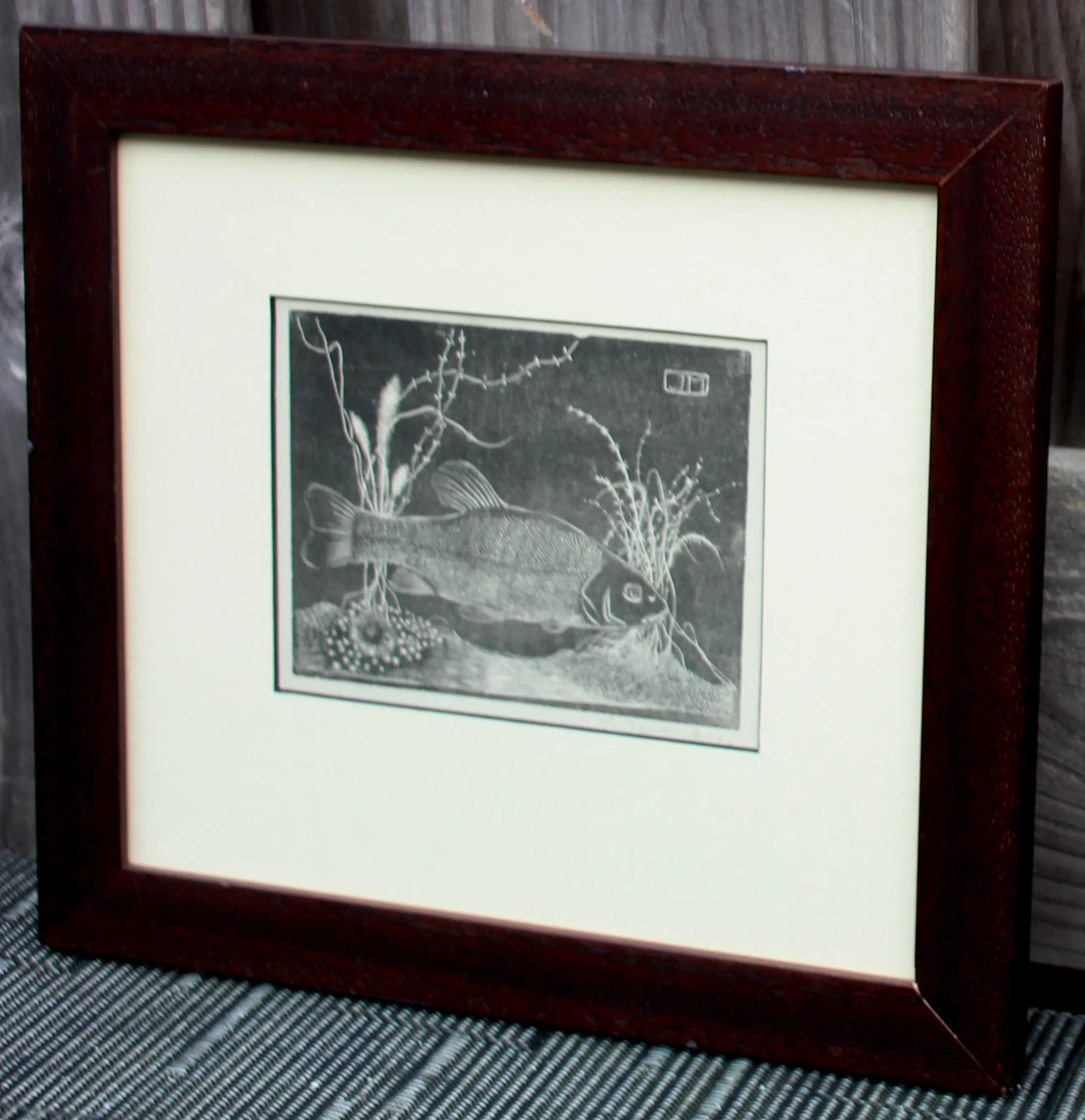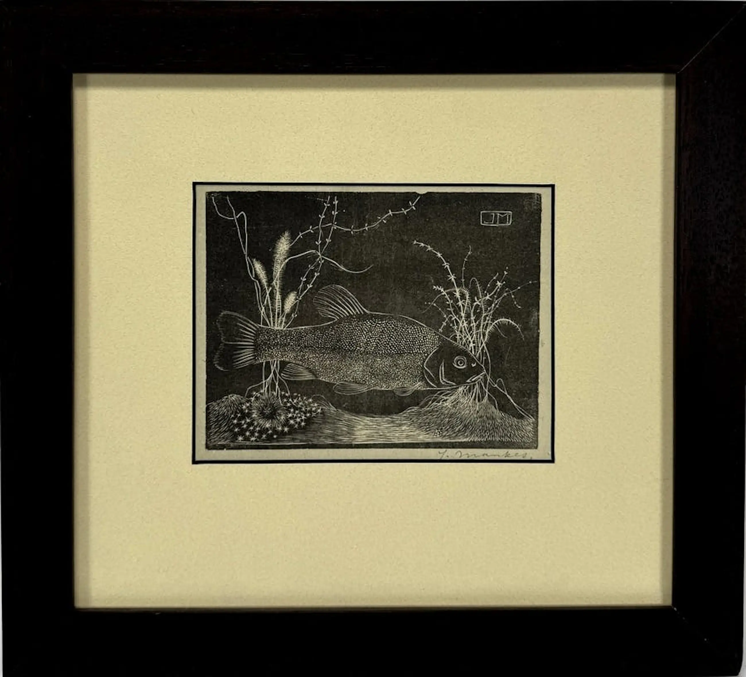 Jan Mankes - Ingelijste houtsnede: vis in een onderwaterlandschap - 1917