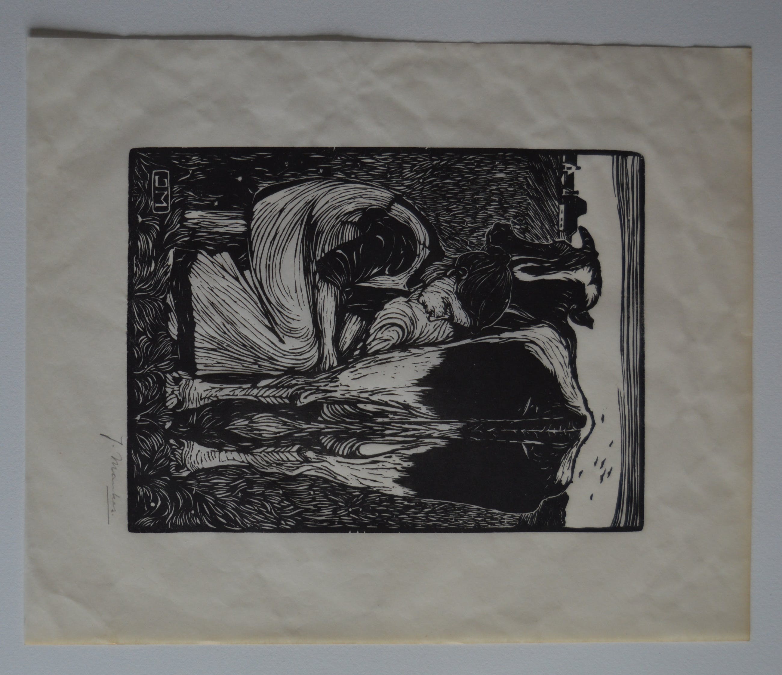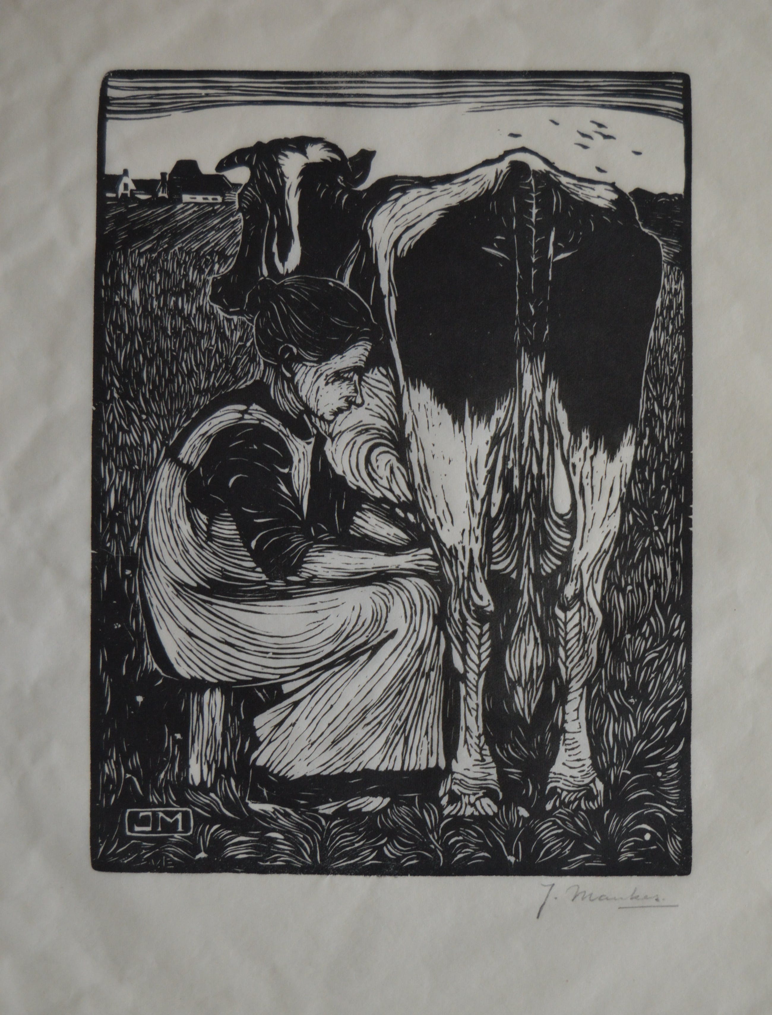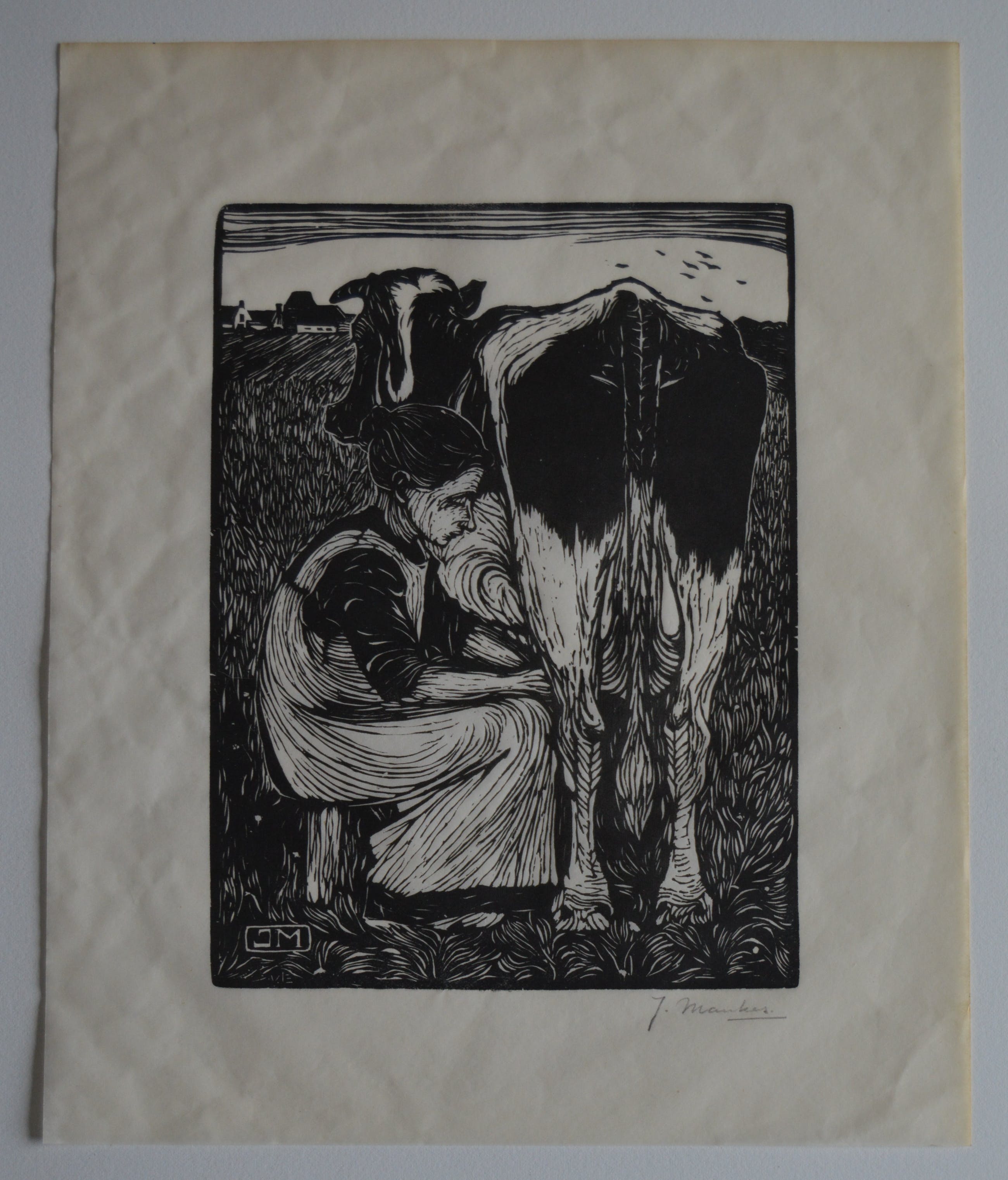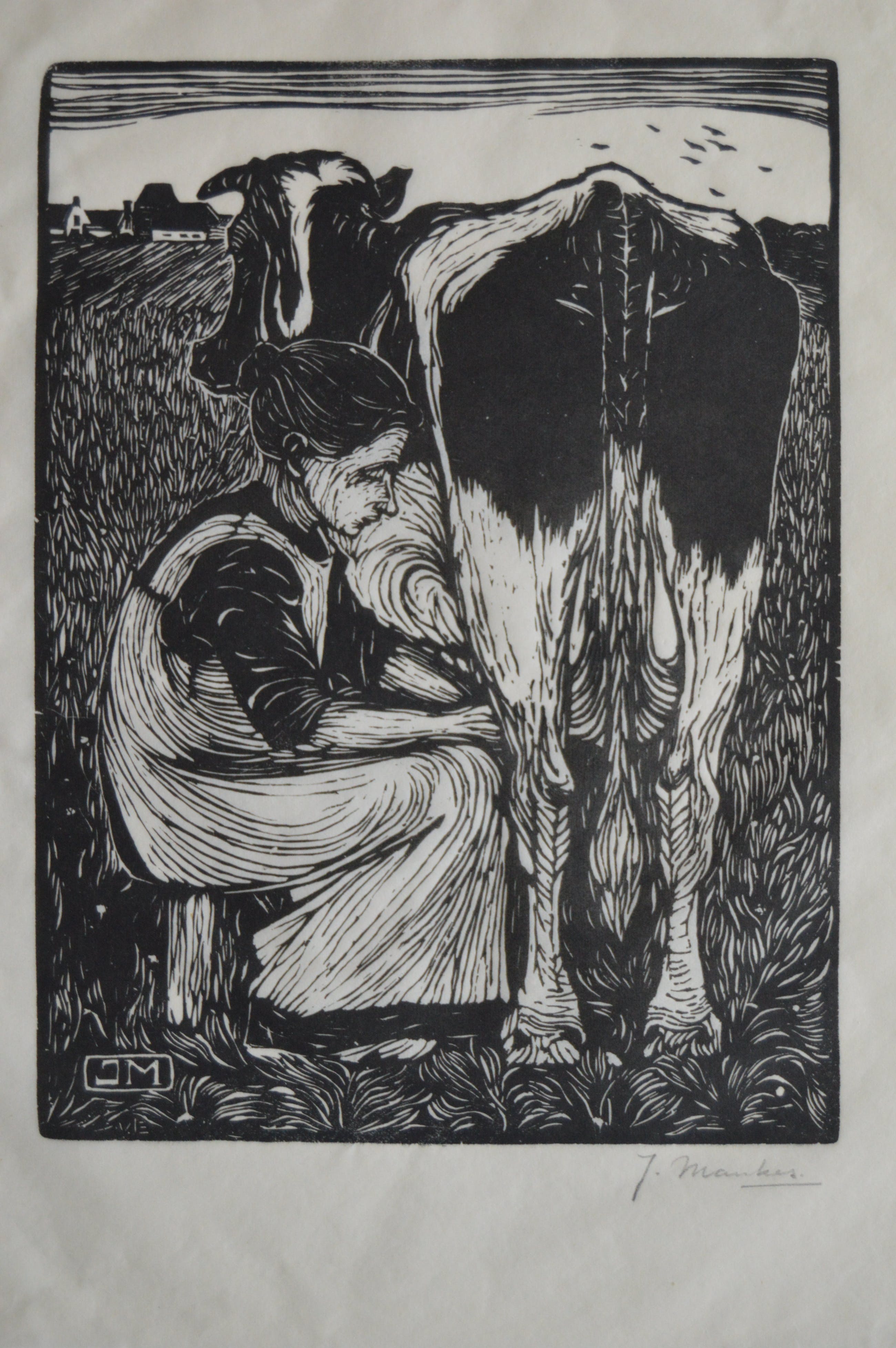 Een mooie houtsnede van Jan Mankes. Jaar; 1914. Gesigneerd met potlood rechtsonder en monogram in de plaat. Op Japans papier. Titel " Koemelkster ". Een zeer mooie afdruk . Afmeting totaal 22 * 27 cm