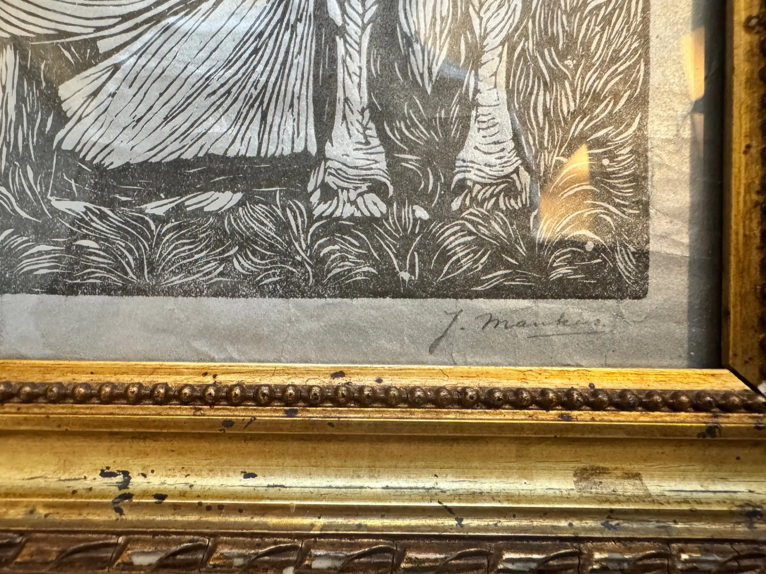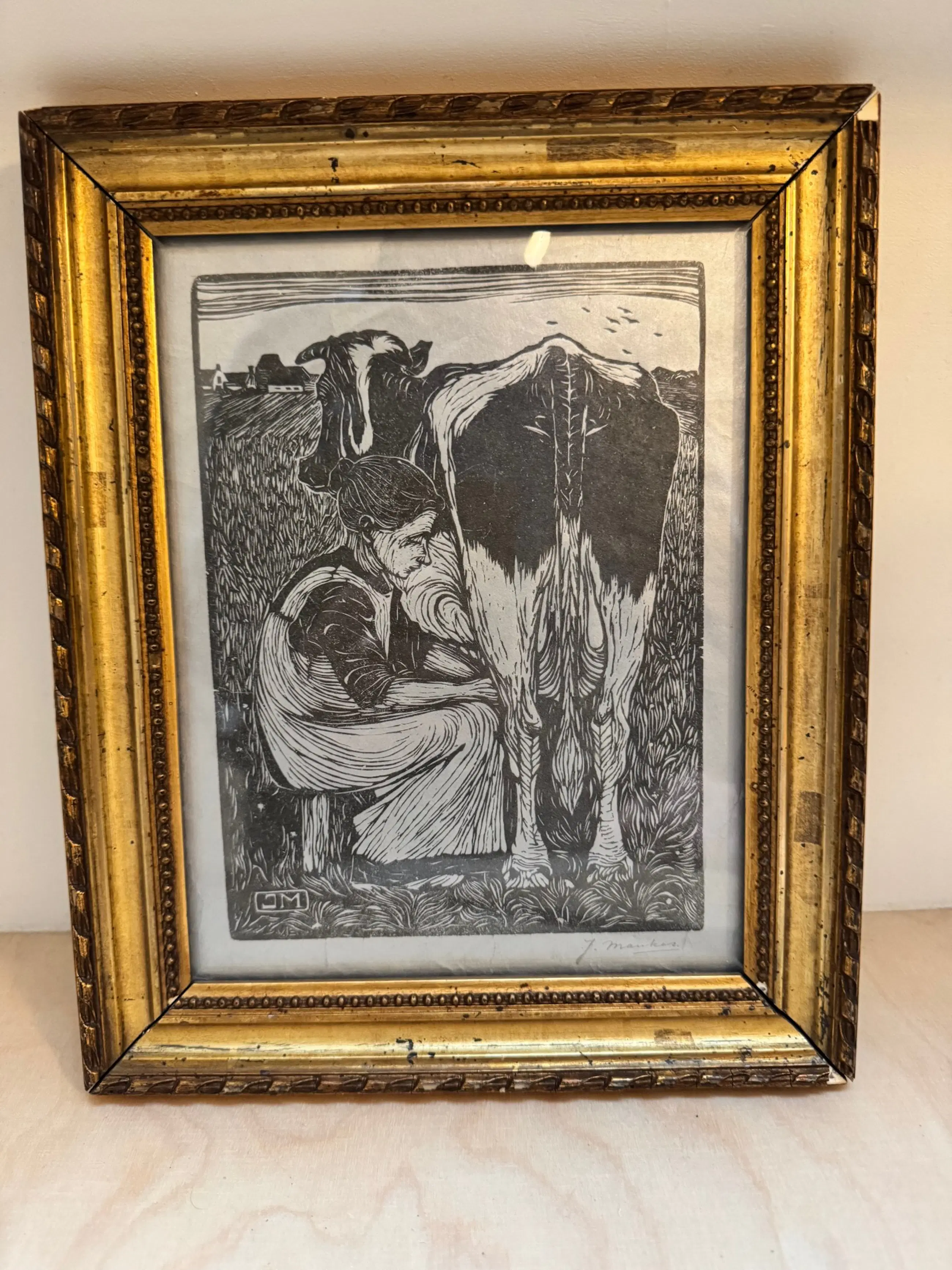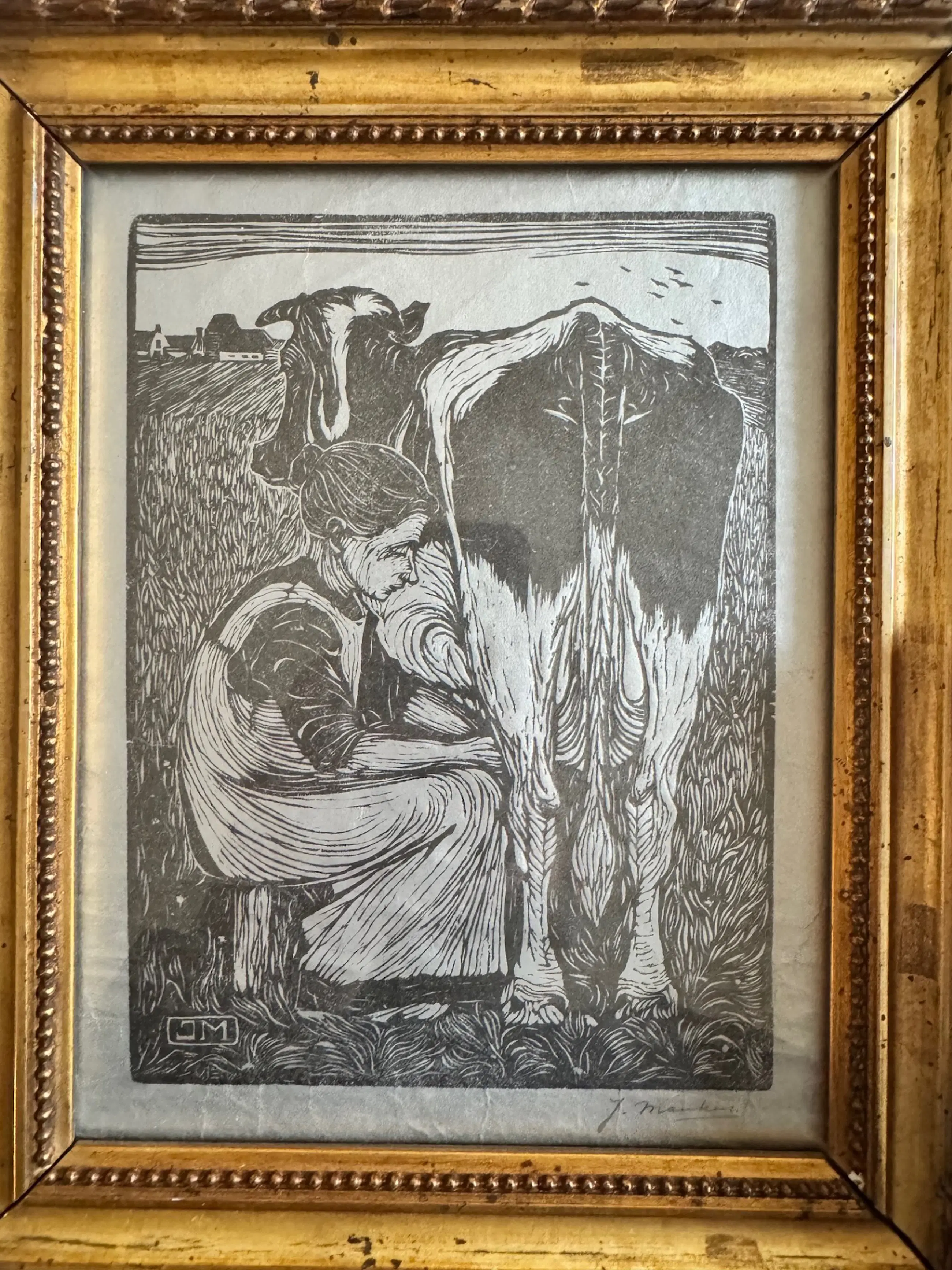 Een zeldzame uitgaven van de houtsnede Koemelkster op zilverpapier door Jan Mankes
