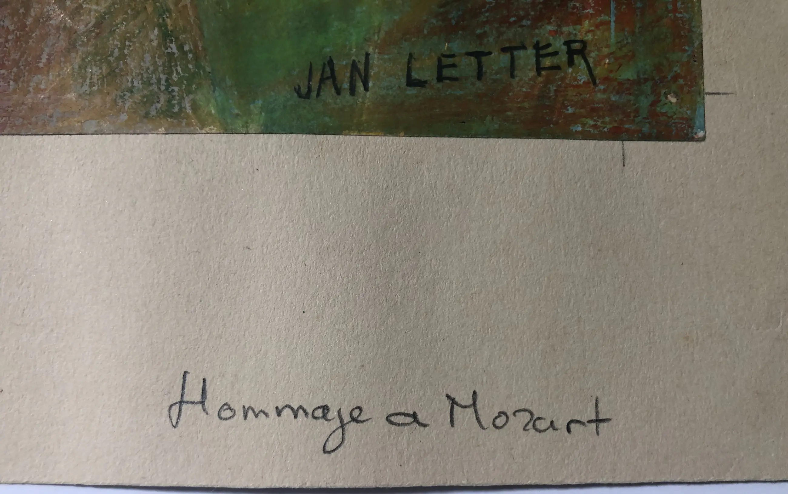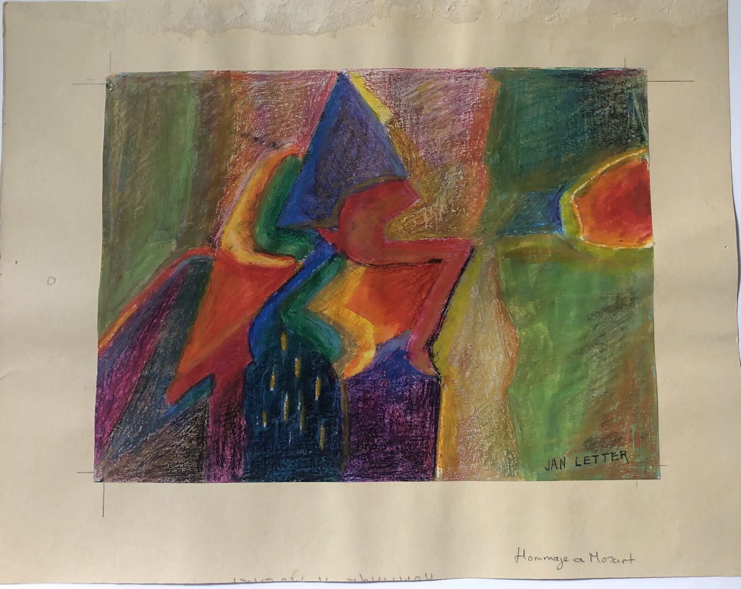 Kleurrijke voorstelling met titel: Hommage aan Mozart. 21-28,5 geplakt op stevig papier 29.5-38 cm.