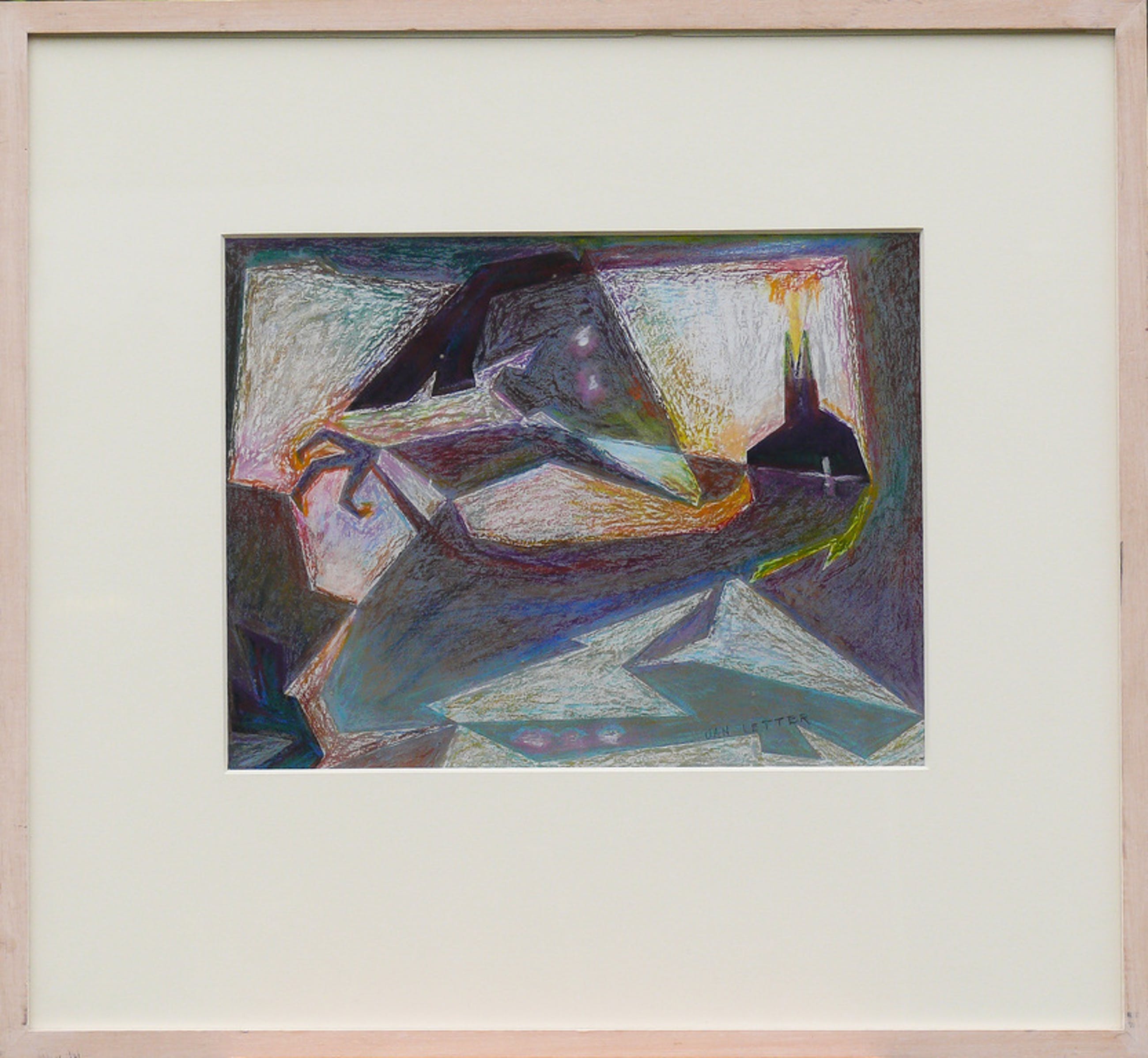 De tekening is met passe-partout achter glas ingelijst (houten lijst).