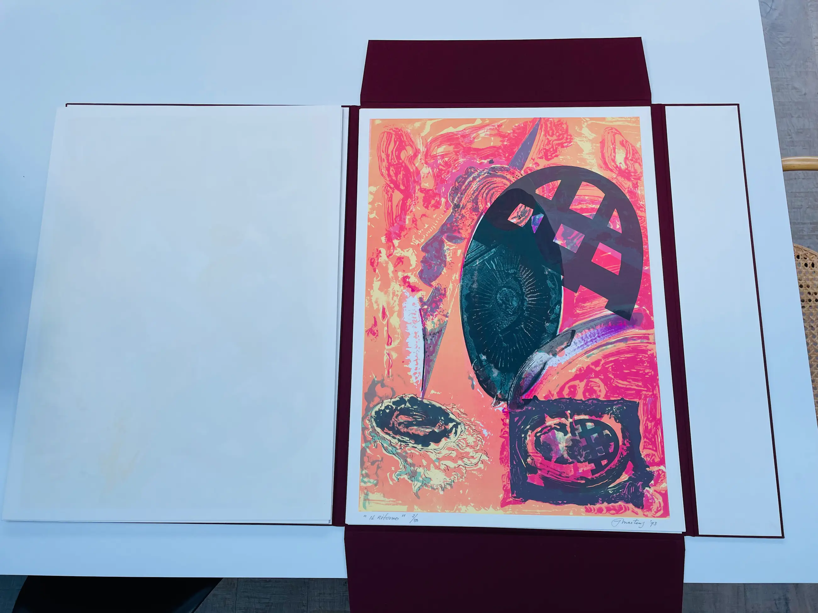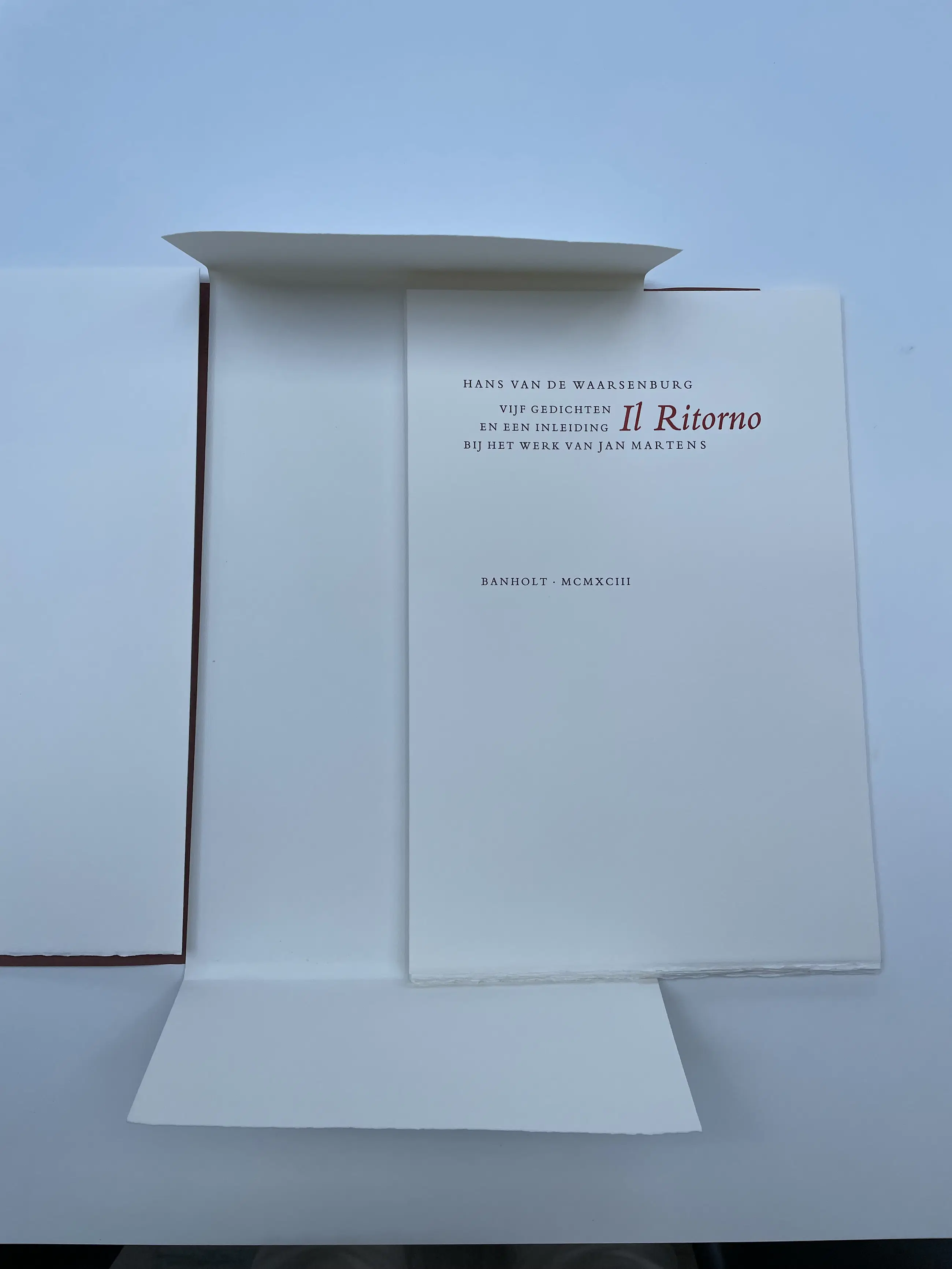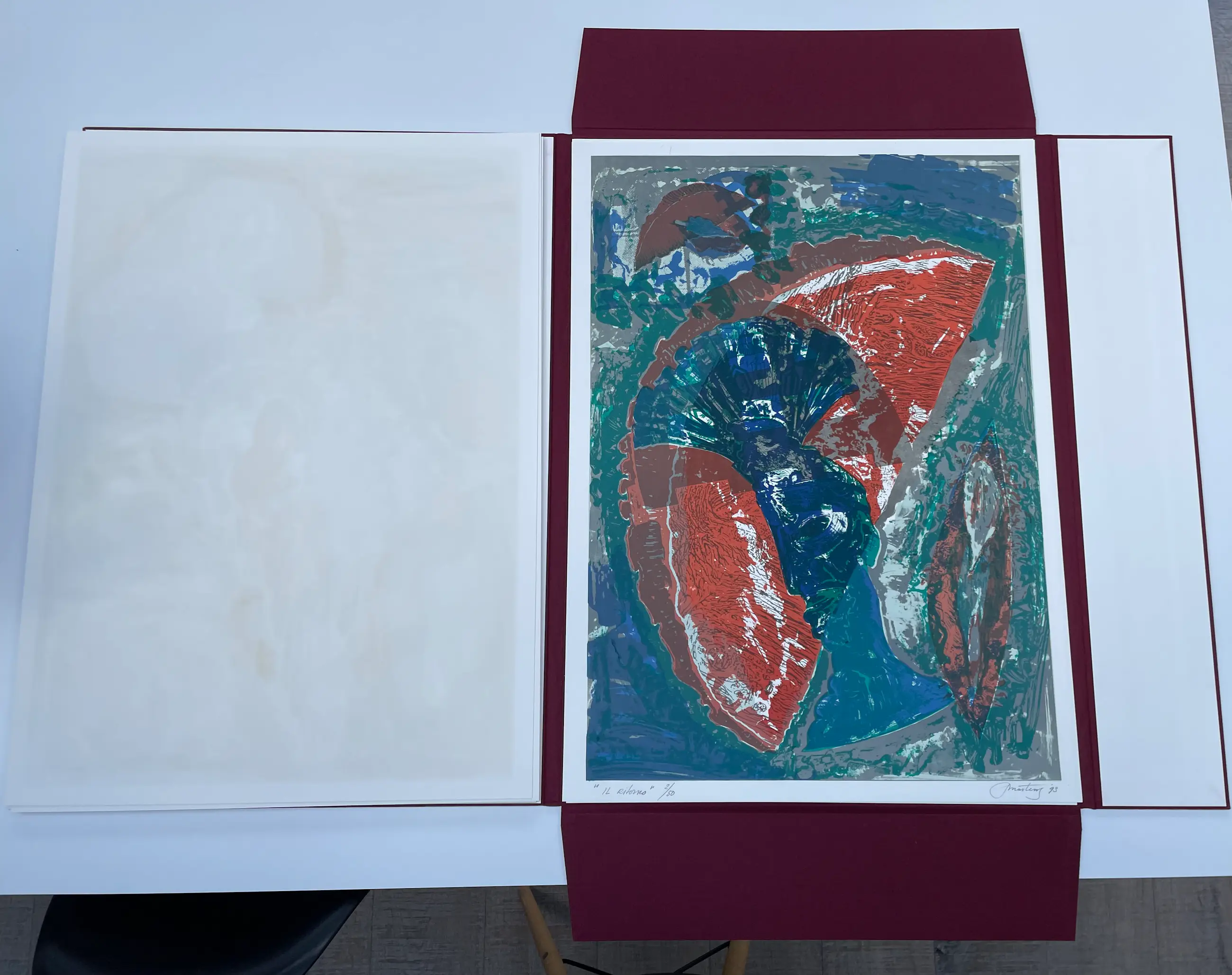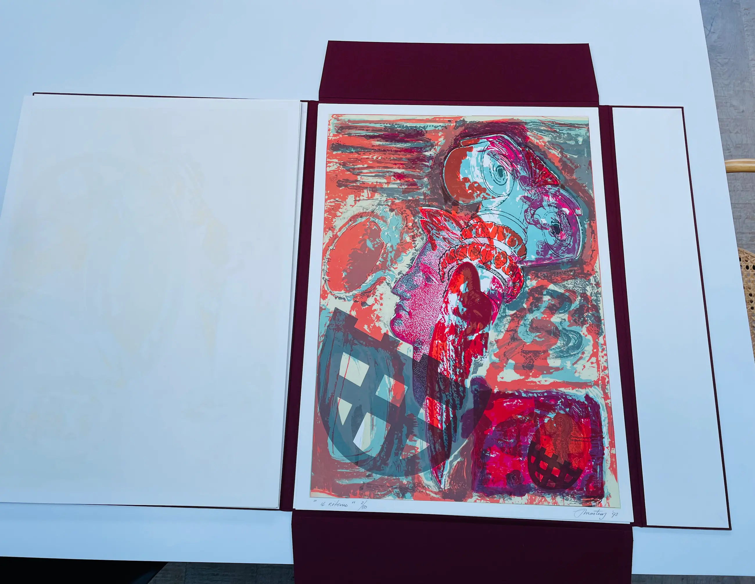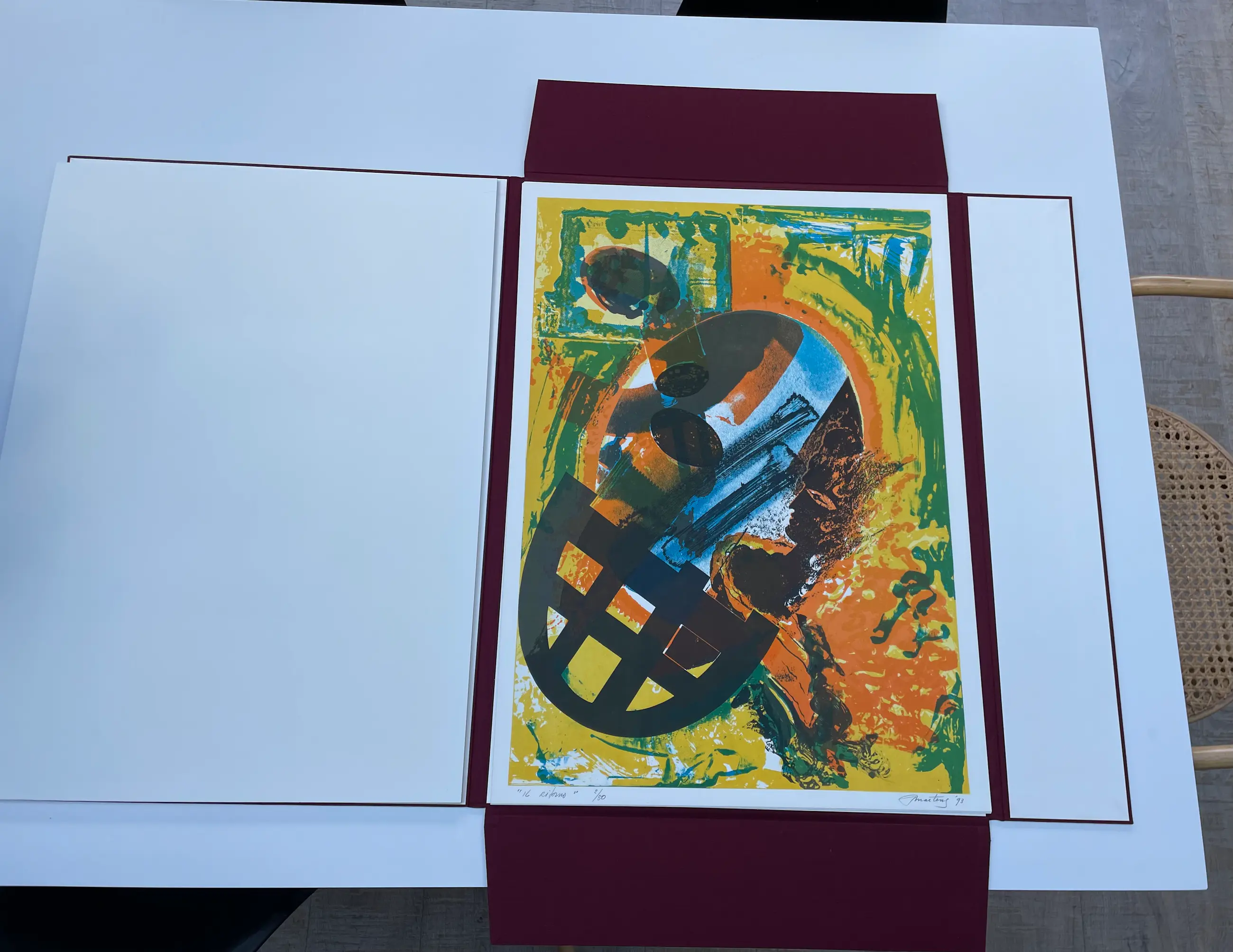 Linnen map met 4 prachtige litho’s, gedrukt in vijf en zes kleuren bij Steendrukkerij Amsterdam. Bijbehorend schreef Hans van de Waarsenburg vijf gedichten die losbladig in een papieren map in de linnen map zijn opgenomen. De werken en gedichten zijn in zeer goede staat. Dit is oplage twee van de vijftig. De litho’s zijn genummerd en gesigneerd door Jan Martens.