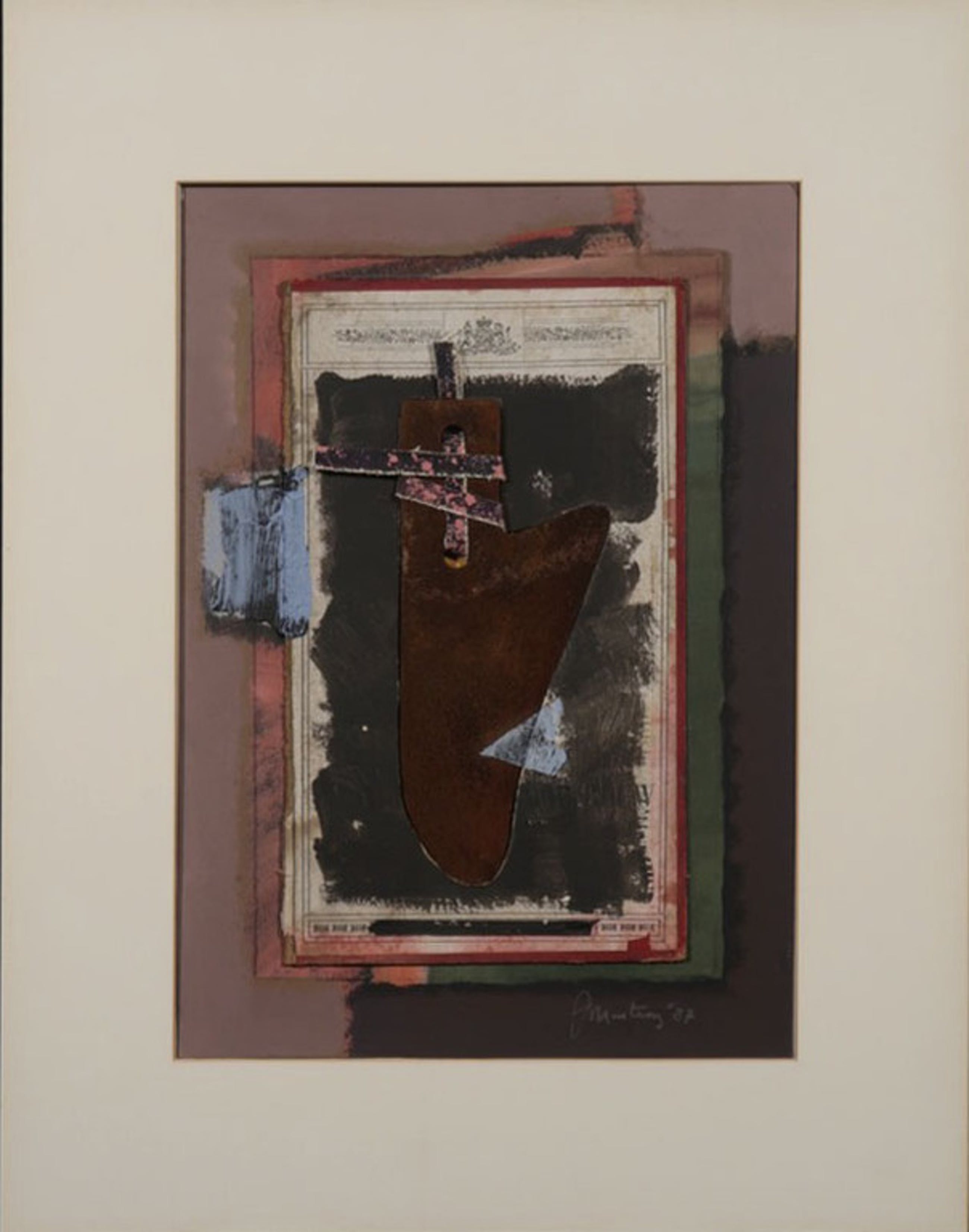 Materiaal: Gemengde techniek, o.a. Collage, stof en ijzer op karton