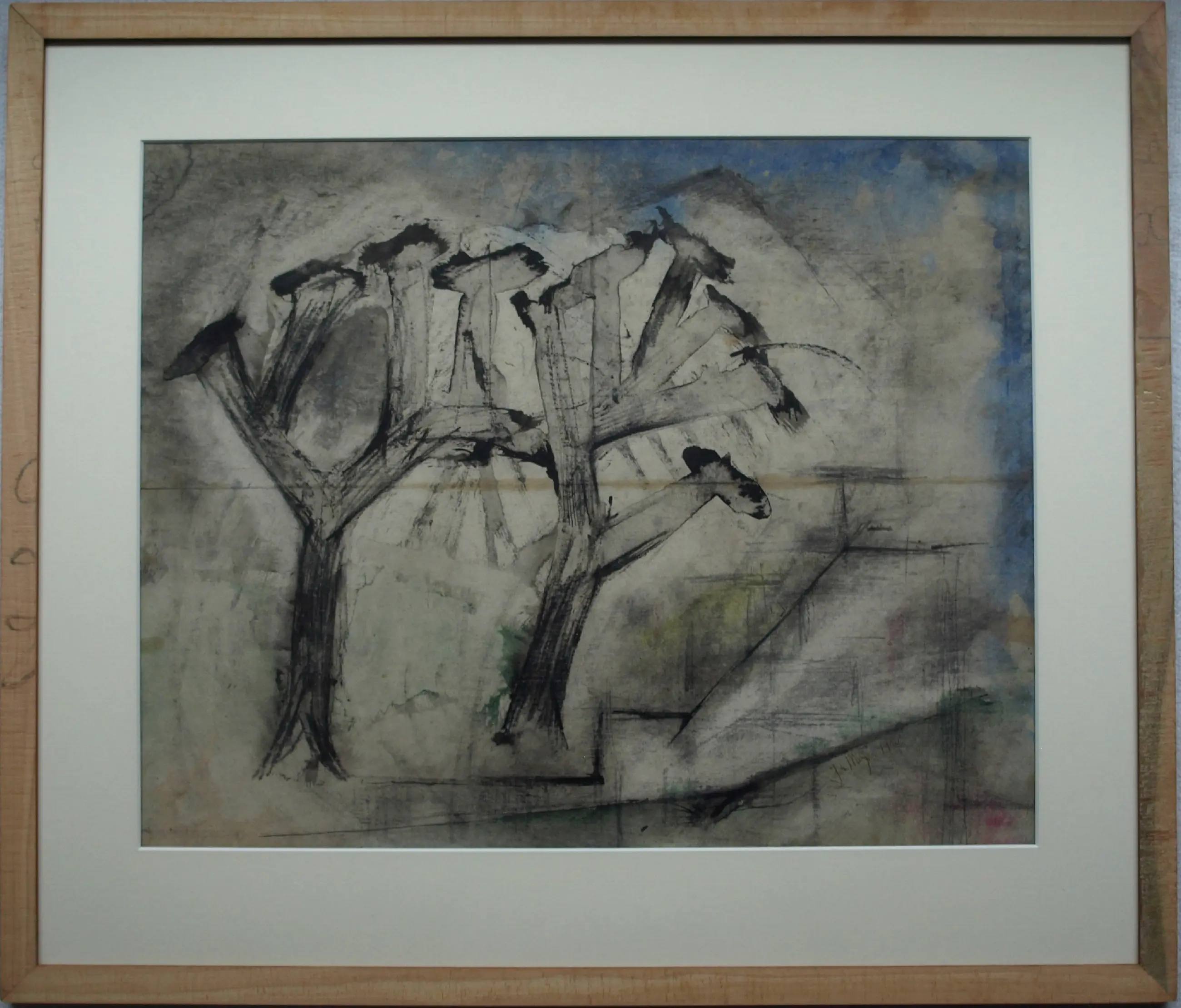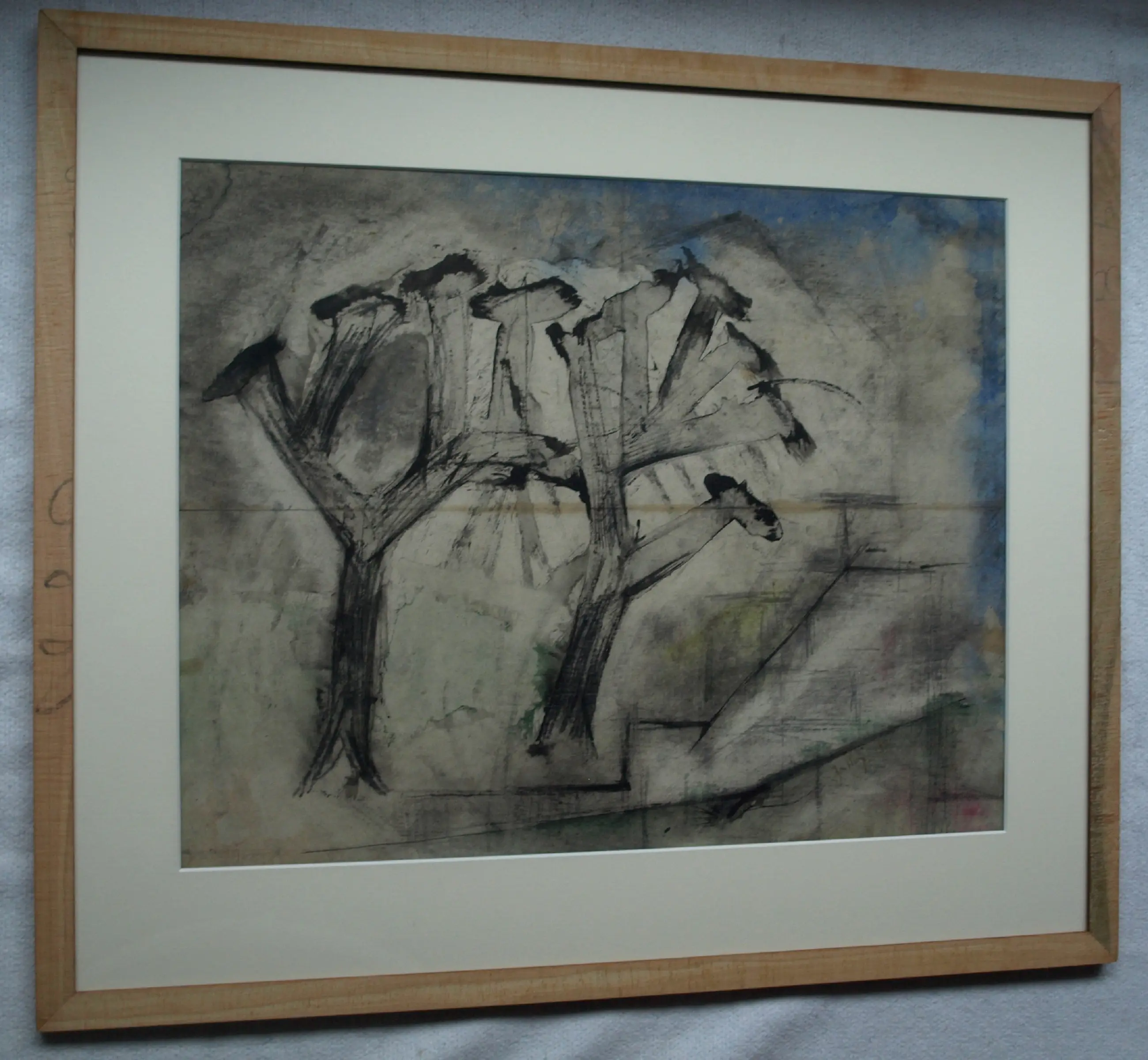 Een ingelijst werk uit 1950 van de Nederlandse kunstenaar Jan Meijer (1927-1995) met een abstracte voorstelling van Kurkeikenbomen in Collioure (Zuid-Frankrijk). -Gesigneerd en gedateerd rechtsonder in het werk en ook met naamsvermelding op de achterkant van de lijst in een uitsparing (zie de laatste foto). -Ingelijst in een houten lijst met passe-partout en glasplaat. -Afmetingen: Lijst, 53,5 x 62,5 x 1,5 cm. Beeld, 37,5 x 47,5 cm. -Herkomst: Uit een inboedel met meerdere werken van deze kunstenaar. -Conditie: In zeer goede staat. Het passe-partout is licht vergeeld. De lijst heeft slijtplekjes en wat potloodvlekken. Zie ook alle foto’s voor een eigen indruk. Kan zo aan de muur.