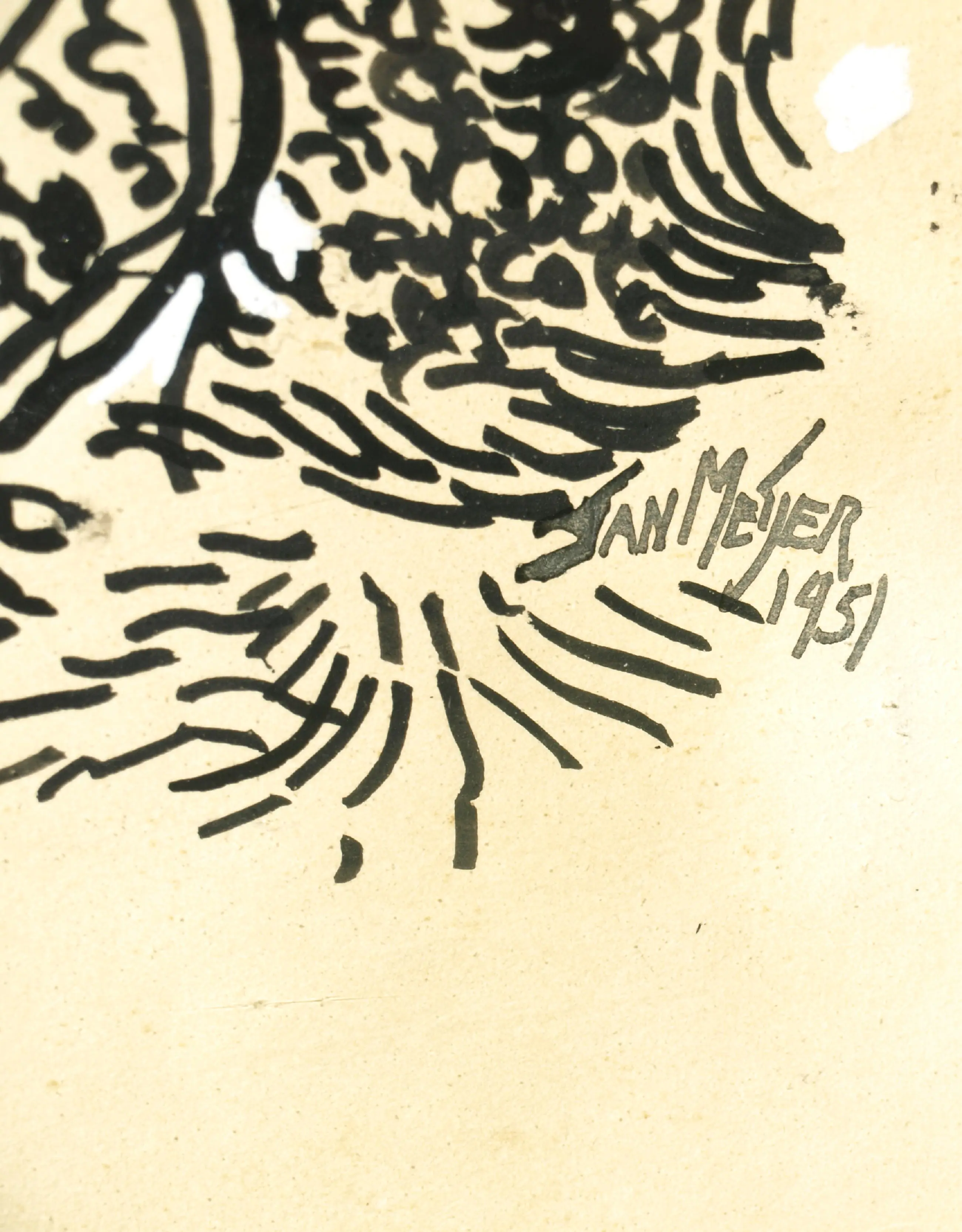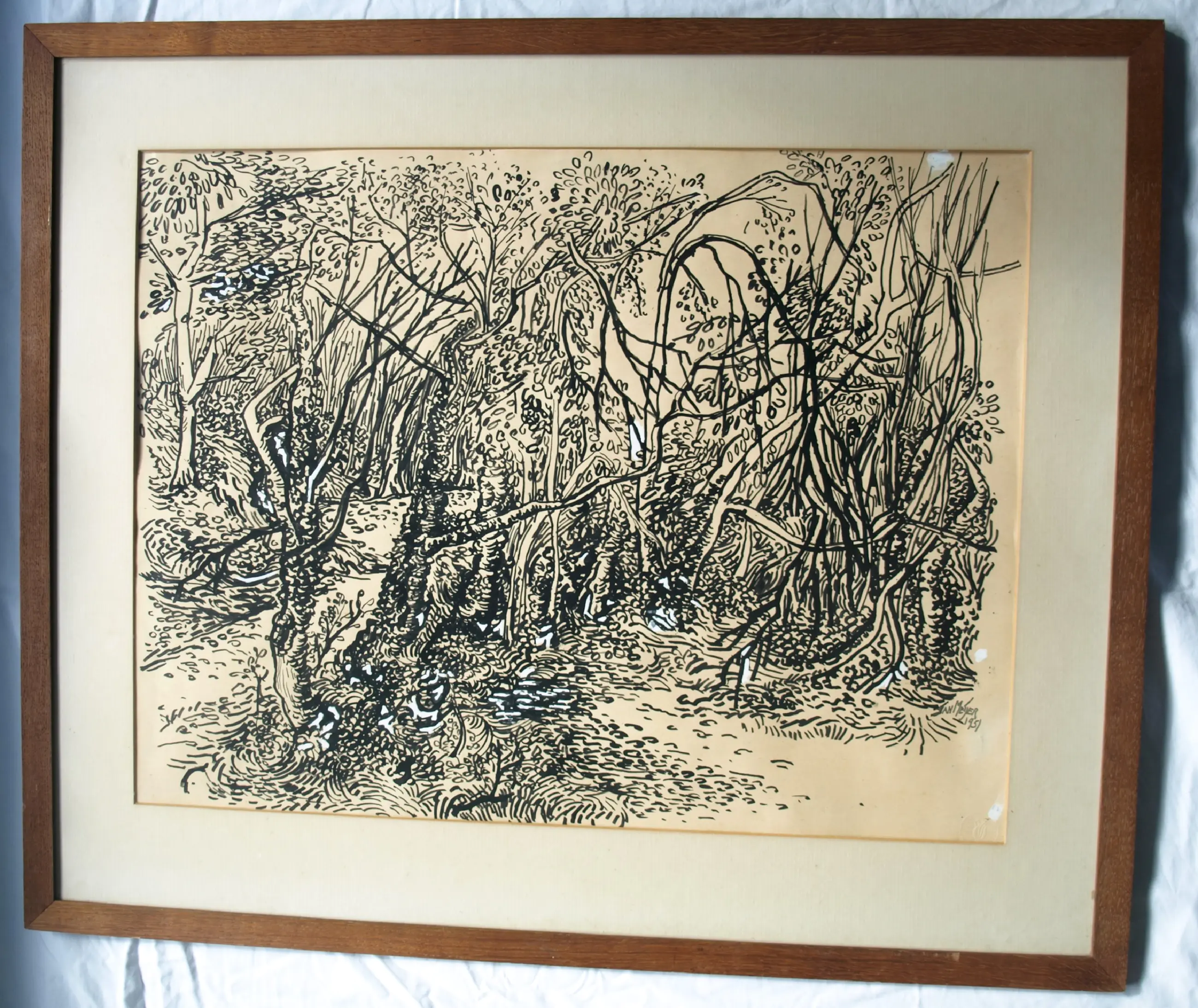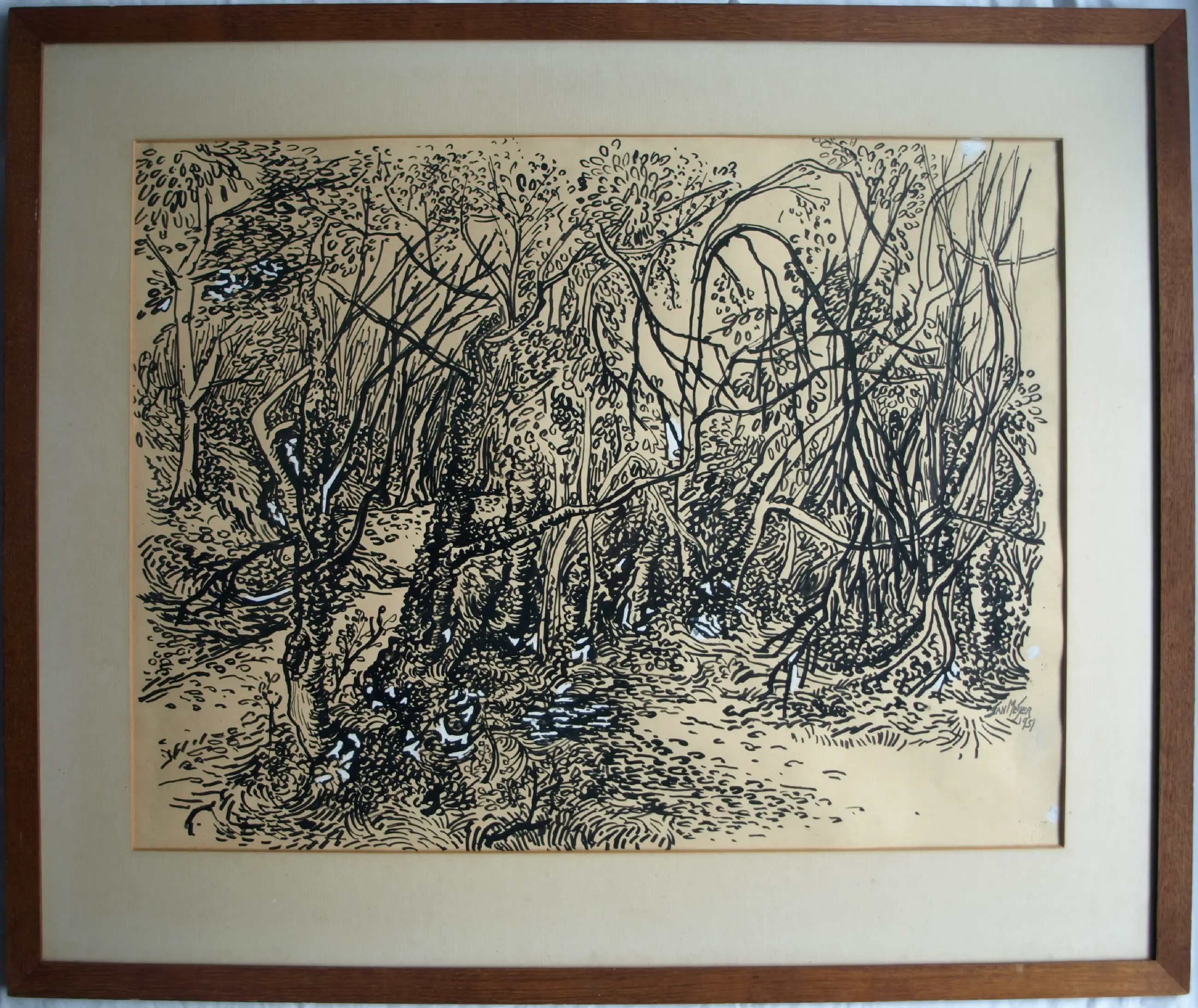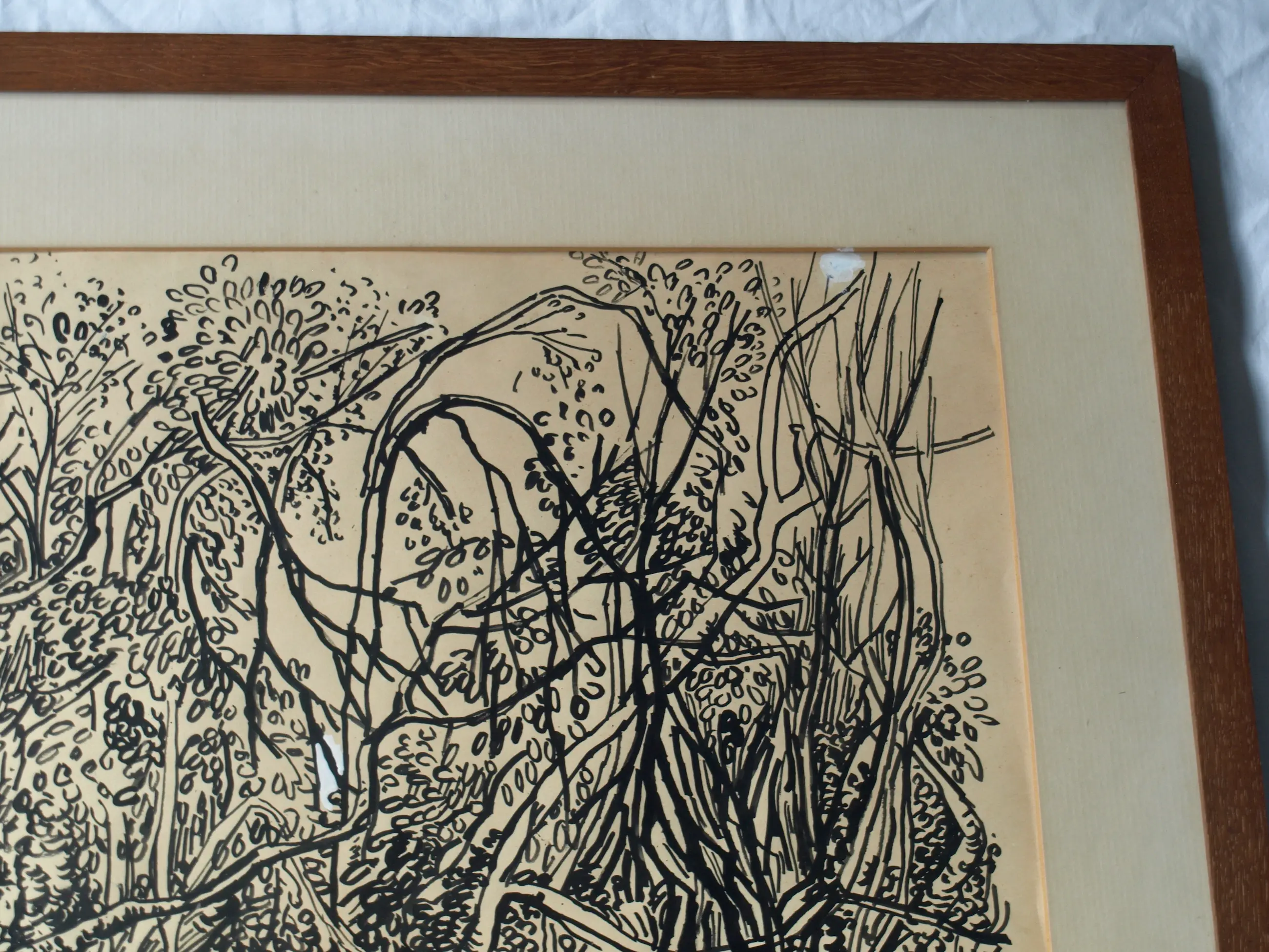 Een grote ingelijste inkttekening uit 1951 van de Nederlandse kunstenaar Jan Meijer (1927-1995) met een voorstelling van een bos bij ? in Frankrijk. Titel op de achterkant van het werk is moeilijk leesbaar (zie de laatste foto’s). -Gesigneerd en gedateerd rechtsonder in het werk en ook met jaartal en titel op de achterkant van de lijst. -Ingelijst in de originele houten lijst met passe-partout en glasplaat. -Afmetingen: Lijst, 68 x 81½ x 1 cm. Beeld, 48 x 63½ cm. -Herkomst: Uit een inboedel met meerdere werken van deze kunstenaar. -Conditie: In goede staat. Het papier van de tekening en het passe-partout zijn wat vergeeld. Ook zijn er correcties met witte vloeistof aangebracht. De lijst heeft slijtplekjes. Zie ook alle foto’s voor een eigen indruk. Kan zo aan de muur.