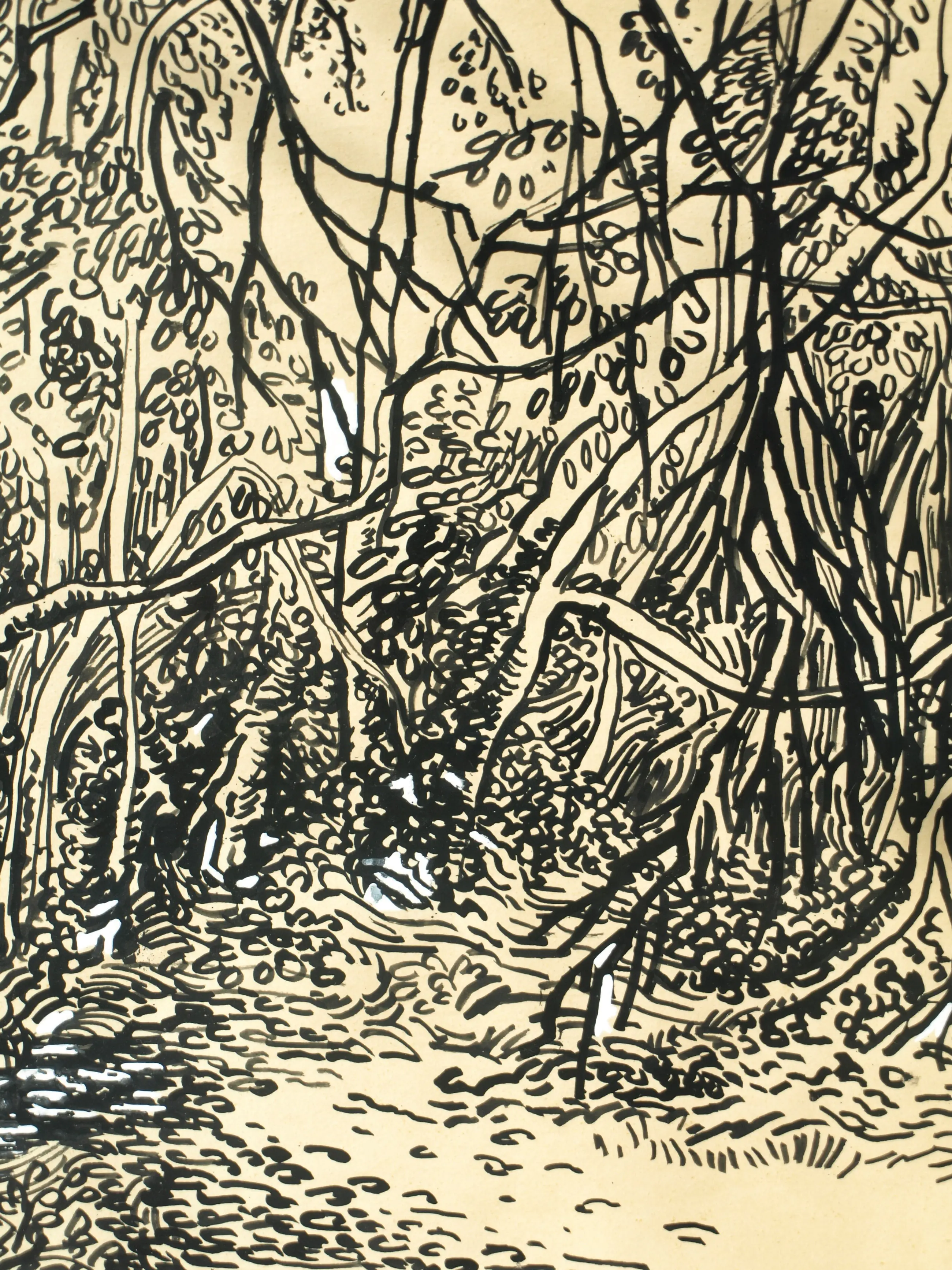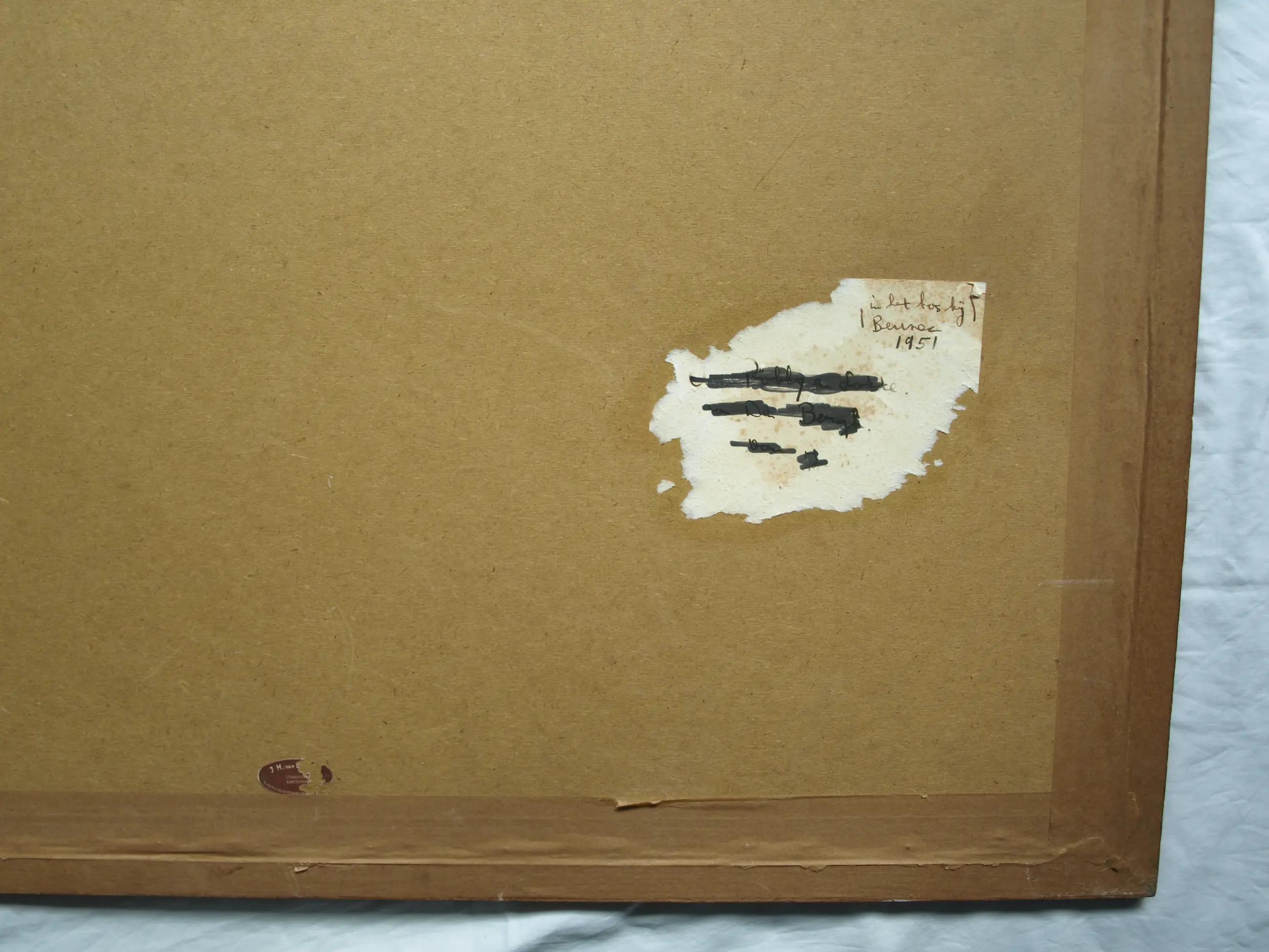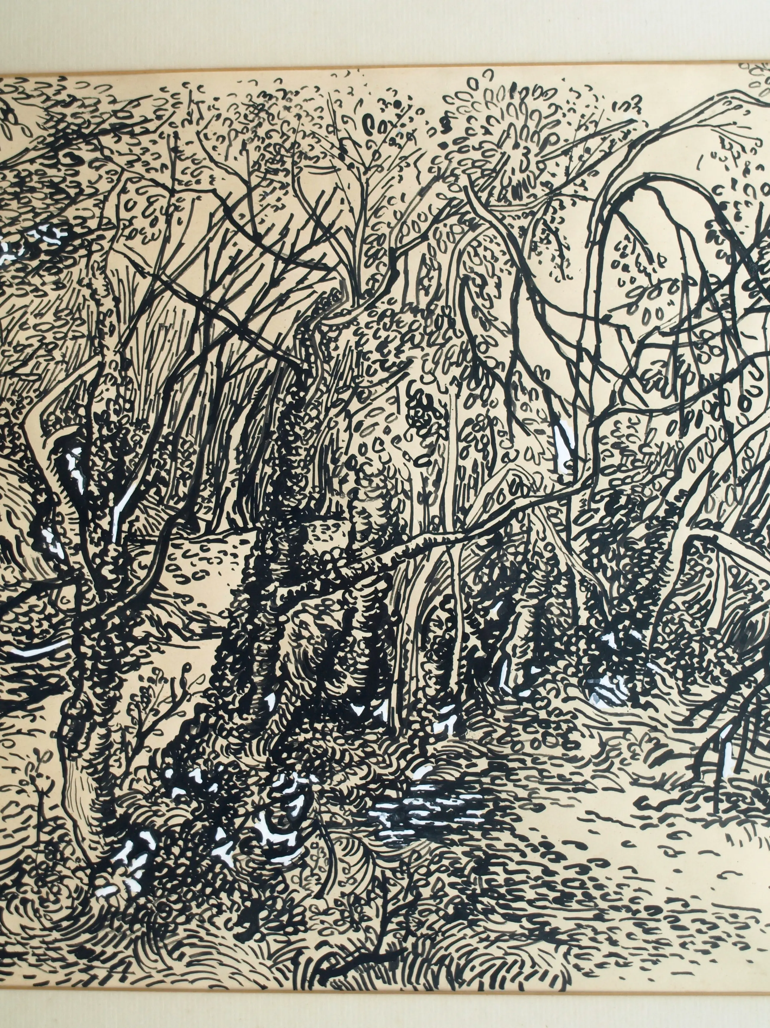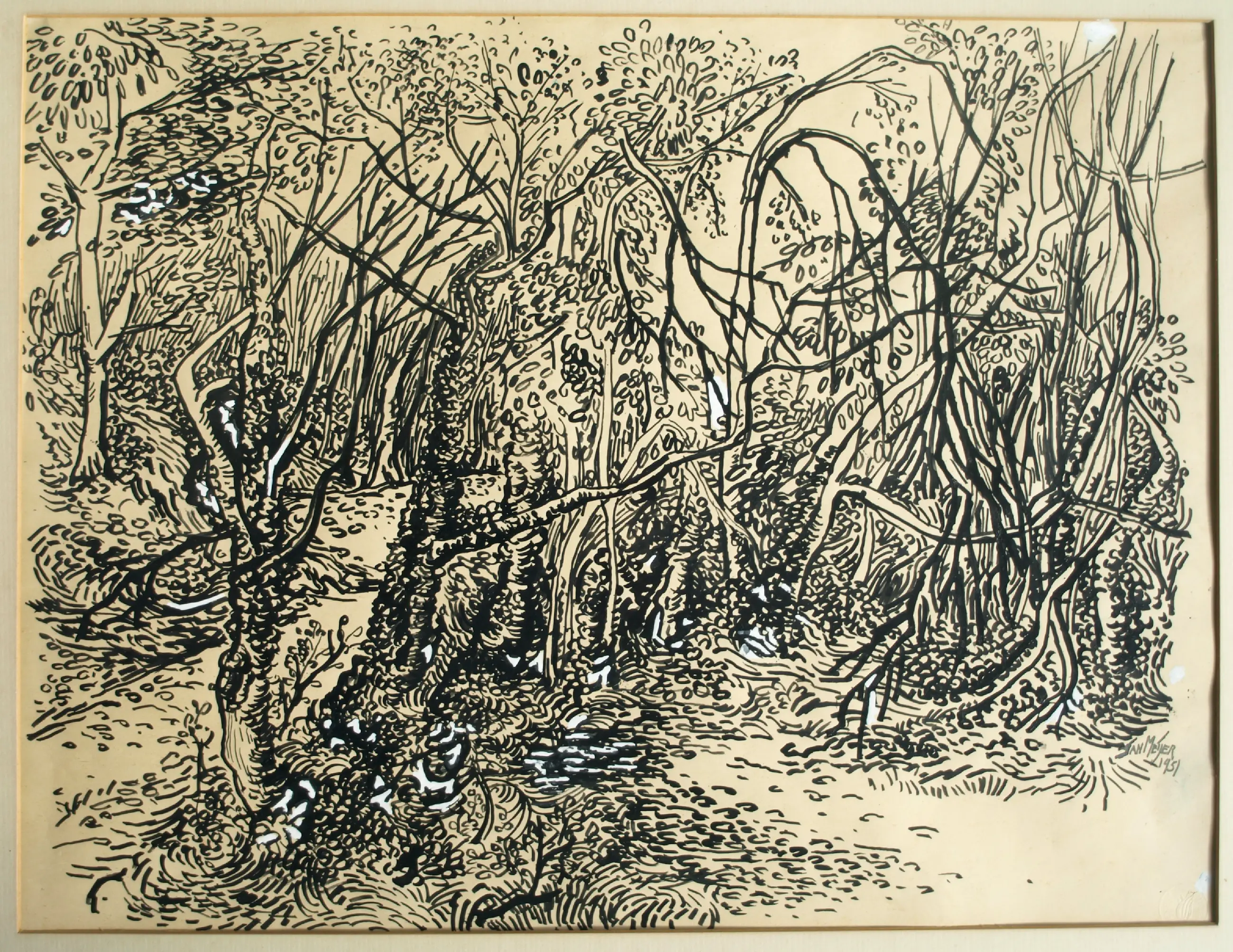 Een grote ingelijste inkttekening uit 1951 van de Nederlandse kunstenaar Jan Meijer (1927-1995) met een voorstelling van een bos bij ? in Frankrijk. Titel op de achterkant van het werk is moeilijk leesbaar (zie de laatste foto’s). -Gesigneerd en gedateerd rechtsonder in het werk en ook met jaartal en titel op de achterkant van de lijst. -Ingelijst in de originele houten lijst met passe-partout en glasplaat. -Afmetingen: Lijst, 68 x 81½ x 1 cm. Beeld, 48 x 63½ cm. -Herkomst: Uit een inboedel met meerdere werken van deze kunstenaar. -Conditie: In goede staat. Het papier van de tekening en het passe-partout zijn wat vergeeld. Ook zijn er correcties met witte vloeistof aangebracht. De lijst heeft slijtplekjes. Zie ook alle foto’s voor een eigen indruk. Kan zo aan de muur.
