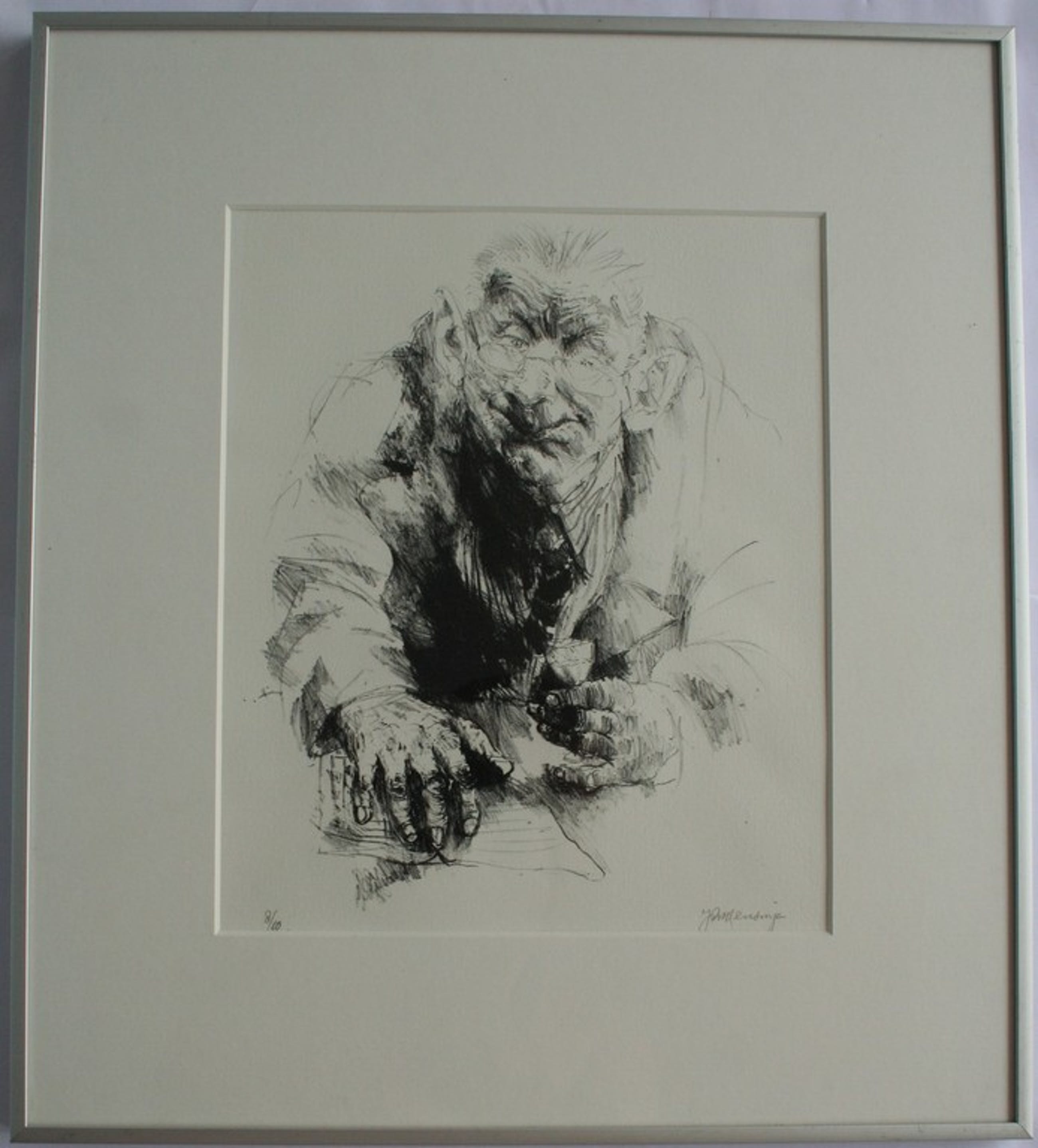 Ingelijst onder glas met een nieuw passe-partout, in een aluminium lijst. In goede conditie. Genummerd 8/10. Gesigneerd.