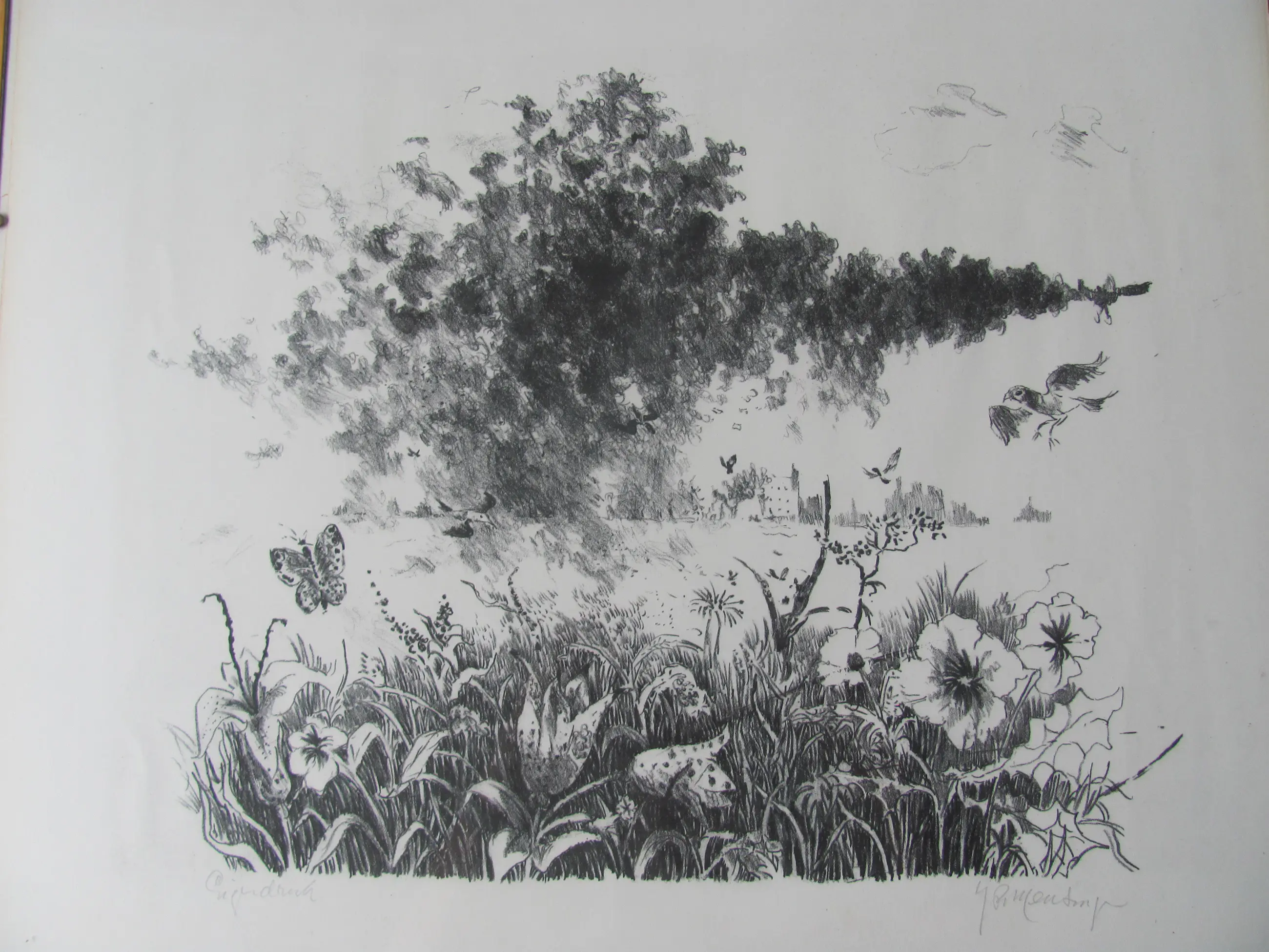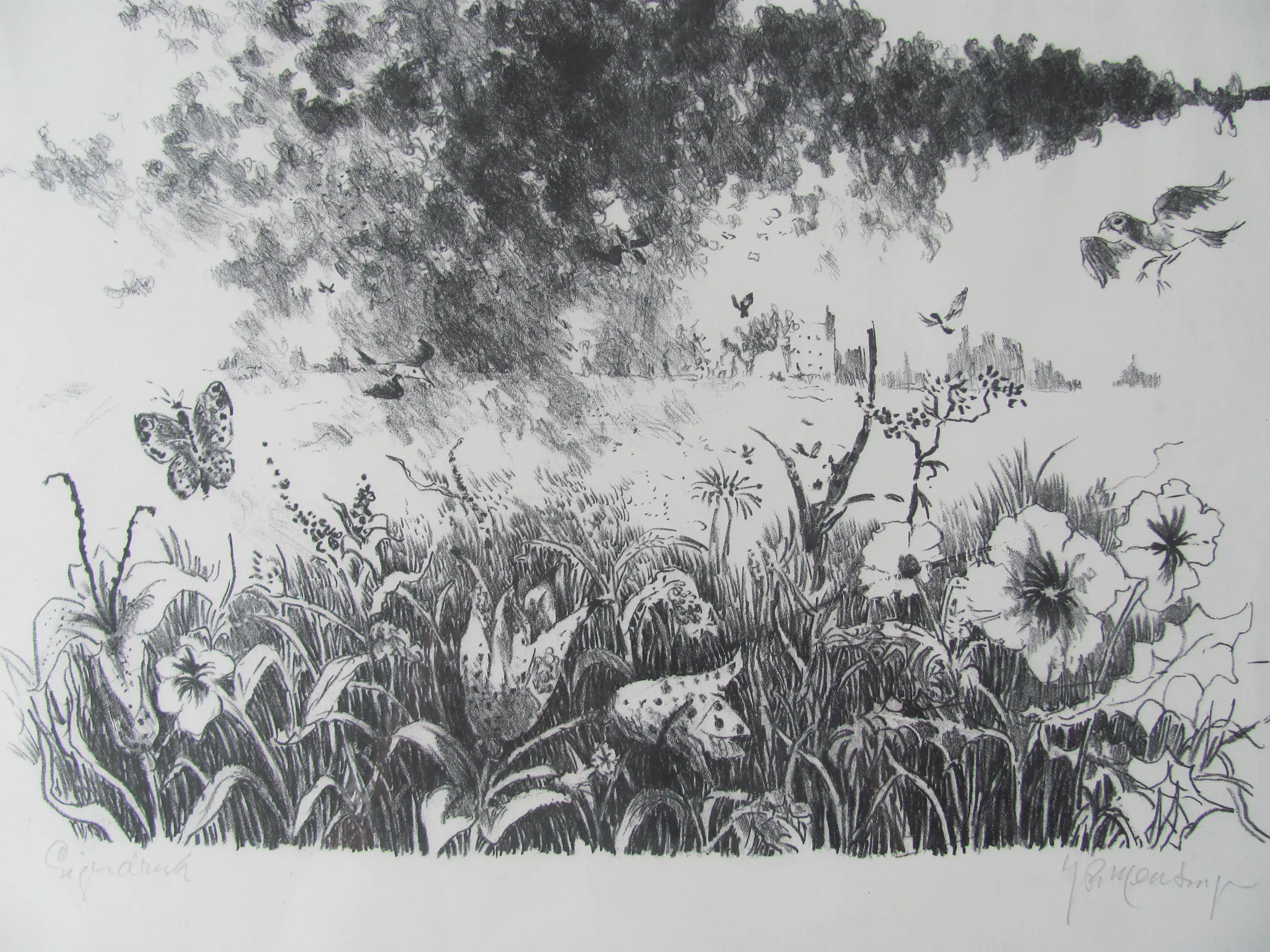 Jan Mensinga - Litho, Compositie met planten, vlinders en vogels