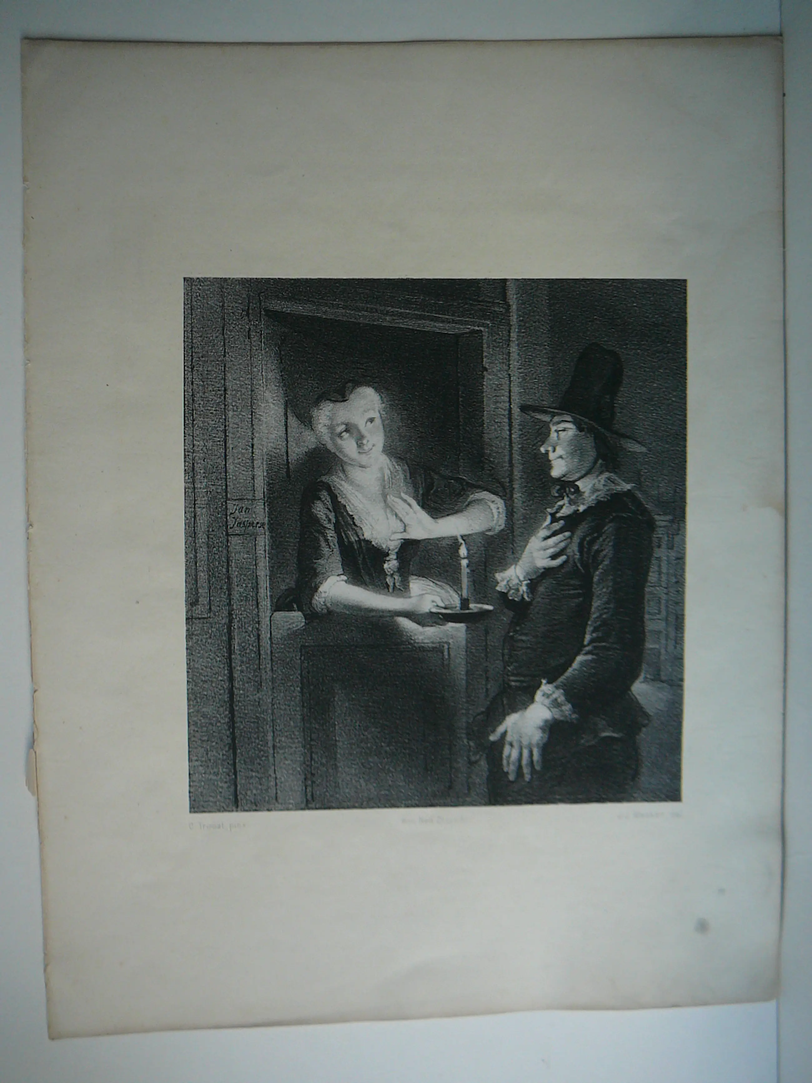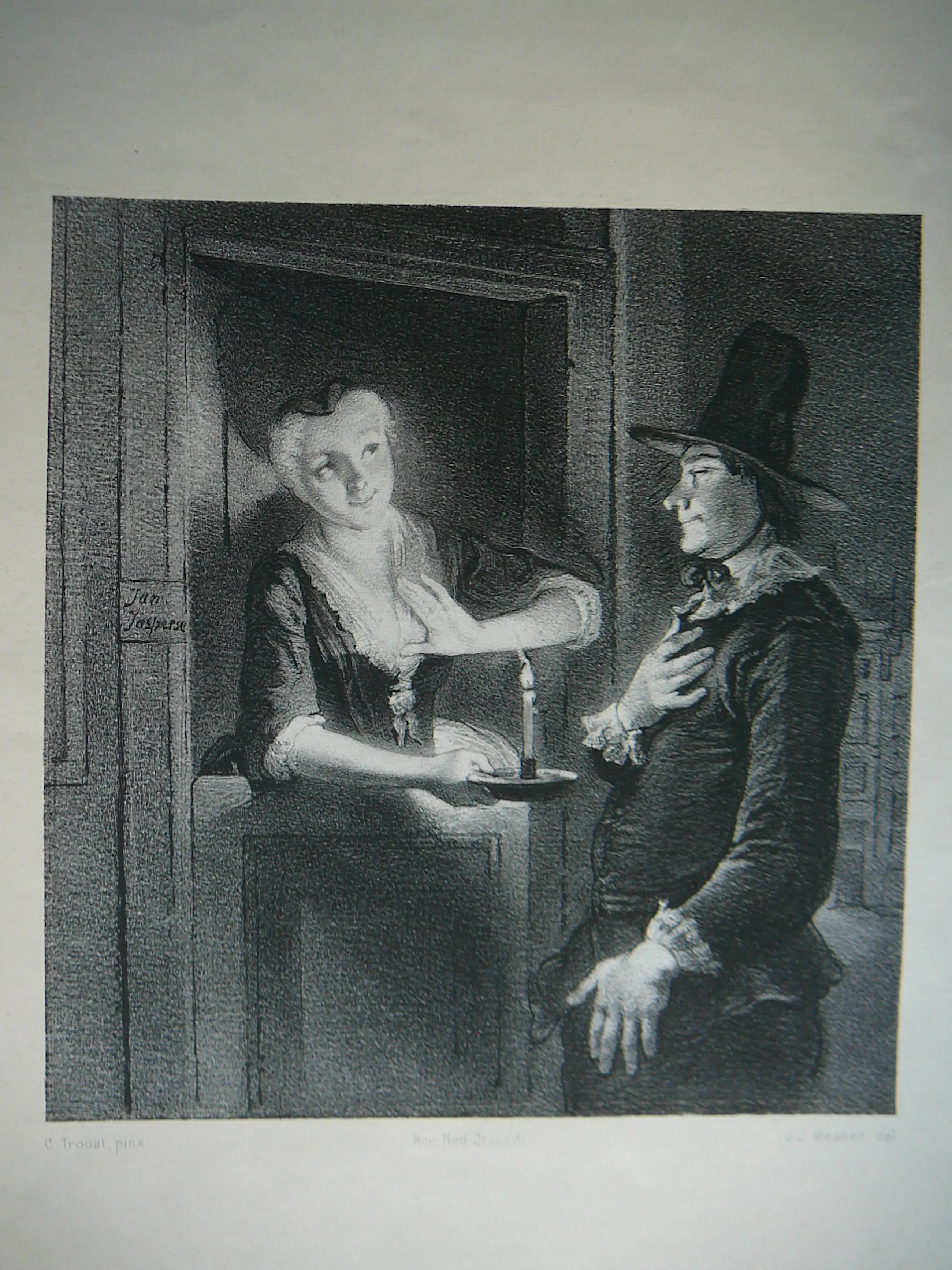 Mooie Litho van een vrouw die man afwijst C Proost Pinx en J.J. Mesker Del gedrukt door de Ned steen Drukkerij