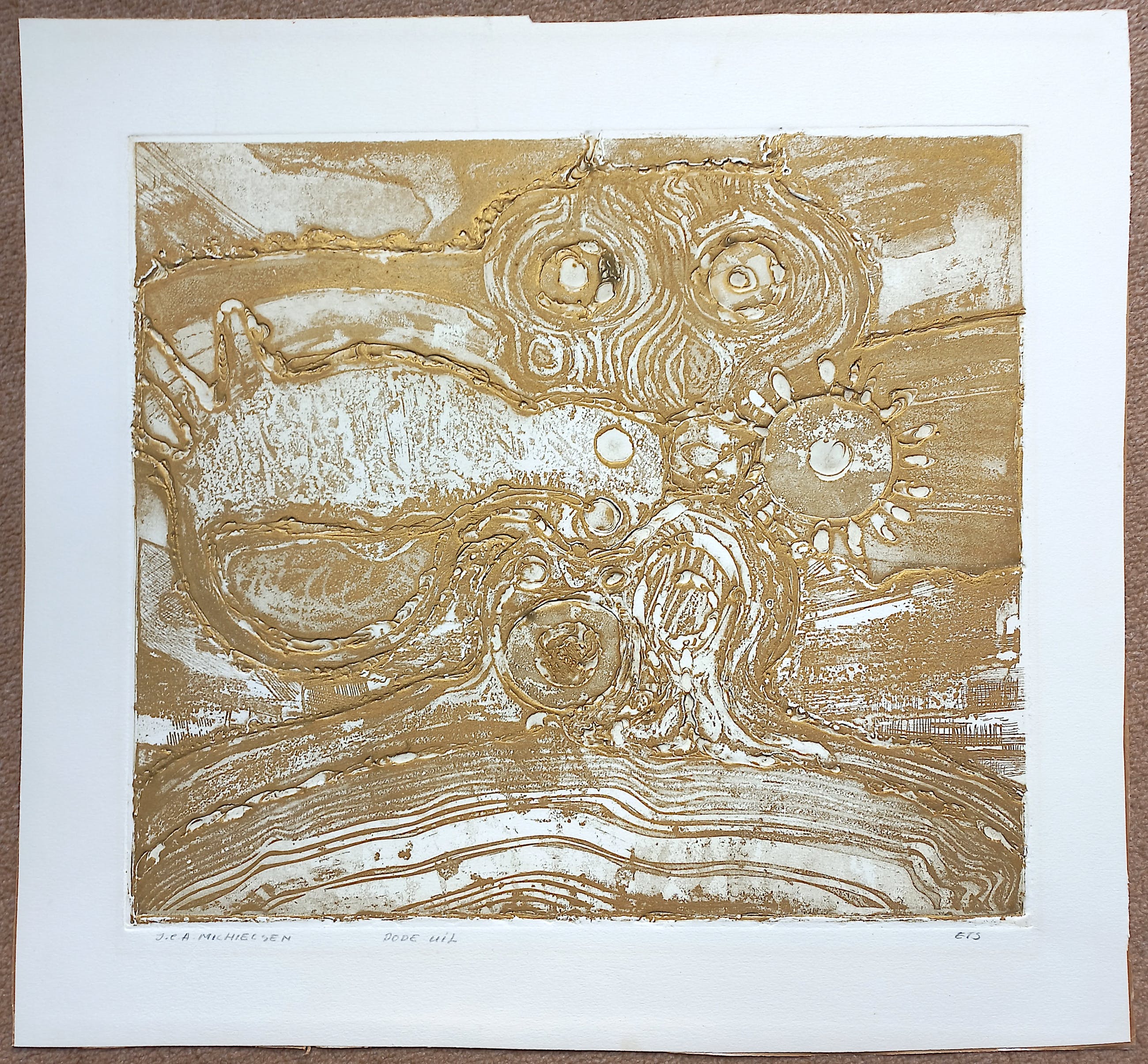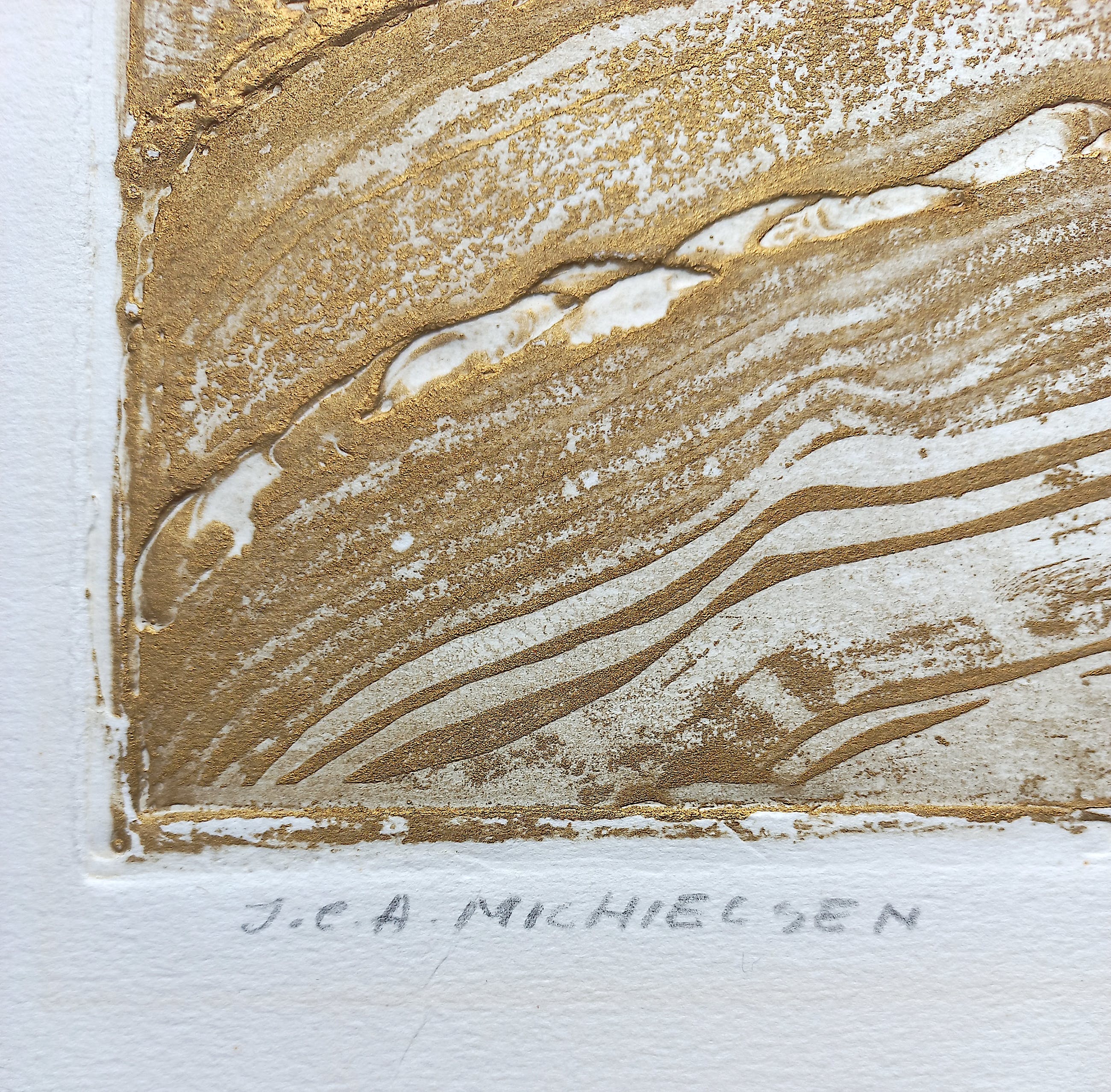Mooi en bijzonder werk van Jan Michielsen. Ets met reliëf op geschept papier, met potlood gesigneerd en getiteld. Afkomstig uit de kunstcollectie van ABNAMRO, in goede conditie.