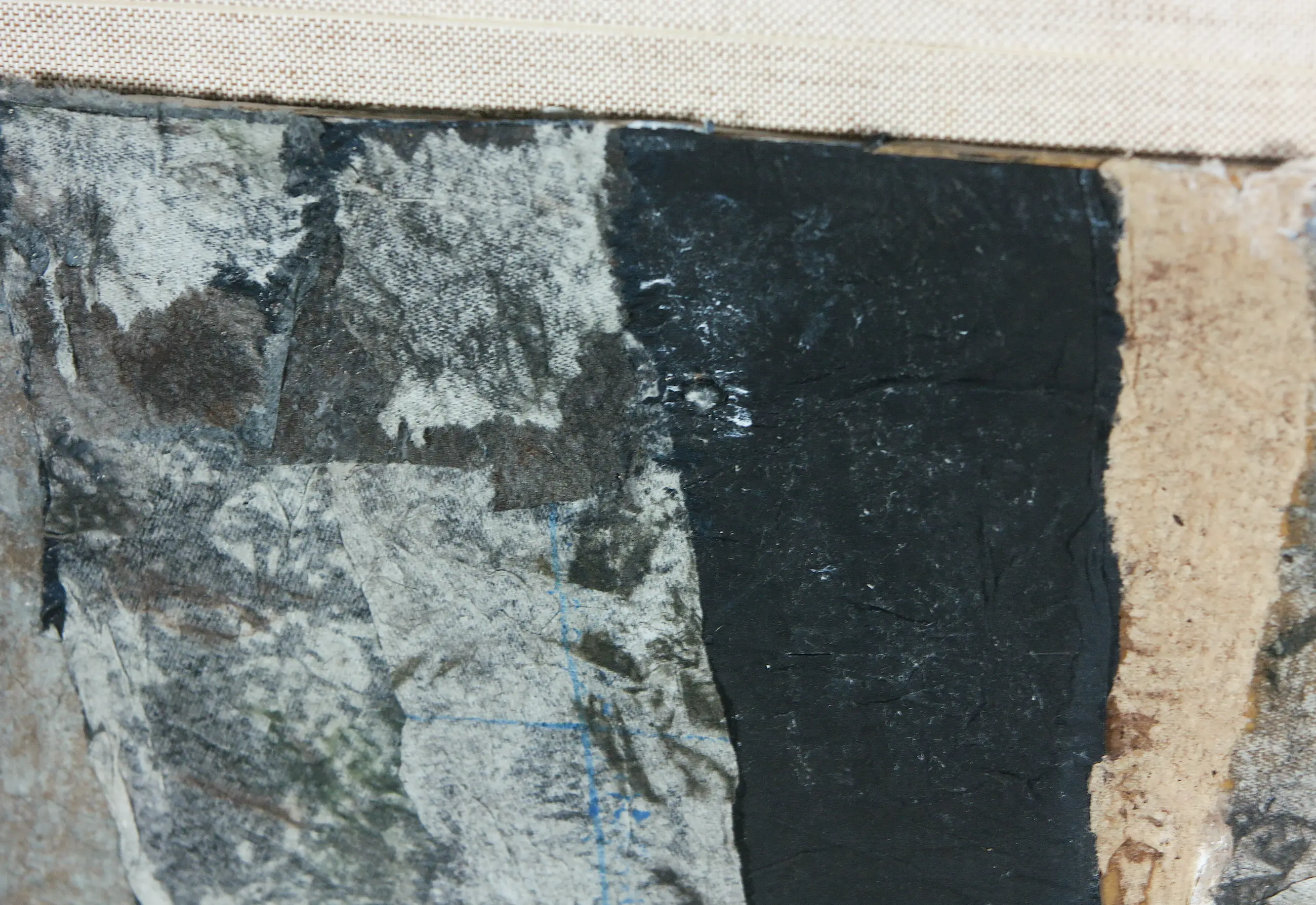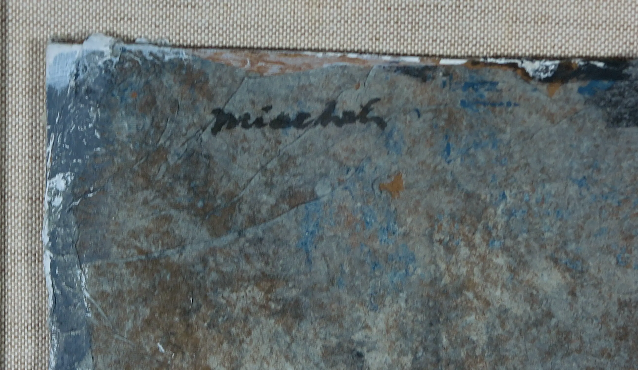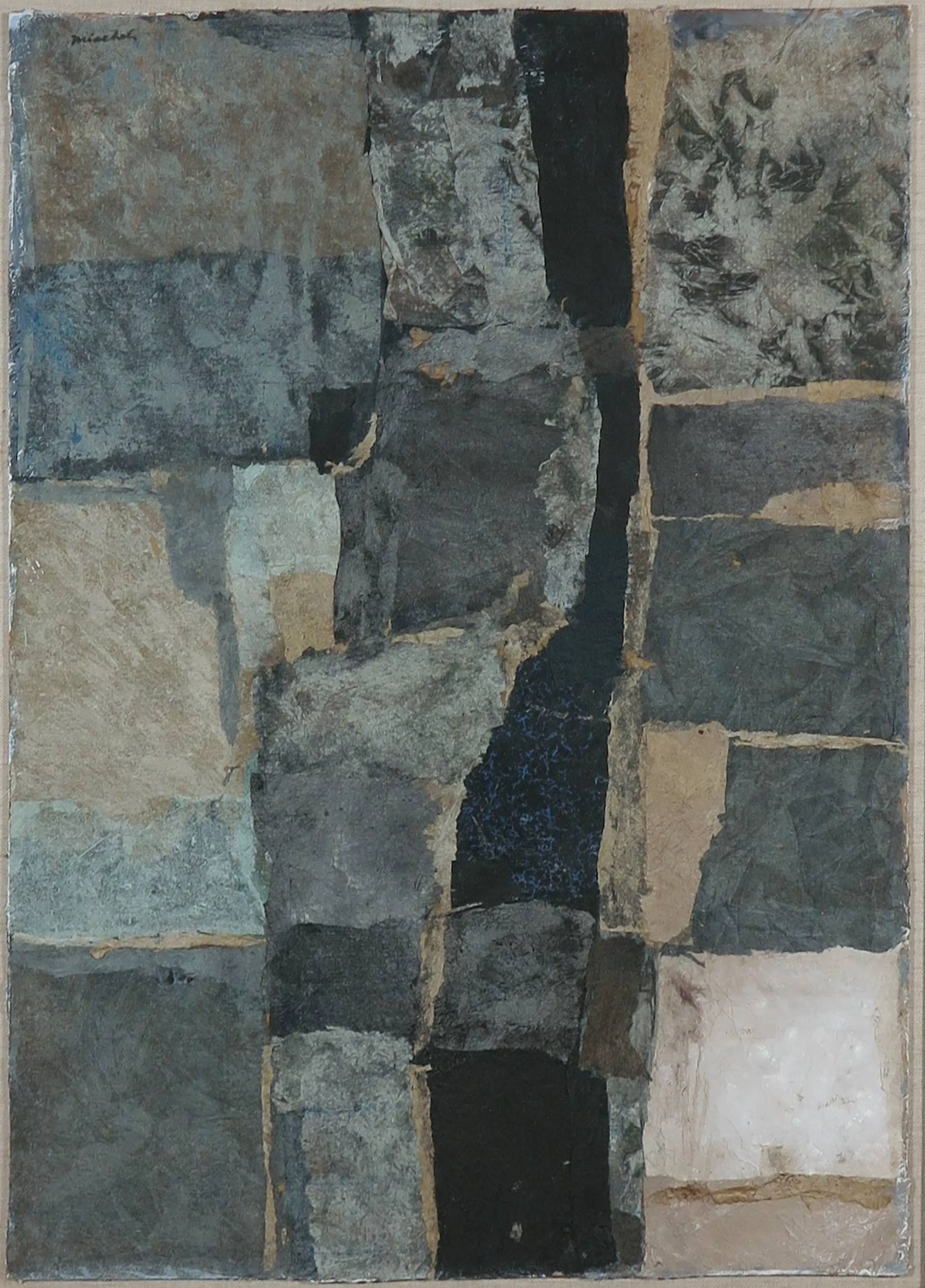 Groot ingelijst werk (collage van verschillende stukken beschilderd vloeipapier) van Jan Miechels.