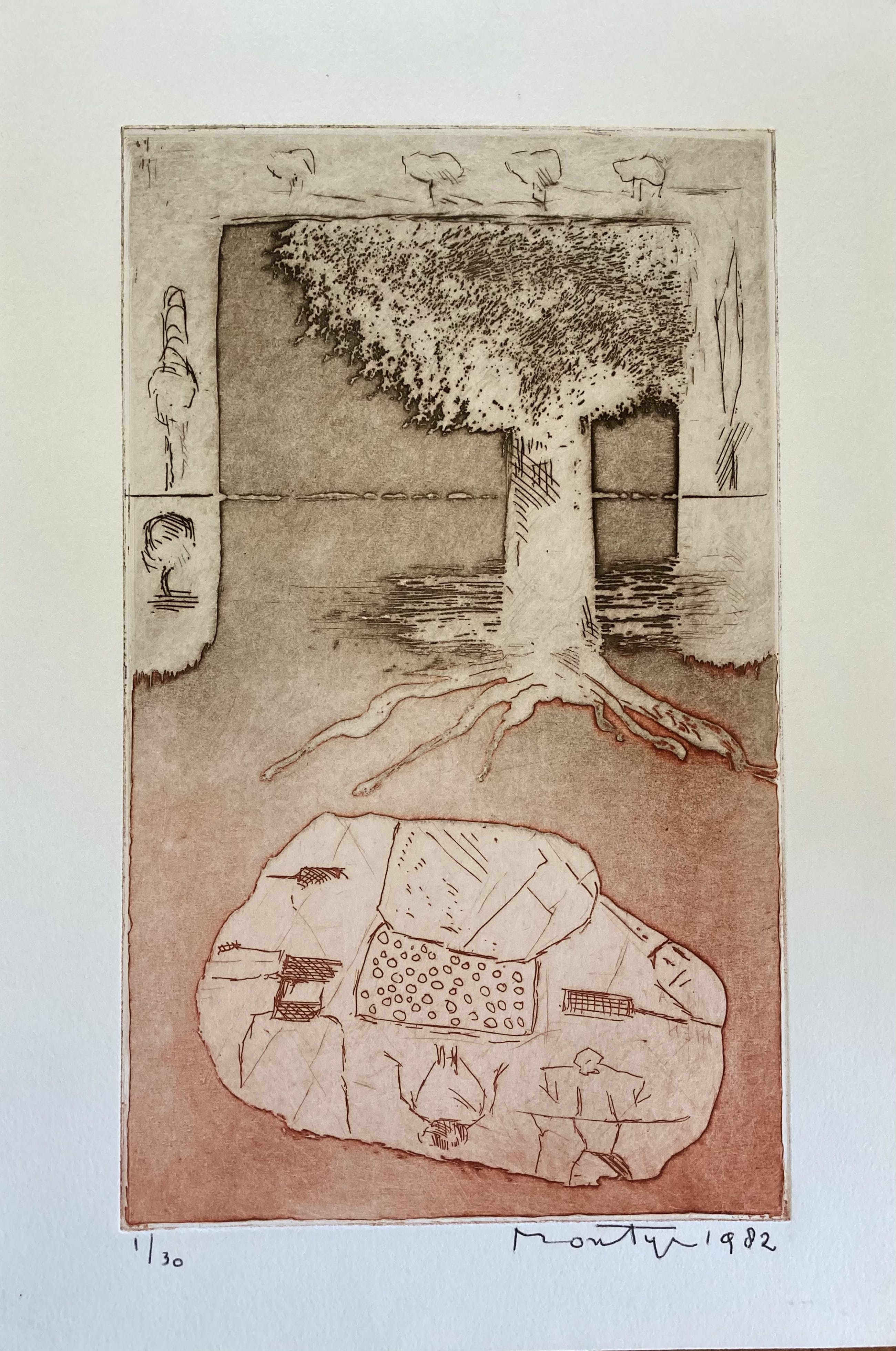 2 erg bijzondere kleuren etsen van Montyn, allebei uit 1982. 3/6 50 bij 32 cm 1/30 43 bij 29 cm