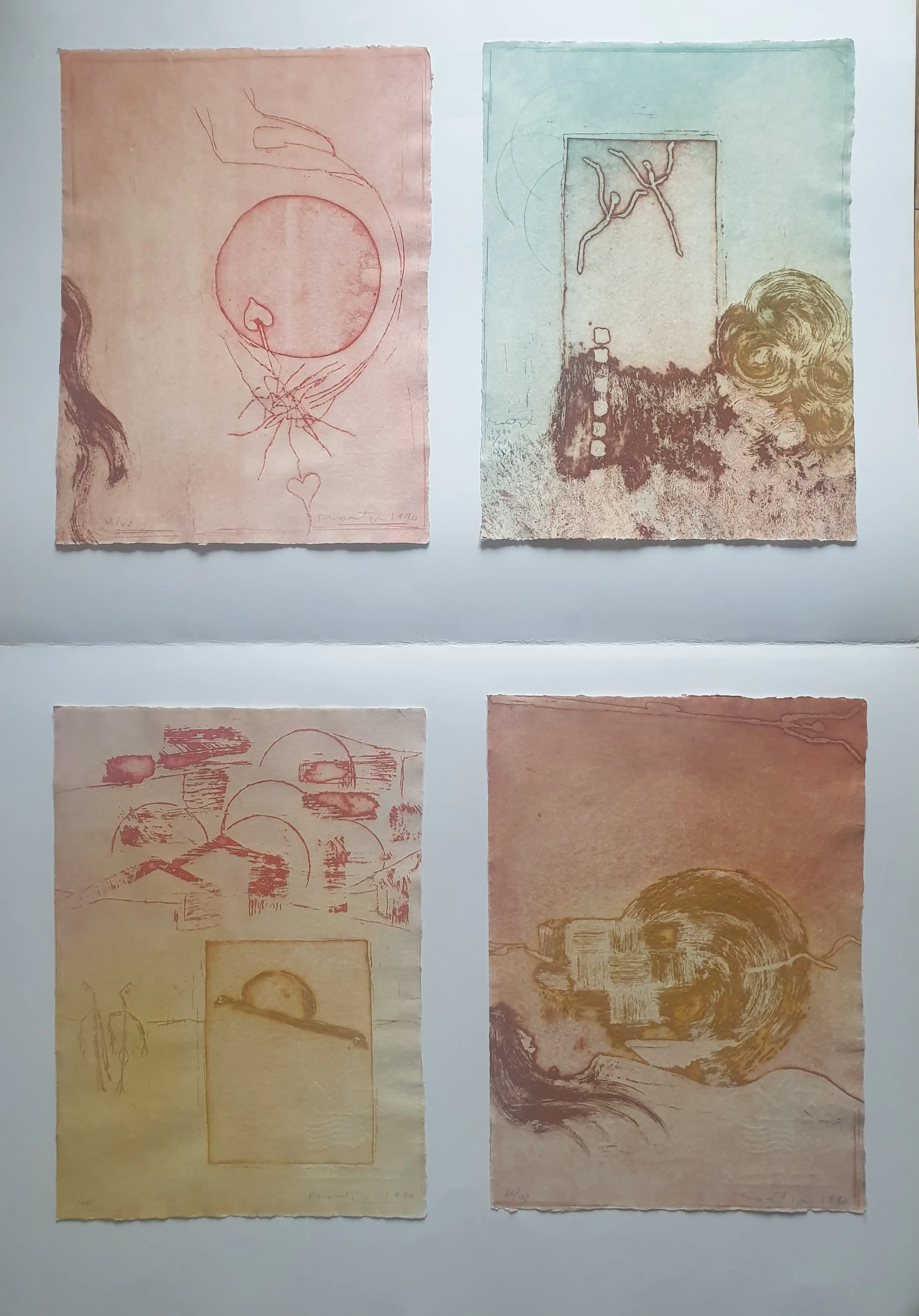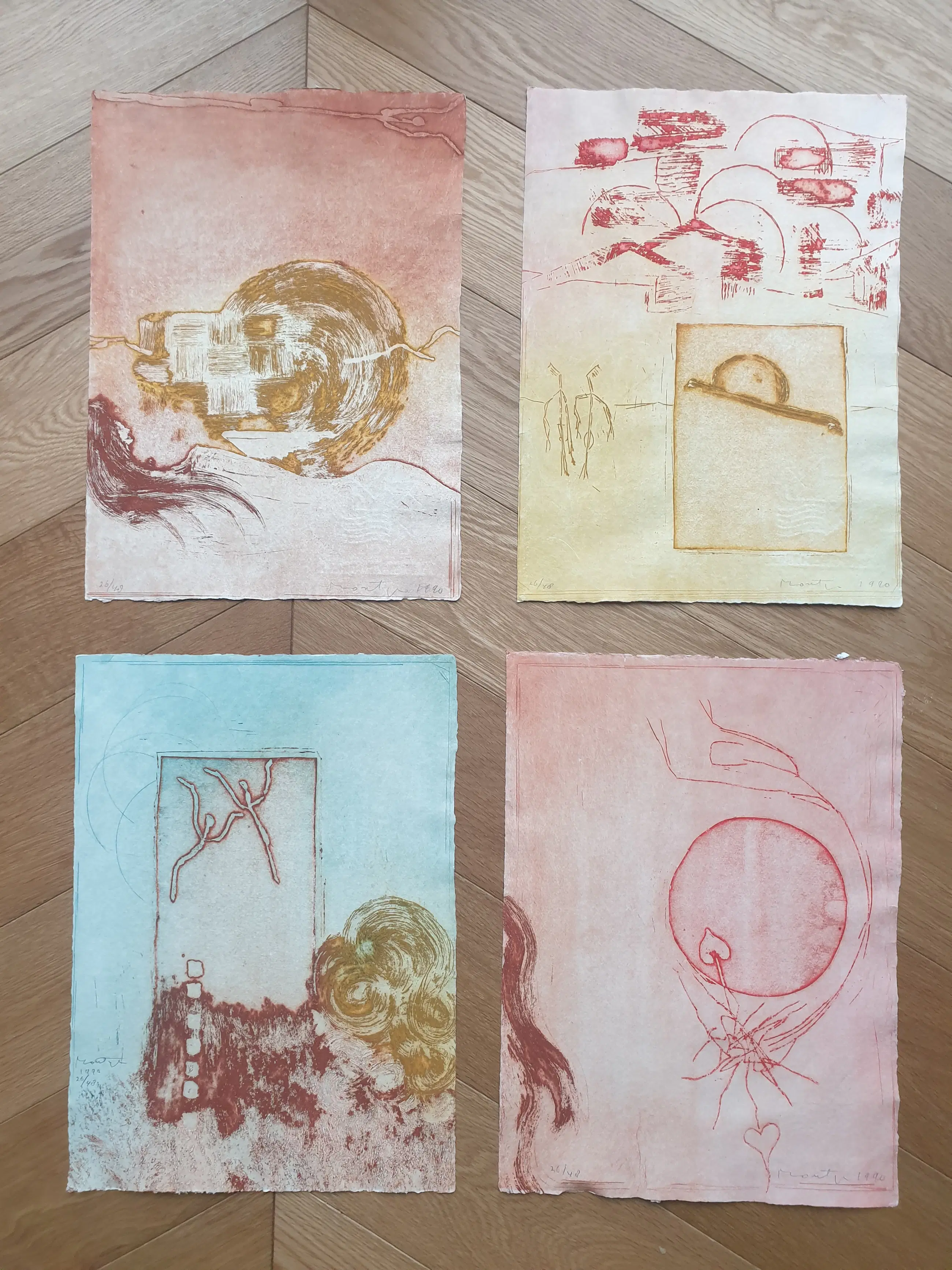 4 Kleurige ets/ aquatinten van Jan Montijn uit 1990. De werken op geschept papier verkeren in zeer goede staat. Nummering 26/48. Formaat 38,5 x 28 cm. Titel: "Gezichten van de Zon": 1. Gouden Woorden, 2. Gevangen in liefde zijn we blind, 3. Terwijl hij zijn schoenveters strikt, 4. Je kunt me weren als de wind. De etsen waren gekoppeld aan gedichten van Marion Bloem Wordt aangetekend verstuurd.
