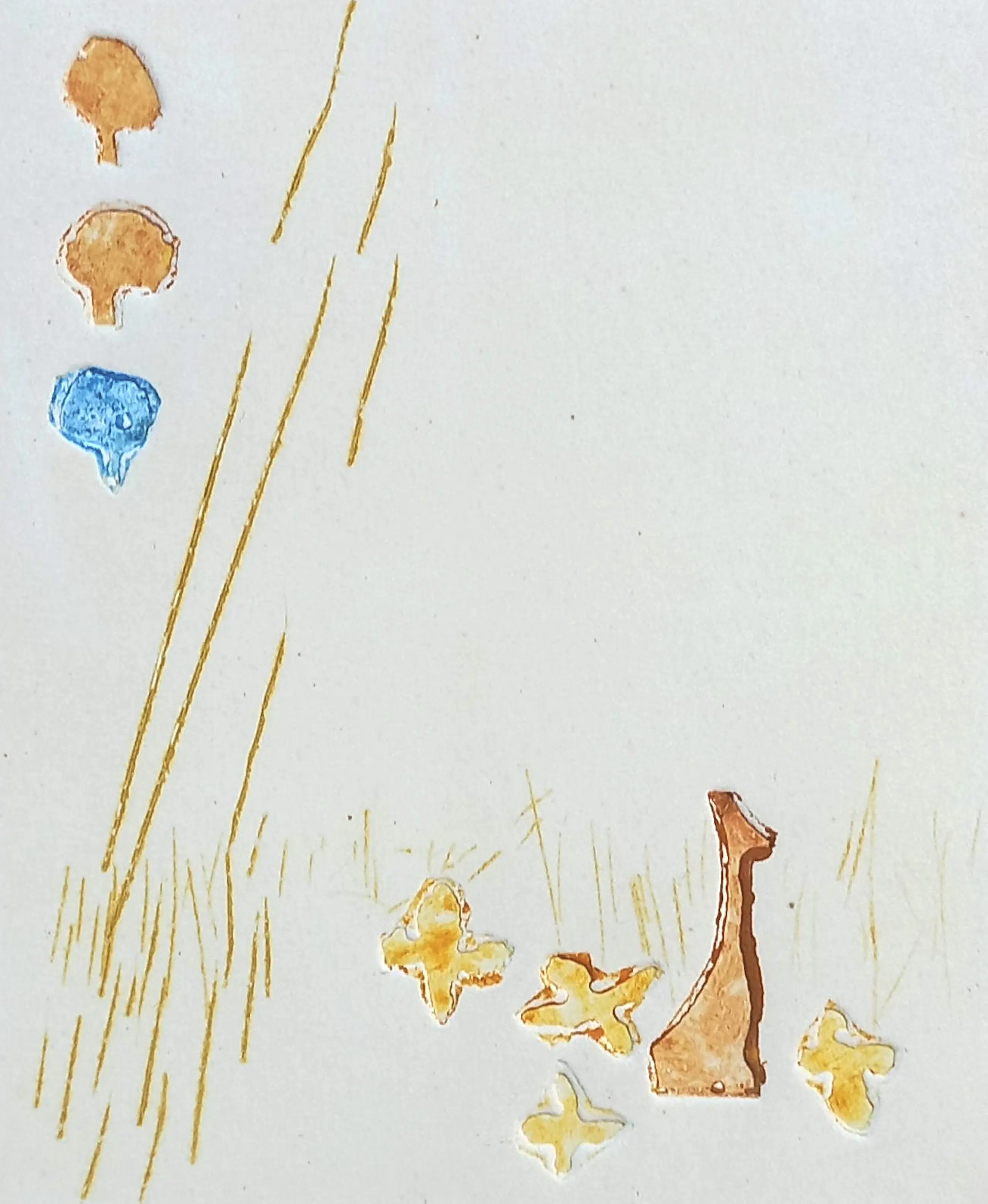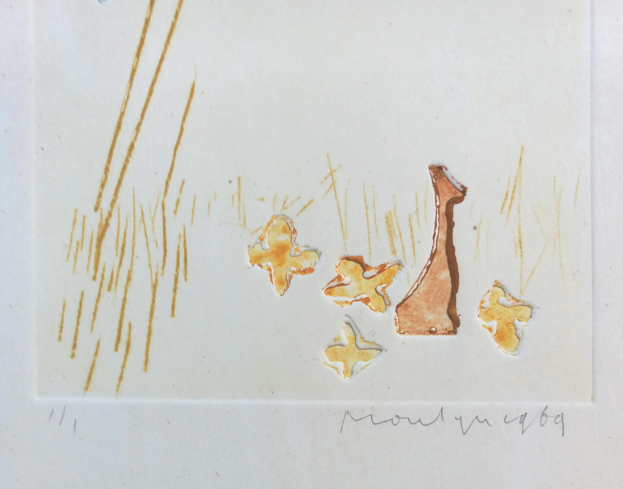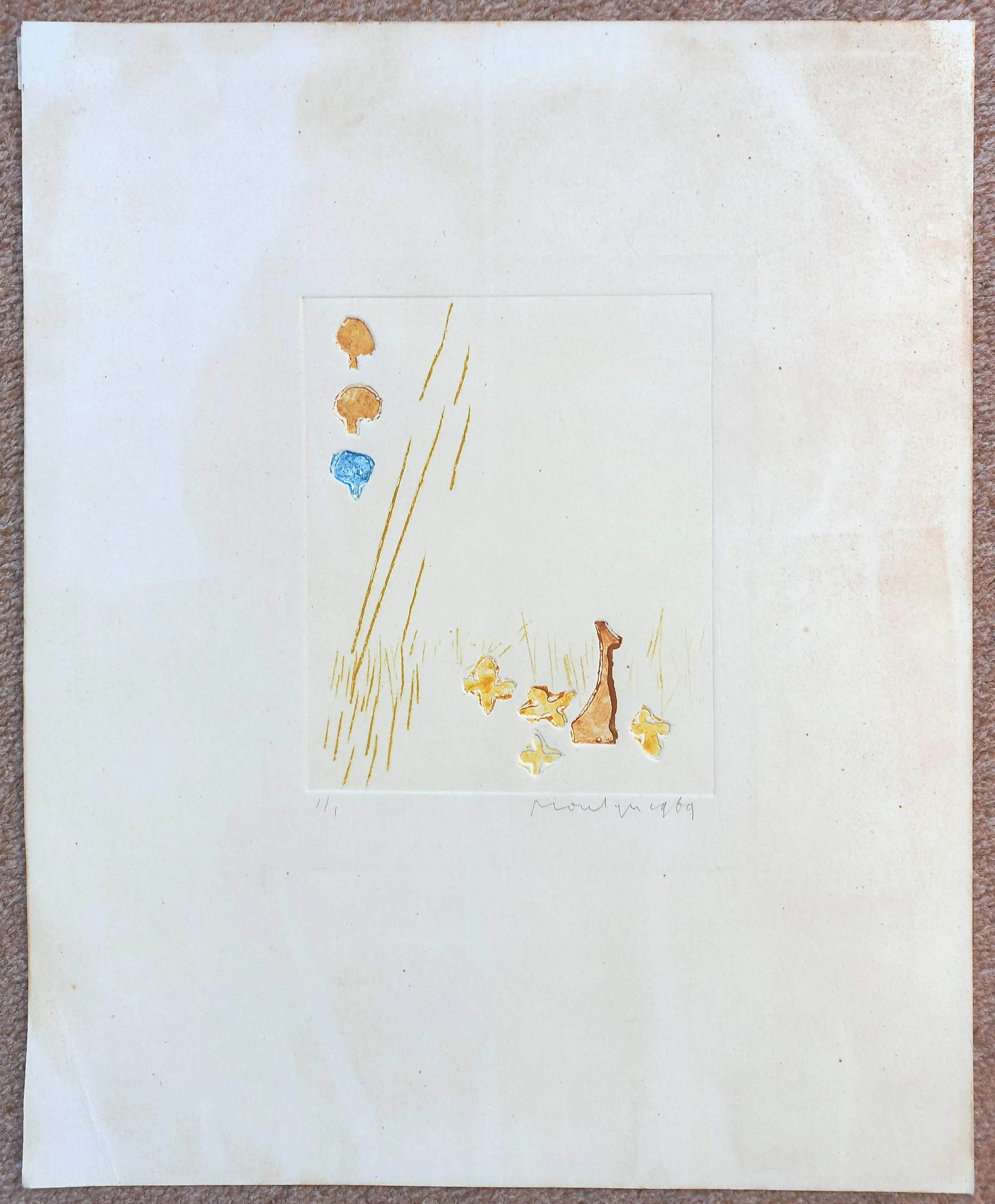 Karakteristiek, en uniek, werk van Jan Montyn uit 1966 dat niet te vinden is op janmontyncollection.com. Handgekleurde ets met reliëf op/in geschept papier, met potlood gesigneerd, gedateerd en genummerd (1/1) en achterop getiteld door Montyn zelf. In redelijke conditie. Herkomst: Kunst-Kollektie Oostzaan, Geert H. van de Zee.