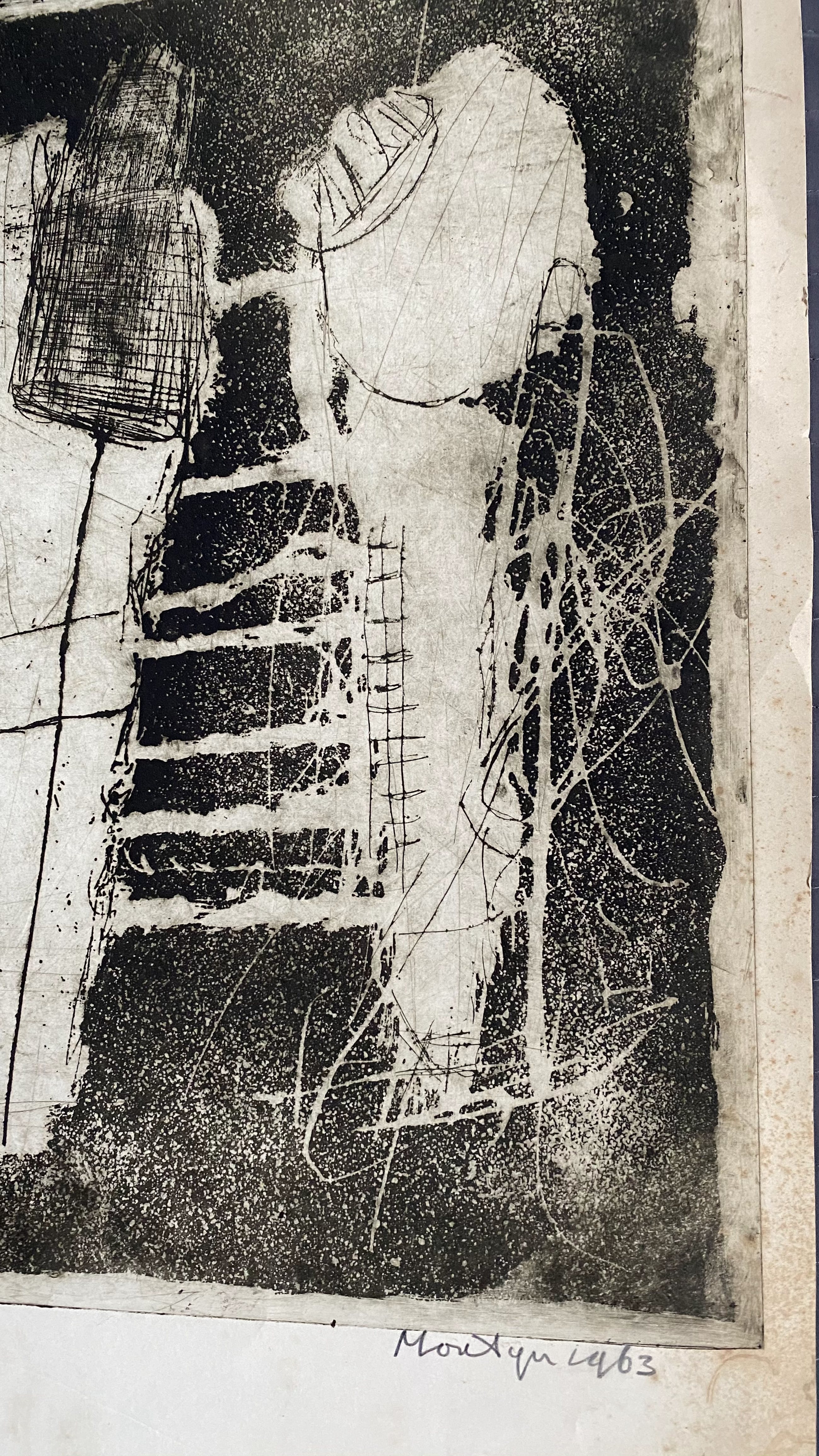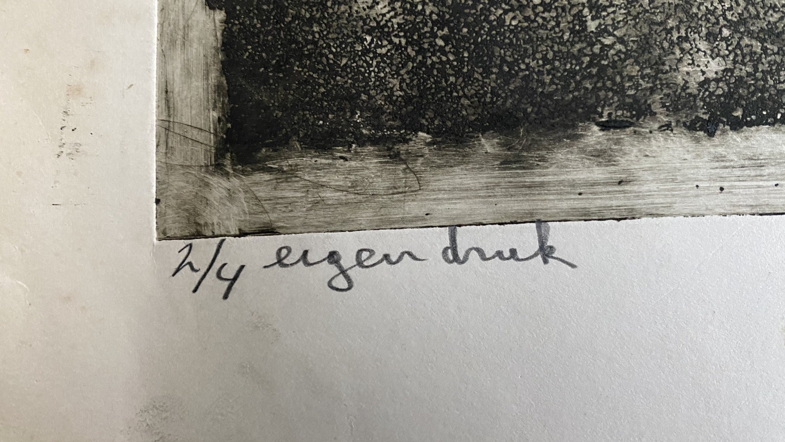 Indrukwekkende ets van Jan Montyn uit nalatenschap verkregen. Titel: Bezit van het dier. Oplage 2/4 eigen druk 1963. De ets is gedrukt op dik papier. Op de rand zitten ouderdomsvlekken. Ook op de ets rechts zitten ouderdomsvlekken, zie foto's. Afmeting ets: 80 cm breed, 40 cm hoog. Door de grootte en de kleine oplage een interessant werk. Voor de liefhebber.