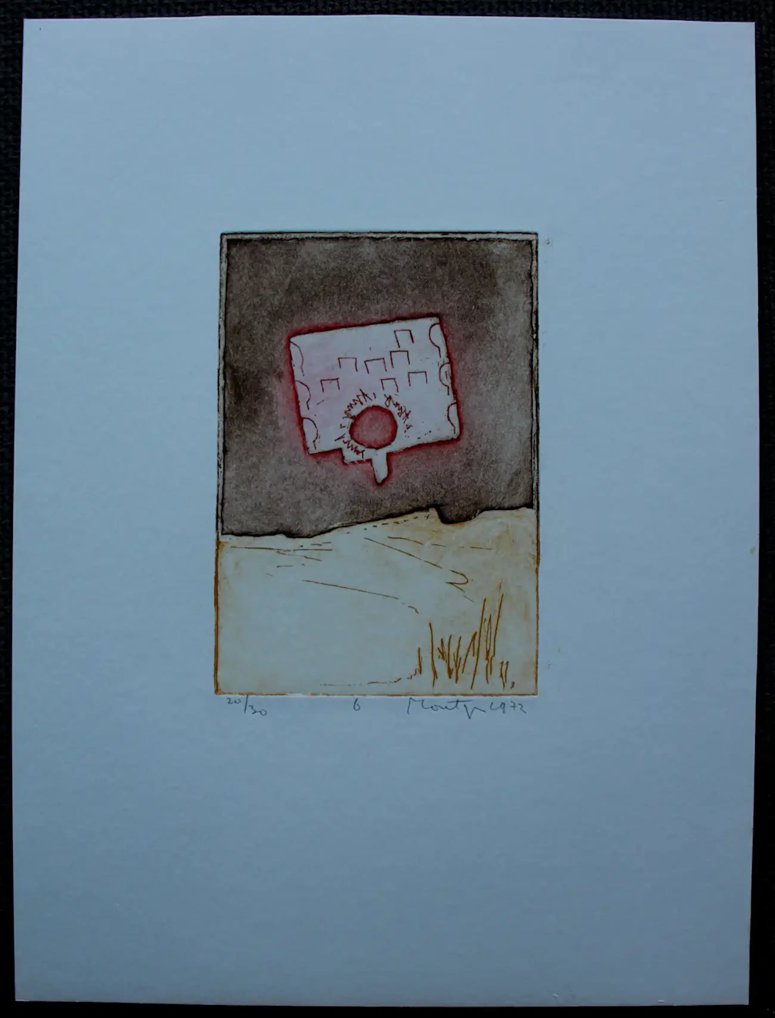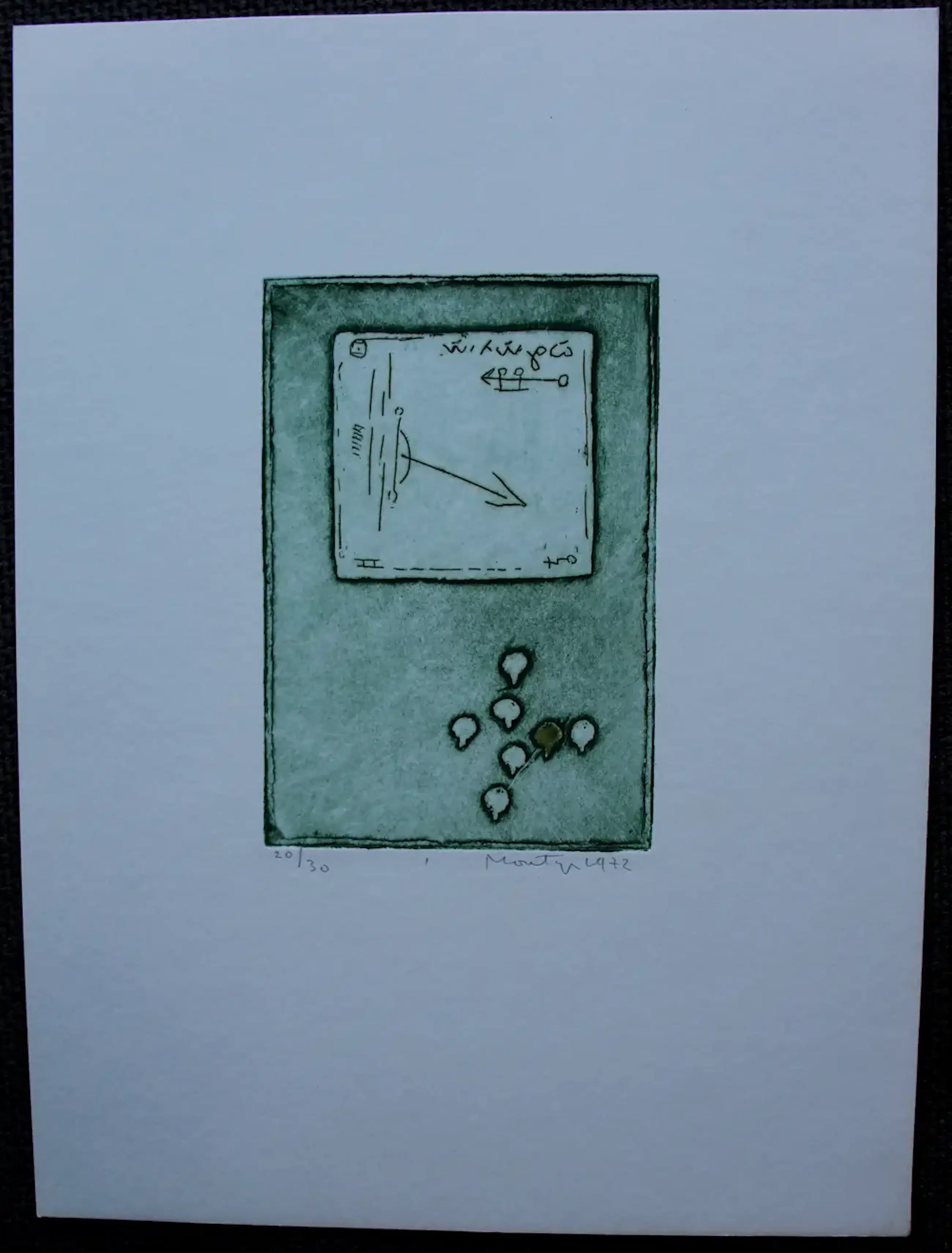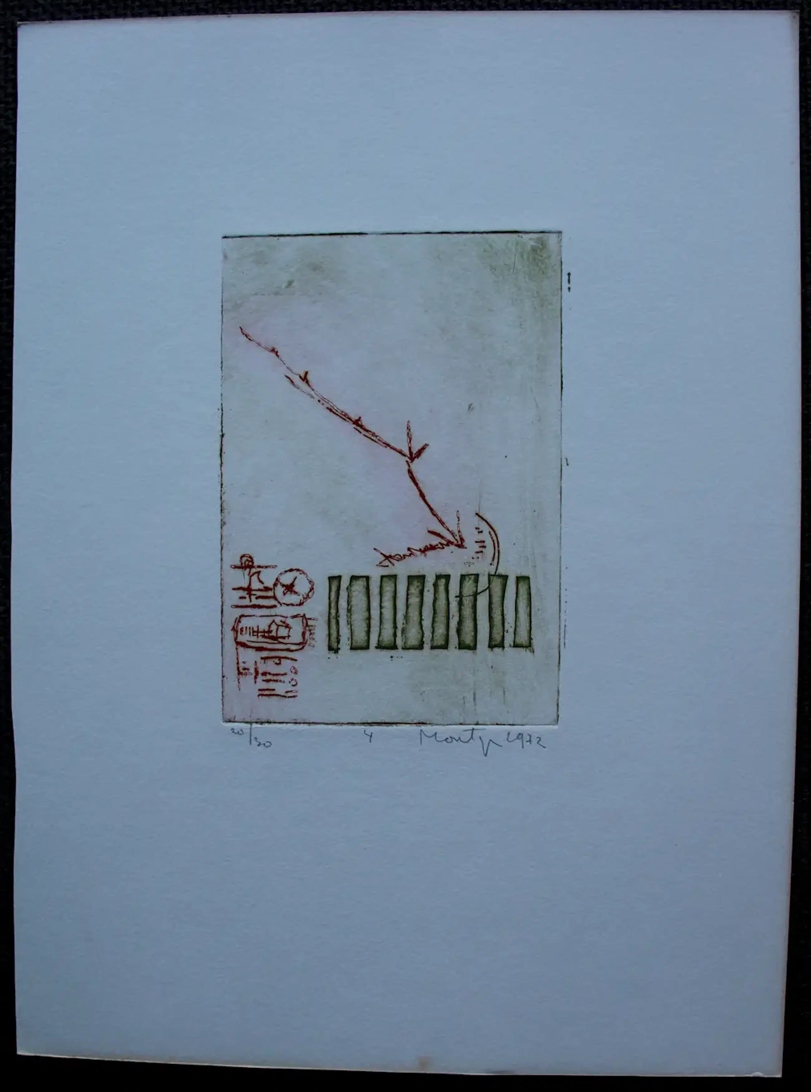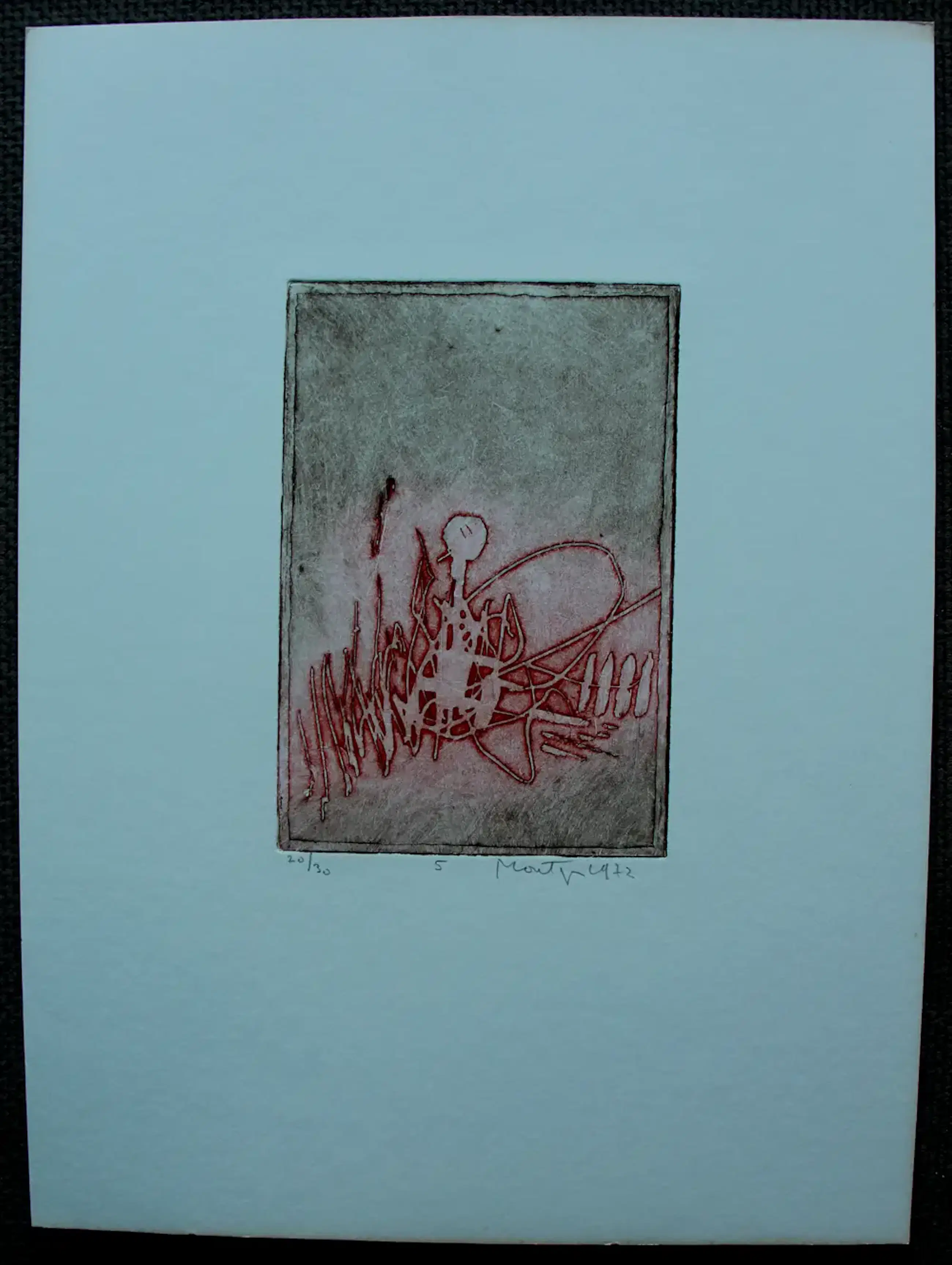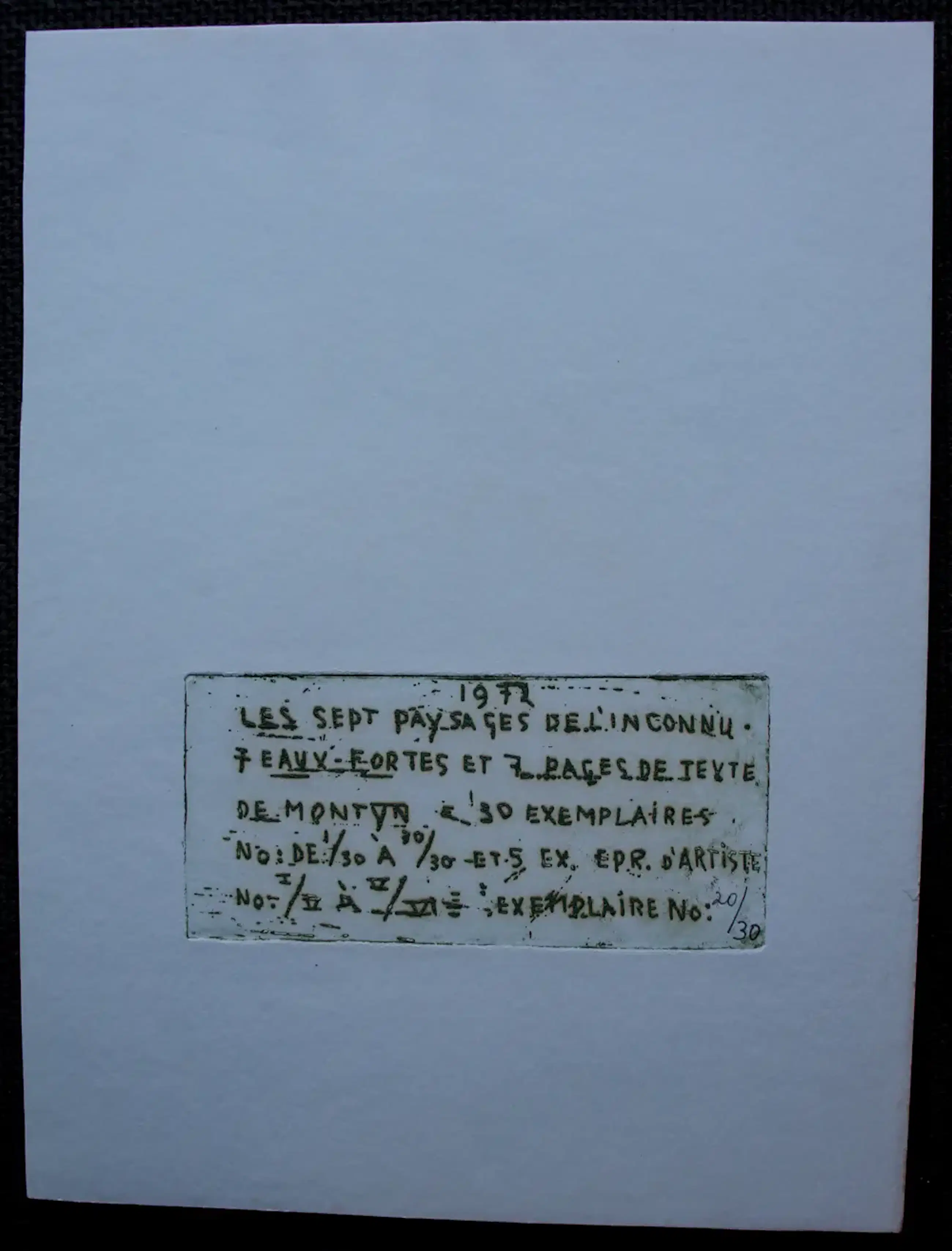 Boek met 10 etsen, en enkele gedichten, van Jan Montyn. Titel: Les sept paysages de l'inconnue. Jaar: 1972. Oplage: 20/30. Afmetingen boek: H45 x b33.5cm. De werken zijn, met potlood, gesigneerd door de kunstenaar. De authenticiteit van de aangeboden werken, wordt volledig gegarandeerd. Een certificaat van echtheid kan, op aanvraag, worden gemaild.