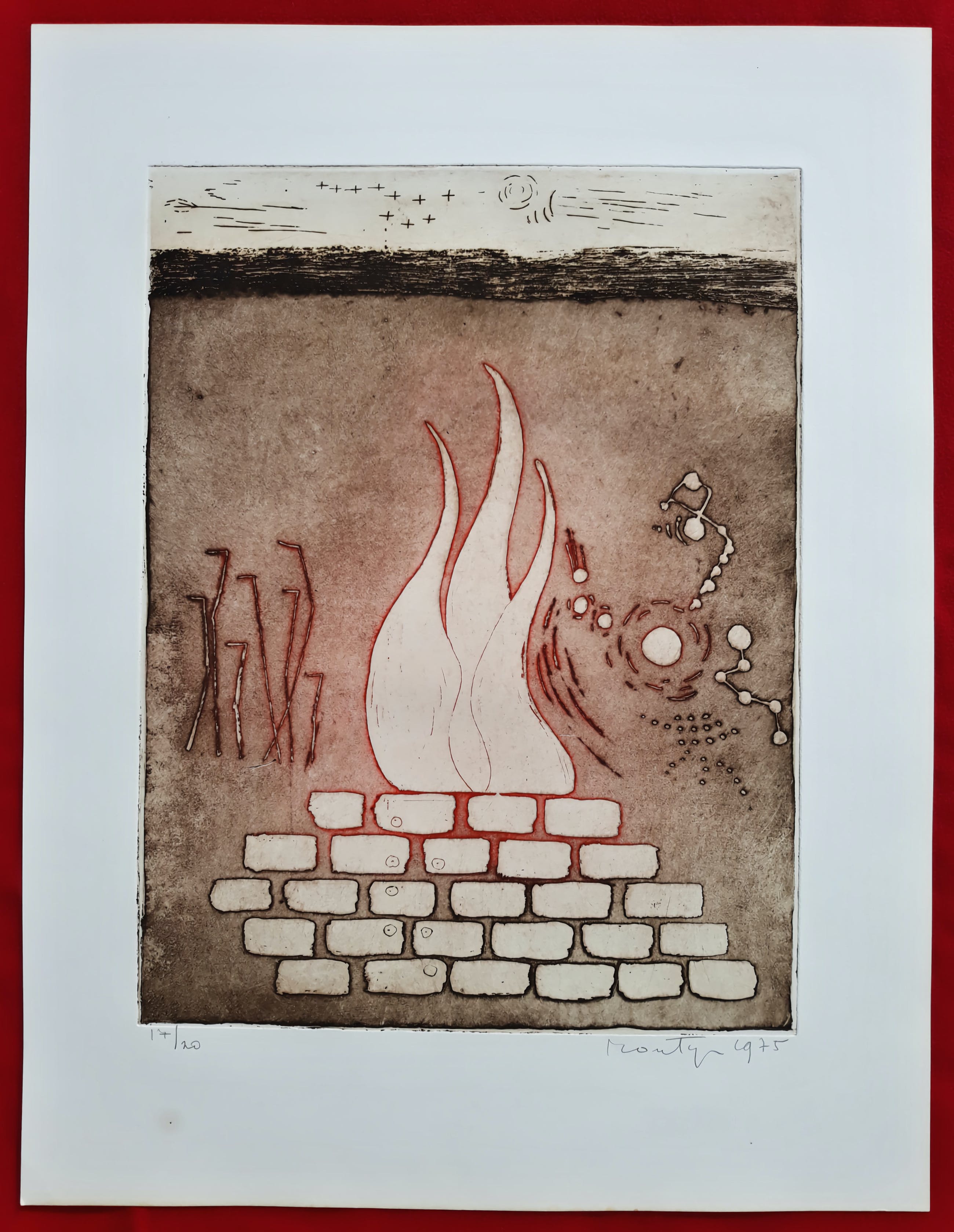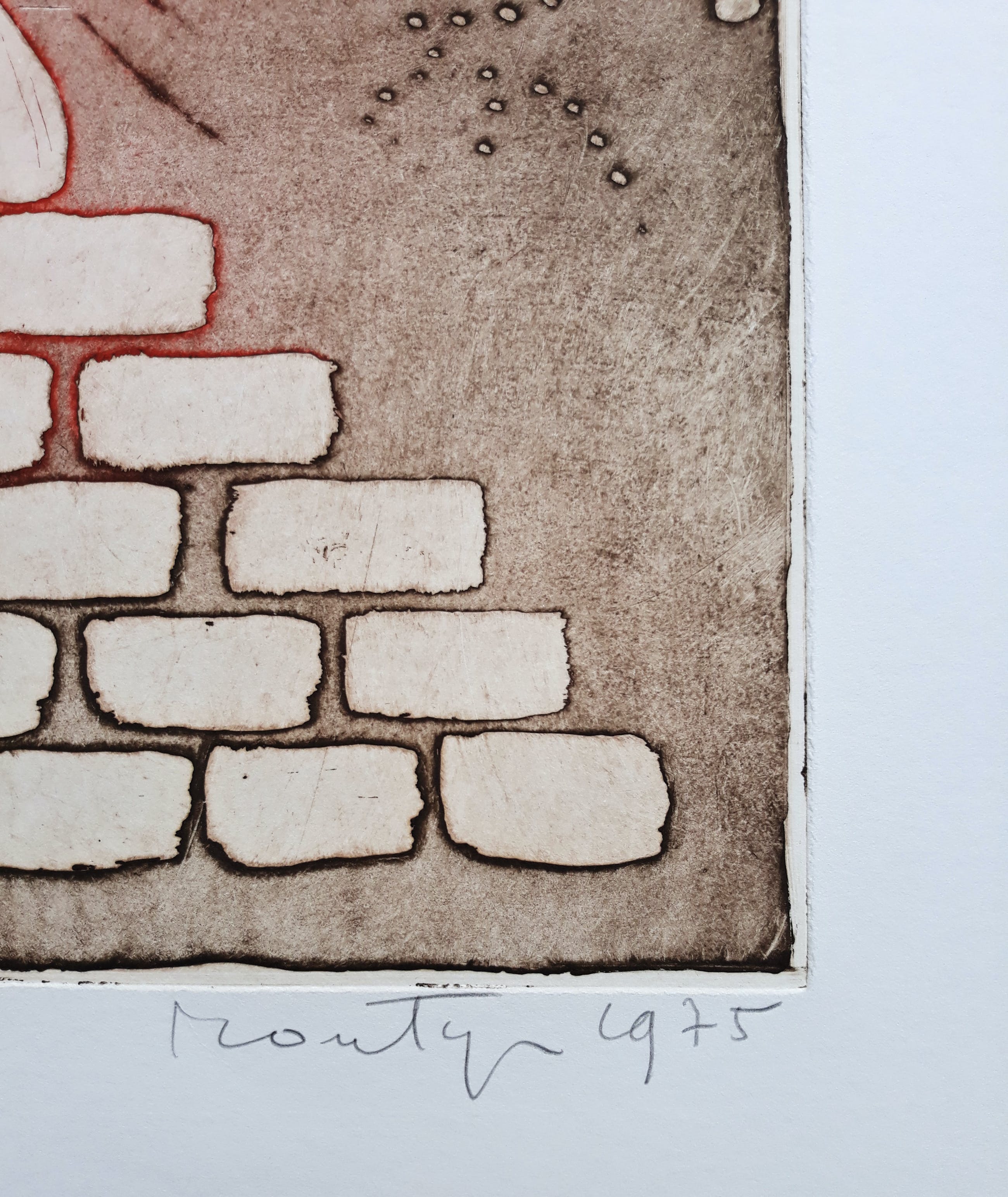 Zeer mooie compositie van Jan Montyn uit 1975. Aquatint ets op dik papier, met potlood gesigneerd, gedateerd en genummerd (17/20). In zeer goede conditie; twee minuscule puntjes in de witte marge onder.