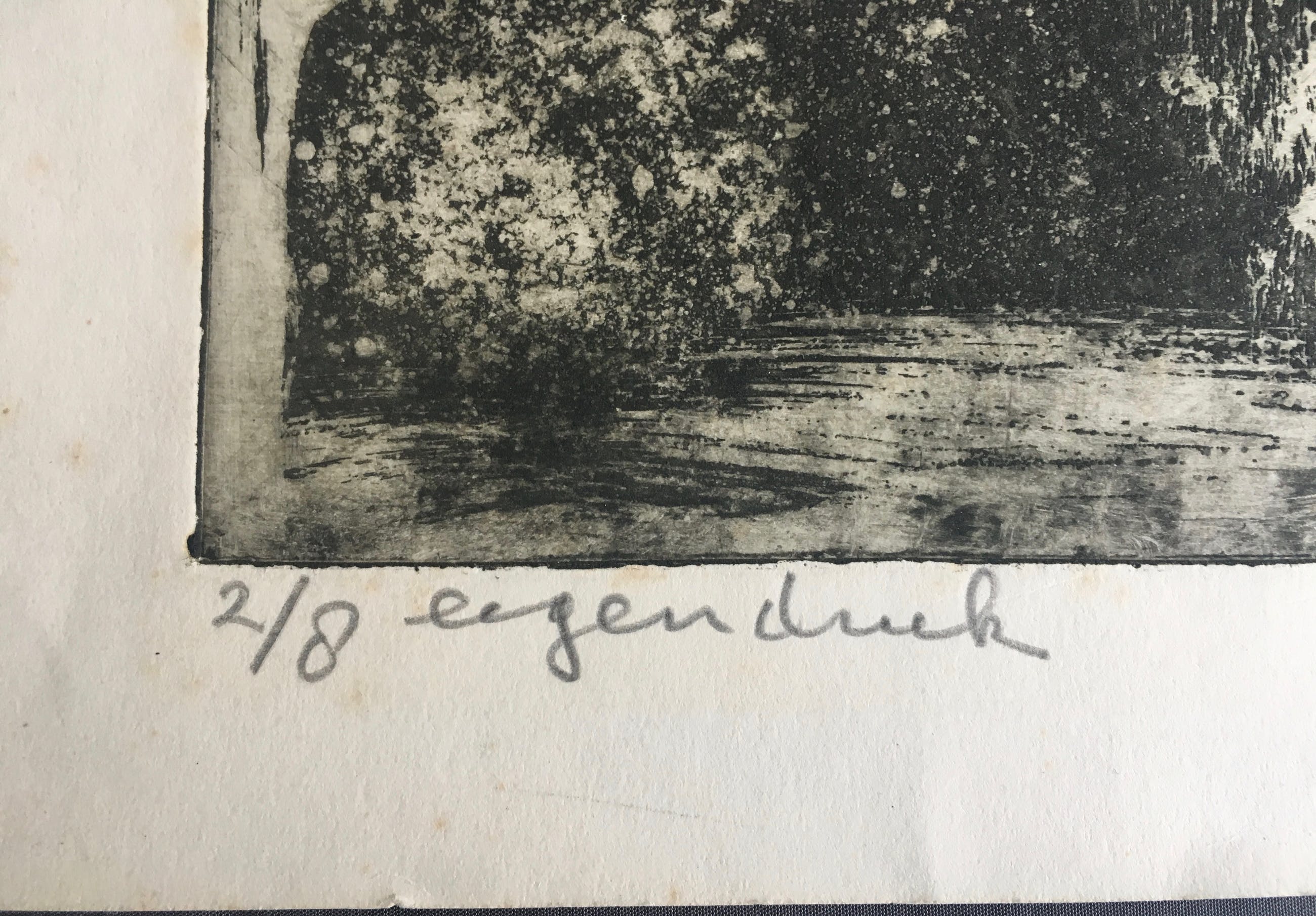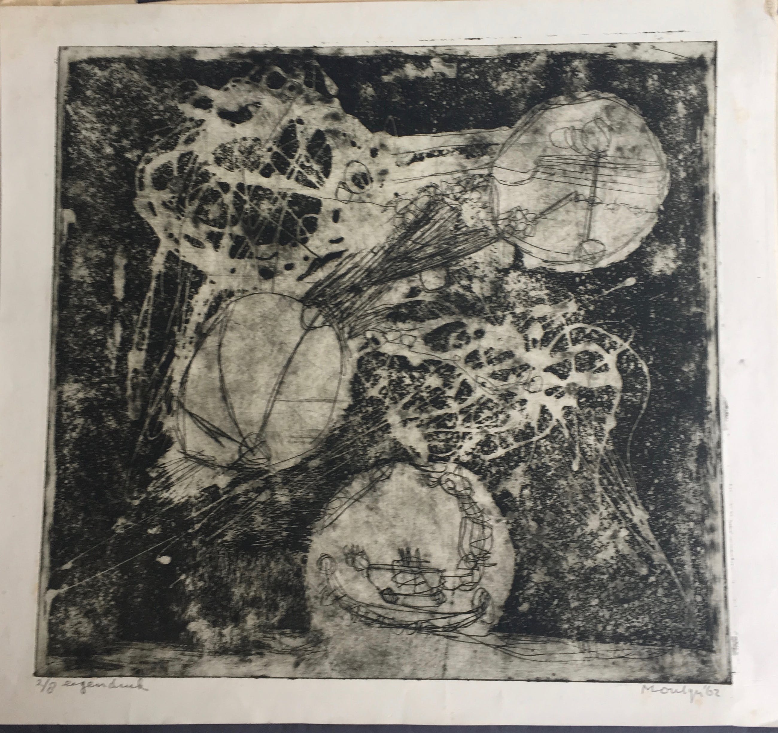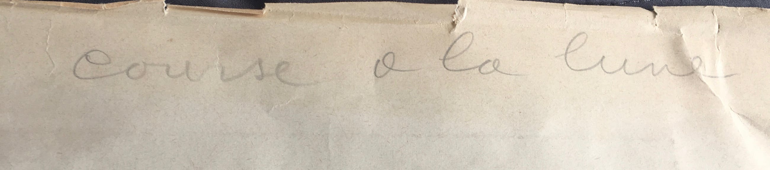 Uit nalatenschap verkregen vroeg werk (1962) van Jan Montyn, getiteld " Course a la lune".Oplage 2/8 eigen druk.De ets is geplakt op dun papier met de titel. Hier en daar wat ouderdomsvlekken op de rand van de ets, maar dit zal wegvallen in een passe partout.