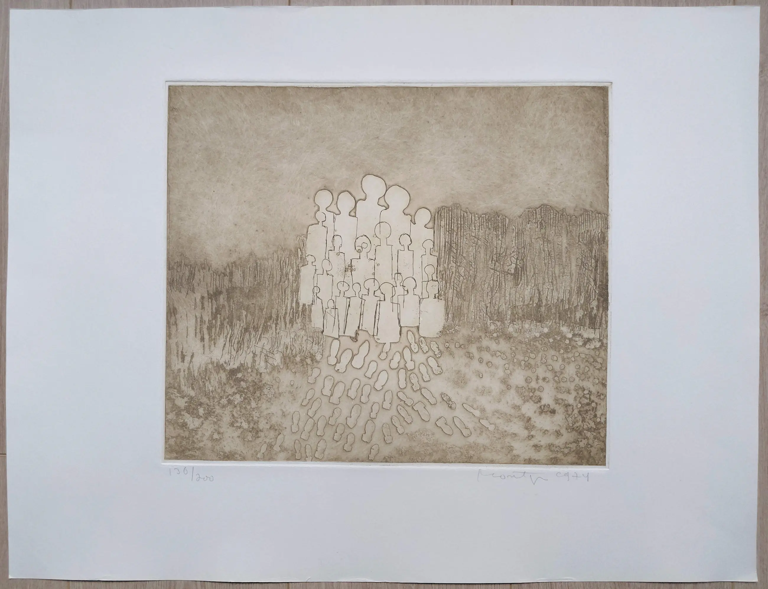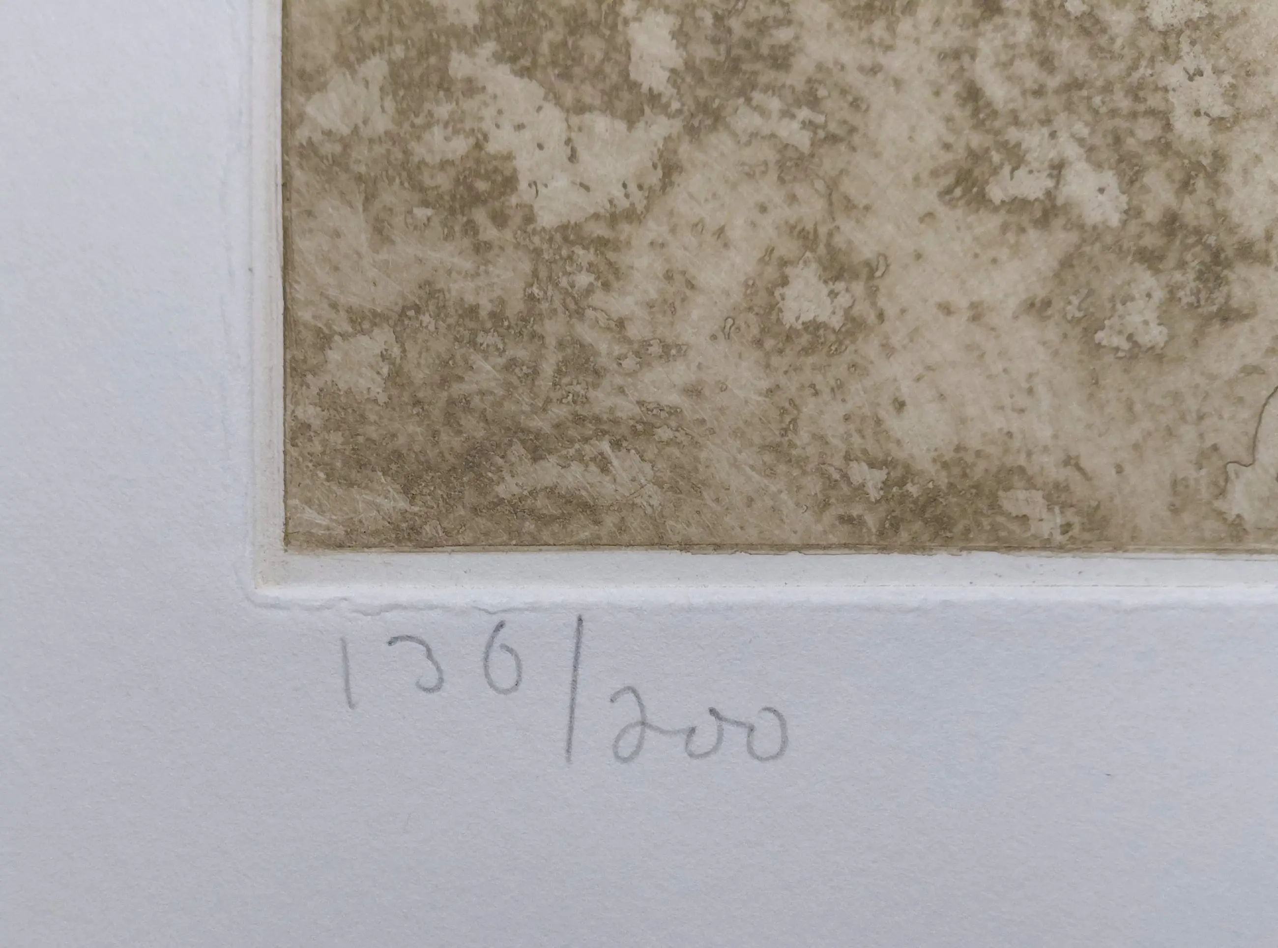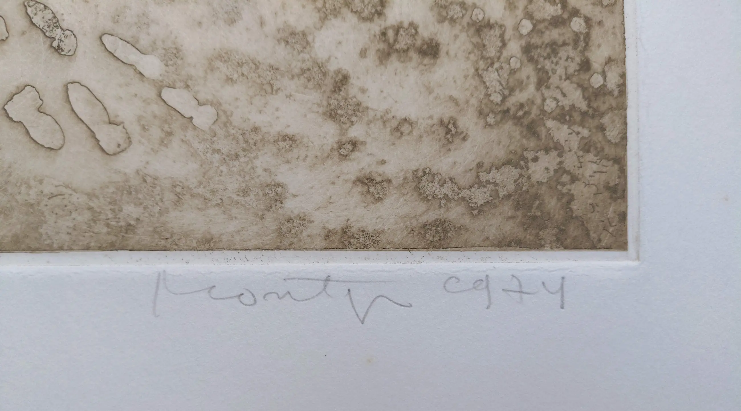 Mooi, karakteristiek werk van Jan Montyn. Aquatint ets op papier, met potlood gesigneerd, gedateerd (1974) en genummerd (136/200). In zeer goede conditie.