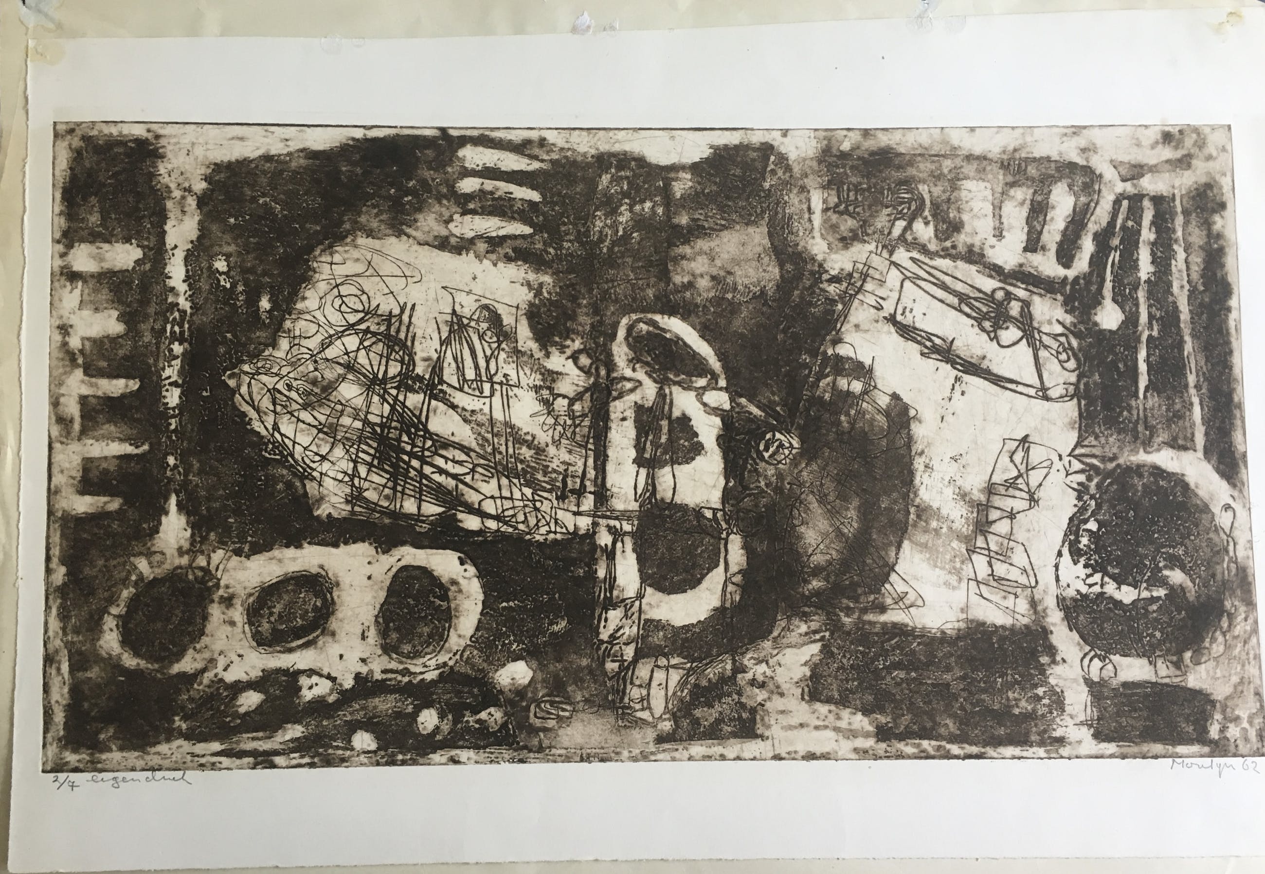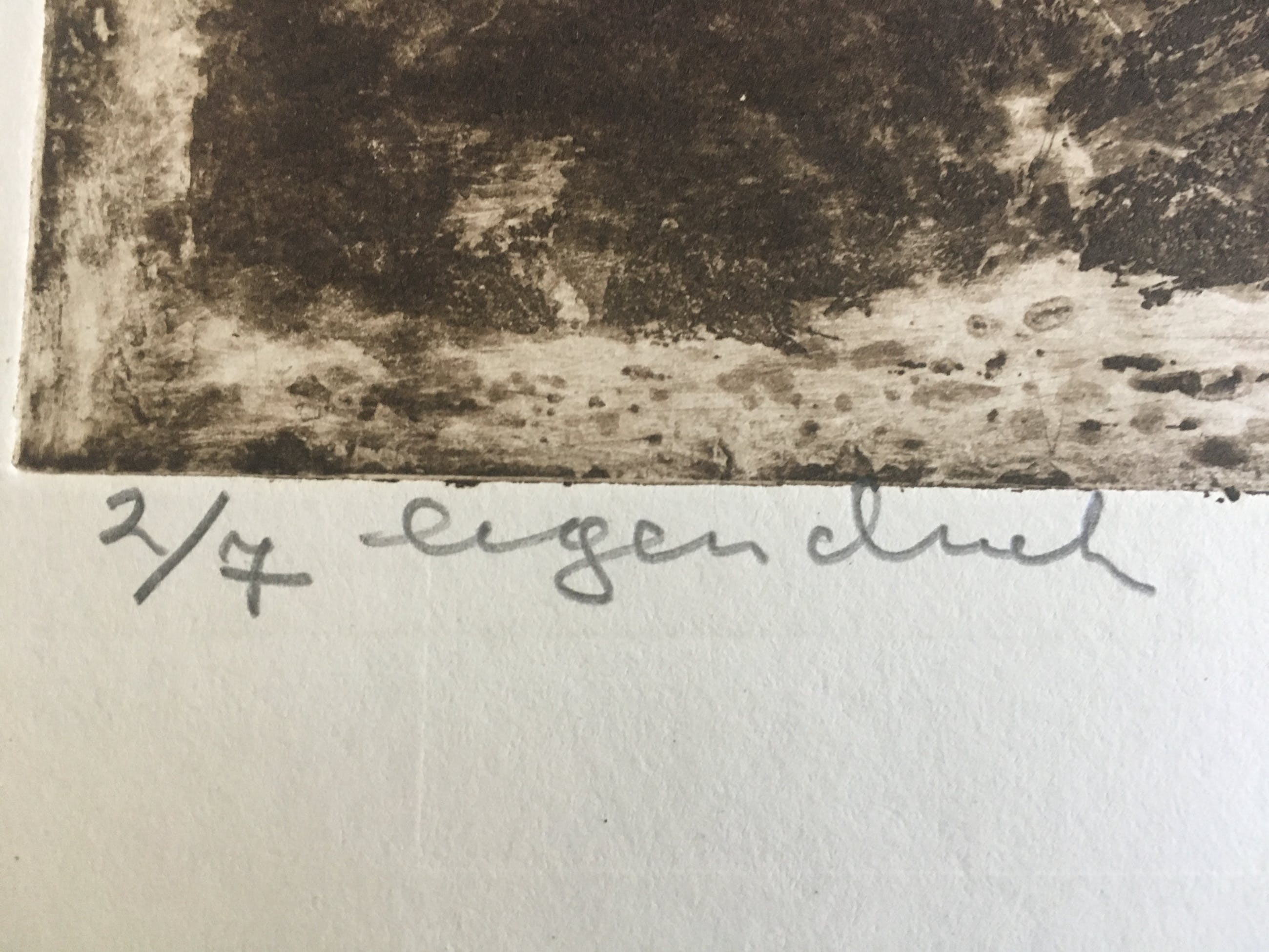 Zeer fraaie ets uit 1962 getiteld "de veroordeling". Oplage 2/7 eigen druk. De ets afgedrukt op dik papier is aan de bovenrand geplakt op dun papier (zuurvrij?). Geen probleem met inlijsten. Prachtig werk voor de liefhebber.