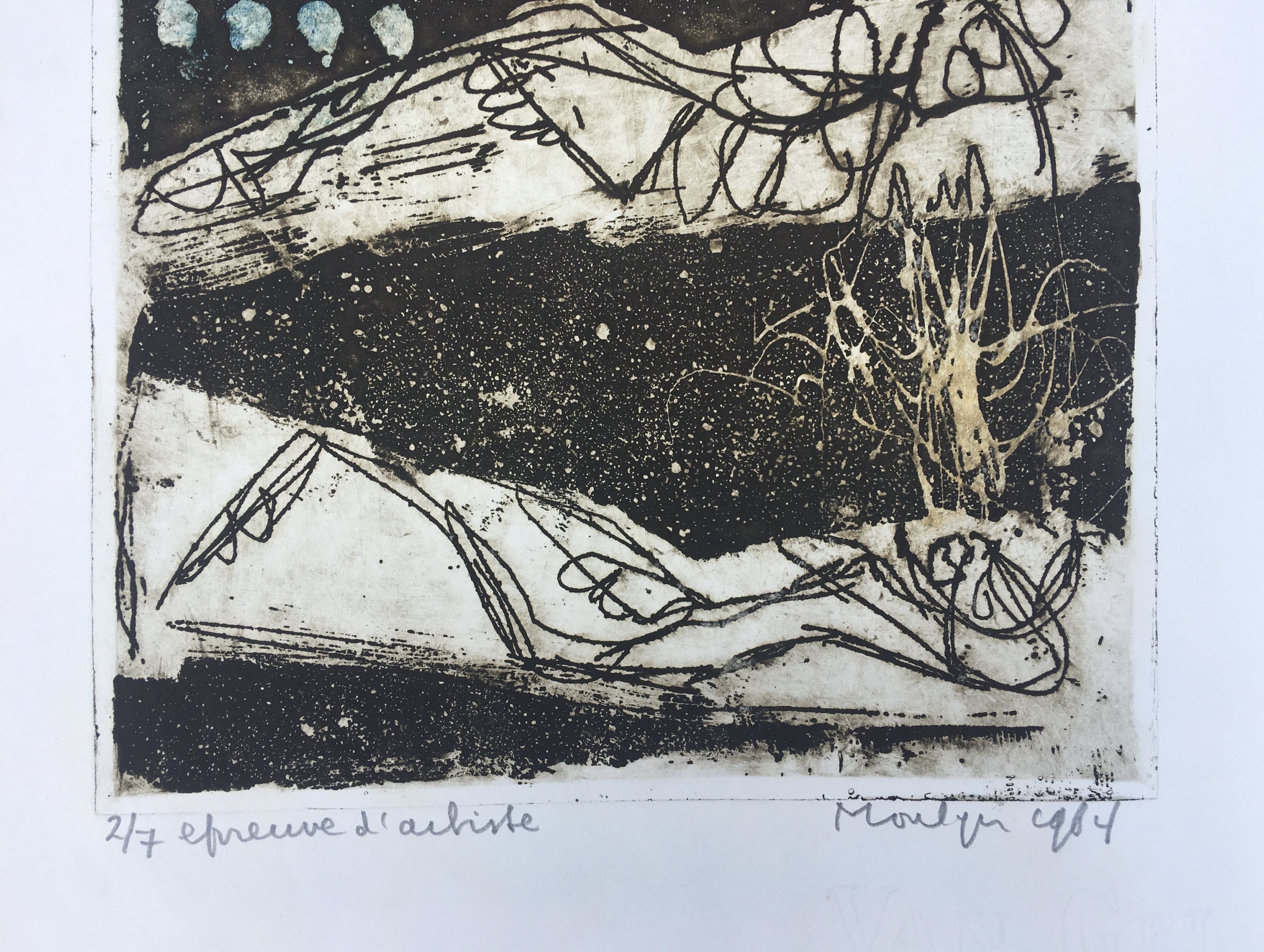 Naast de ets is een door Jan Montyn handgeschreven gedicht van Dylan Thomas. Totale afmeting blad (ets en gedicht) 64x50 cm.