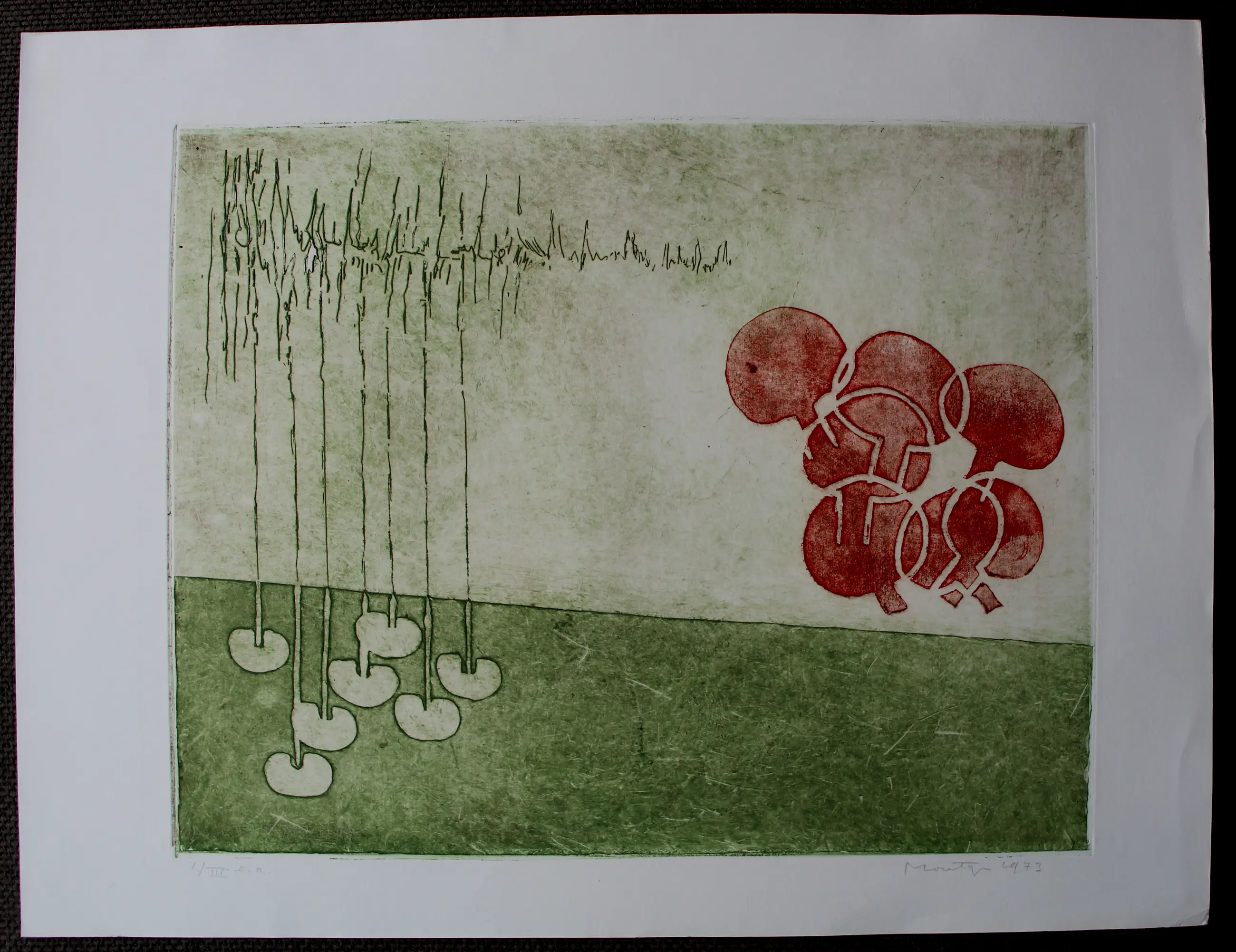 Ets/aquatint van Jan Montyn. Titel: Tropical garden. Jaar: 1973. Oplage: I/III, E.A. Afmetingen blad: H50 x b65.5cm. Afmetingen voorstelling: H39 x b49cm. Het werk is, rechts onderaan gesigneerd en gedateerd door de kunstenaar. De authenticiteit van het aangeboden werk wordt volledig gegarandeerd. Een certificaat van echtheid wordt, op aanvraag, gemaild.