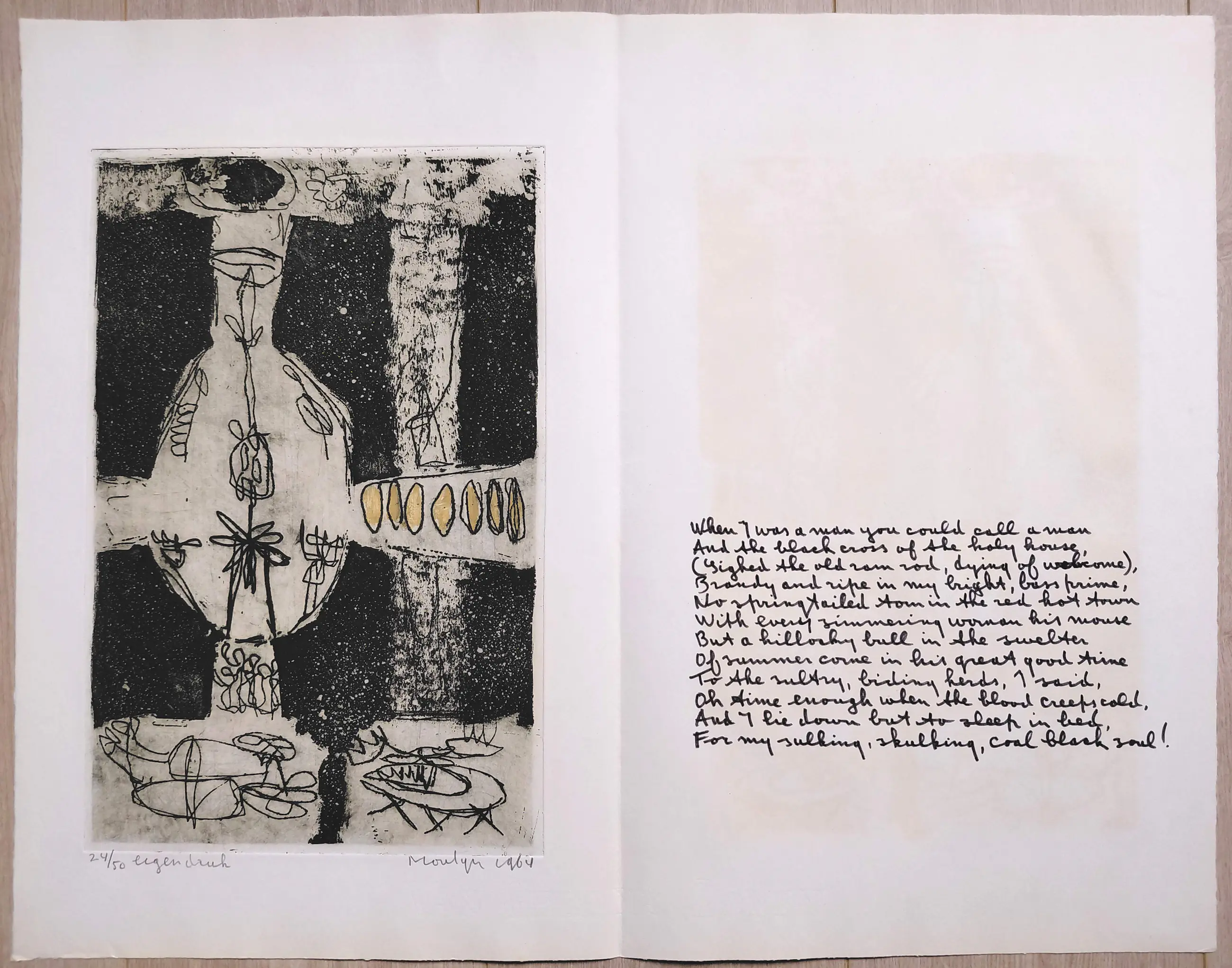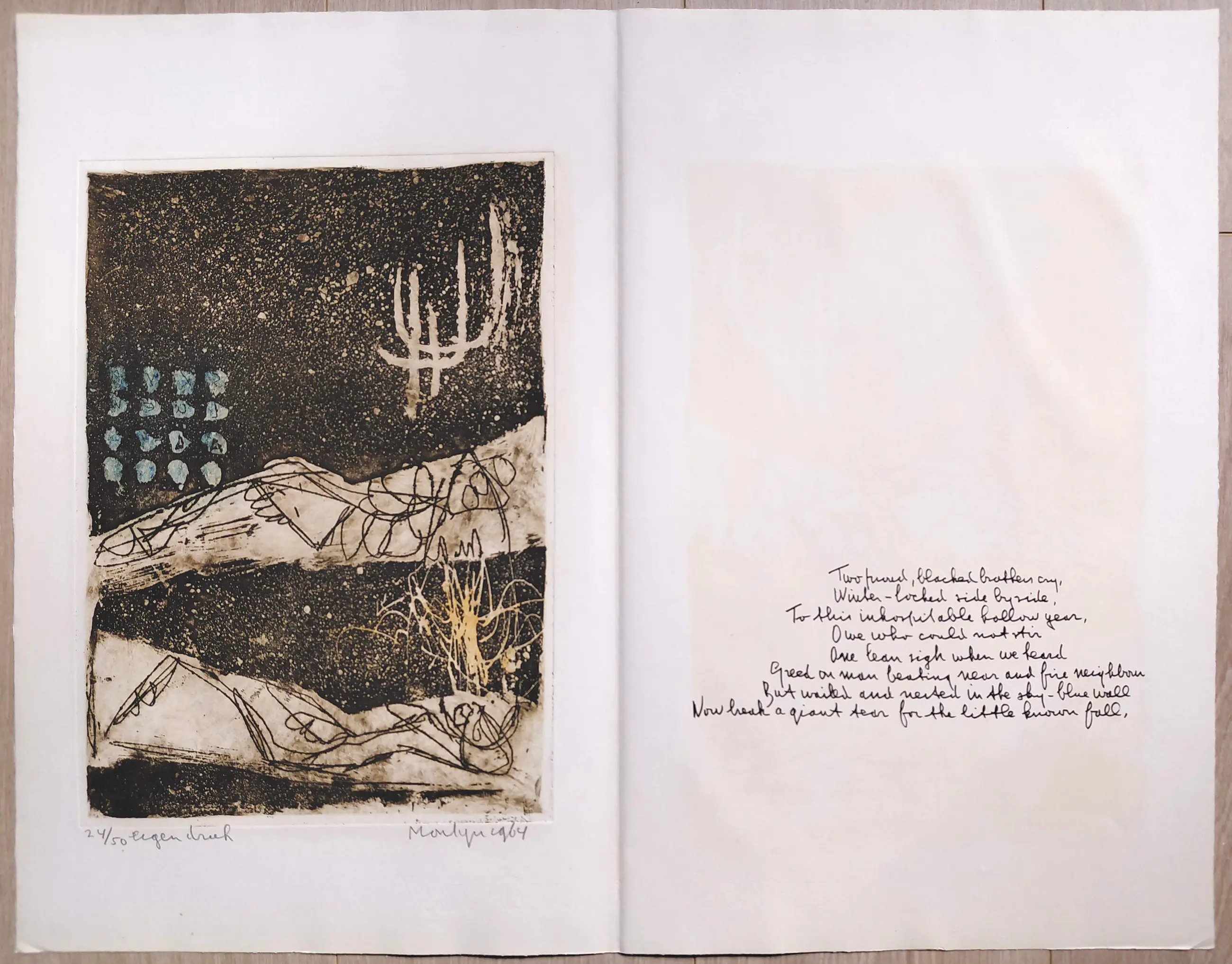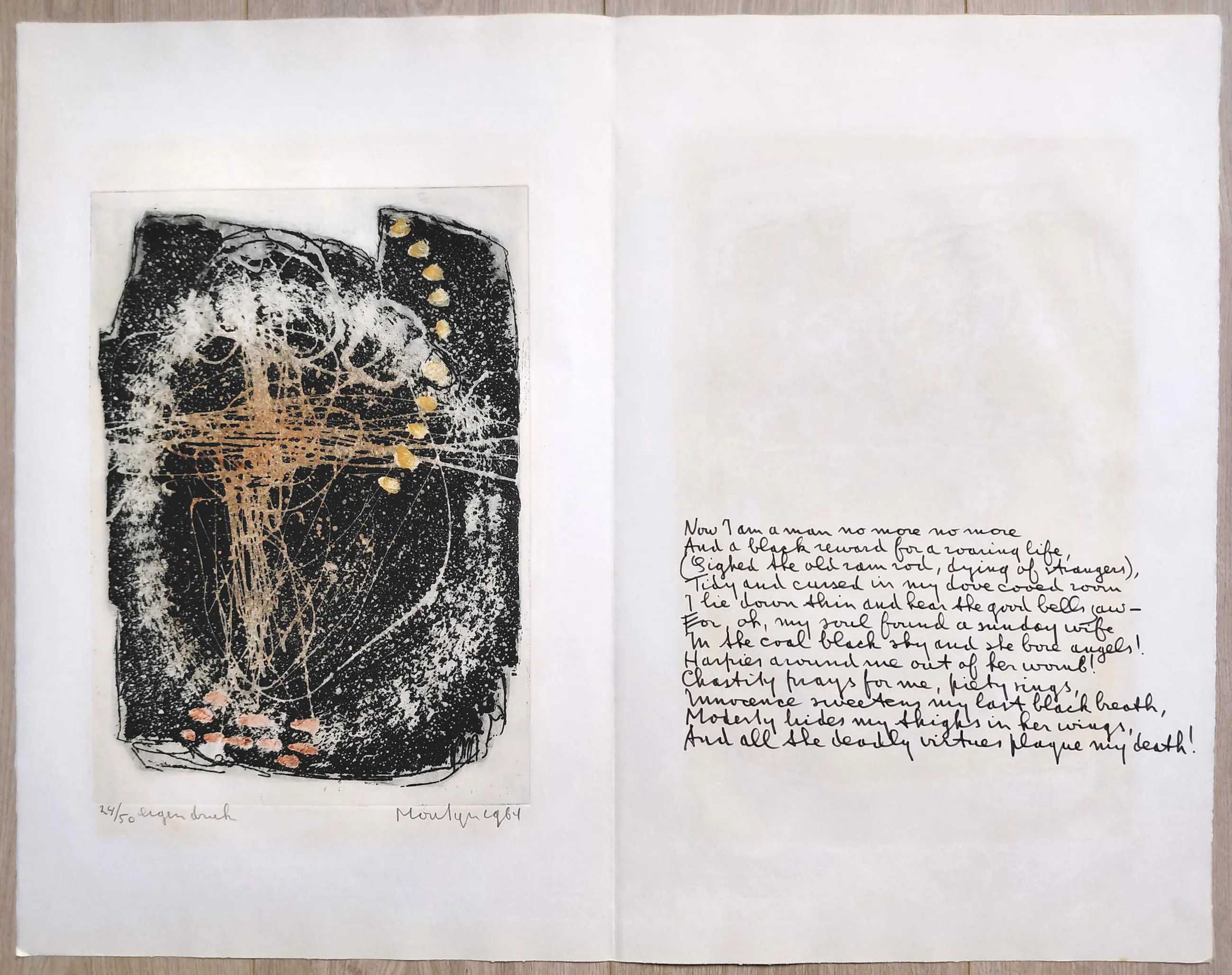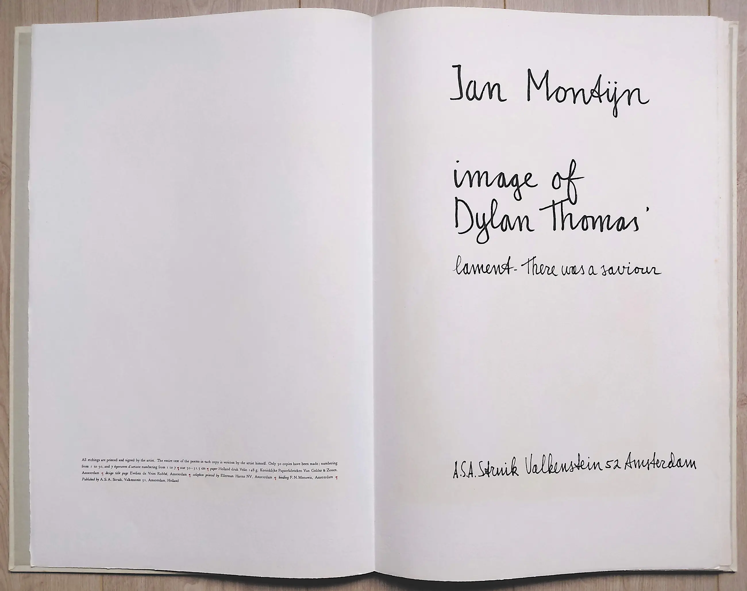 Complete uitgave met tien handgesigneerde etsen van Jan Montyn. Een monument van een uitgave, algemeen beschouwd als zijn magnum opus van de jaren 60. Tien aquatint etsen op Van Gelder & Zonen papier, iedere ets met potlood gesigneerd, gedateerd (1964) en genummerd (24/50) in originele, stevige portfolio. In zeer goede conditie, is meer dan 60 jaar lang in portfolio bewaard gebleven.