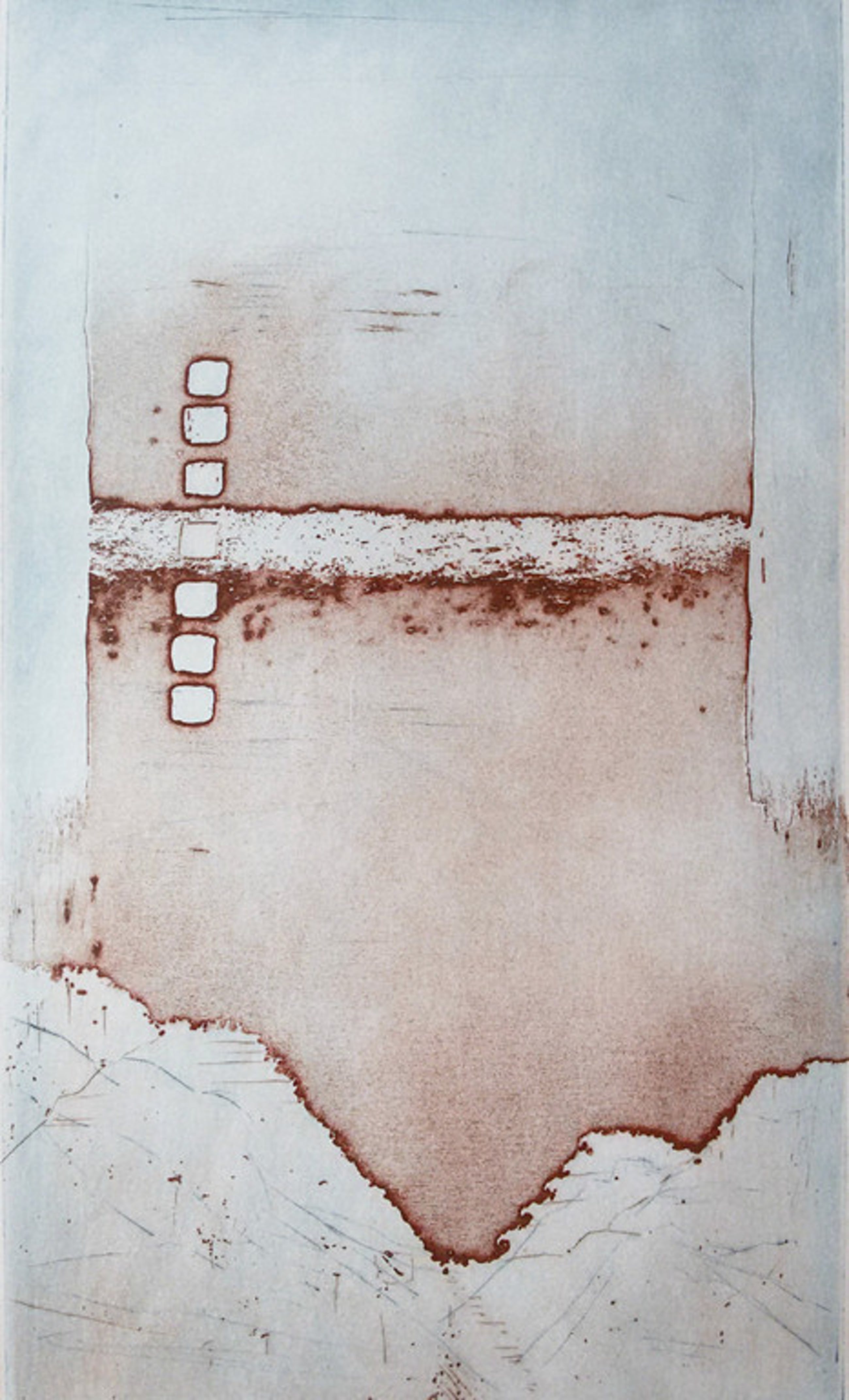 Schitterend werk van Jan Montyn uit de serie Paesaggi Narrati (Het Landschap Verteld), een uitgave die Montyn maakte samen met Cees Nooteboom. Aquatint ets plus gedicht op papier, met potlood gesigneerd (alleen door Montyn), gedateerd (1982) en genummerd (II/III = 2/3 H.C.). In echt prachtige lijst, achter glas en met luxueus, dubbel passe-partout. Kan zo aan de wand, absolute galeriekwaliteit! Afkomstig uit de kunstcollectie van de Nederlandse Investeringsbank (NIB, tegenwoordig NIBC), in uitstekende conditie.