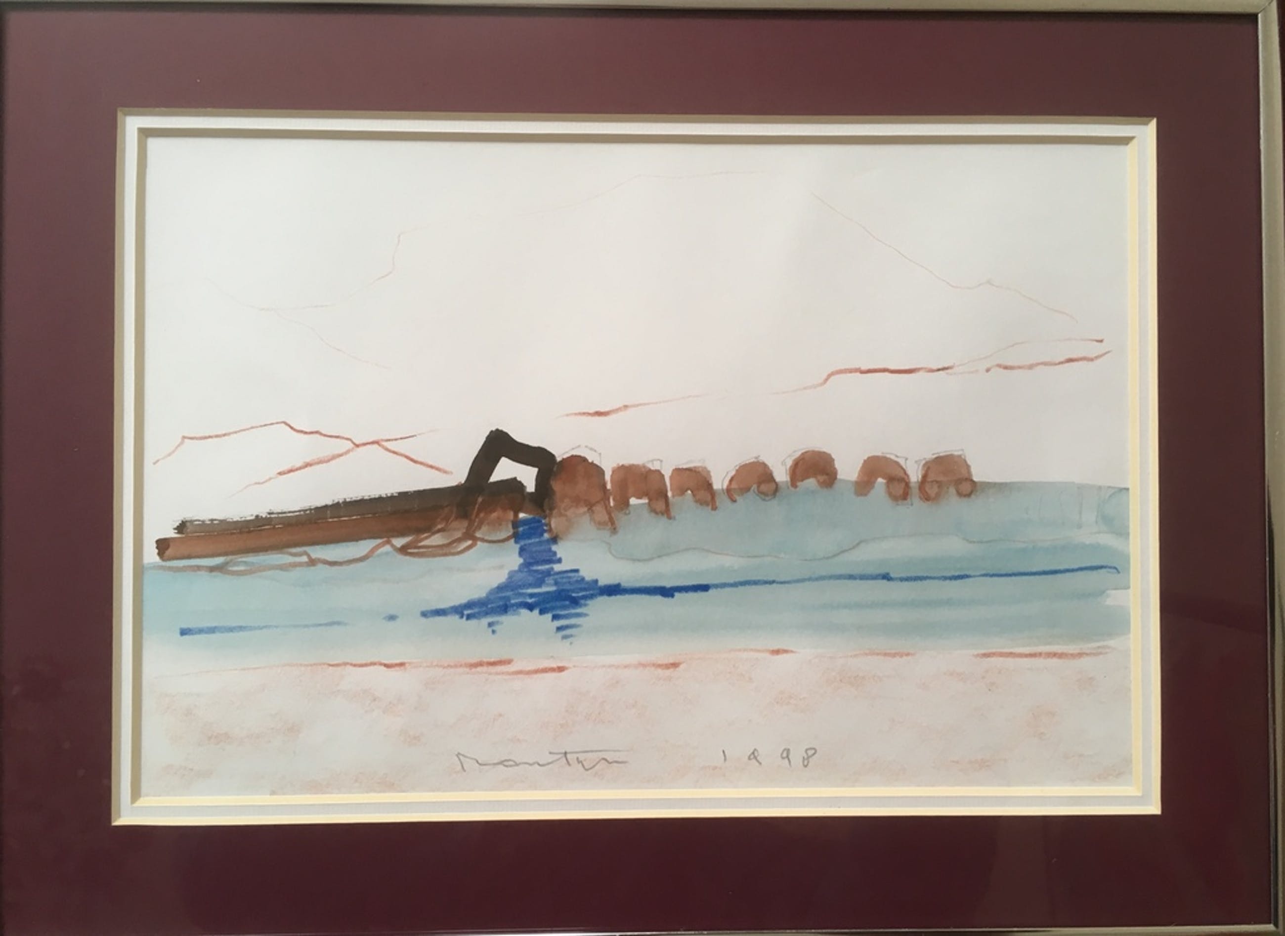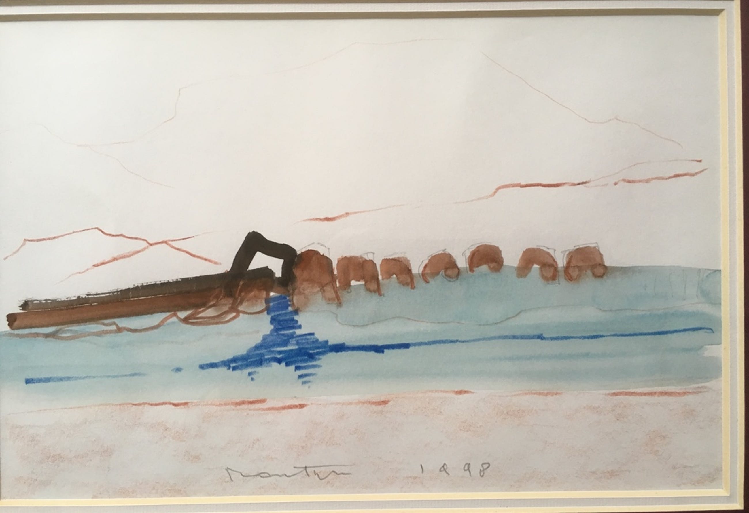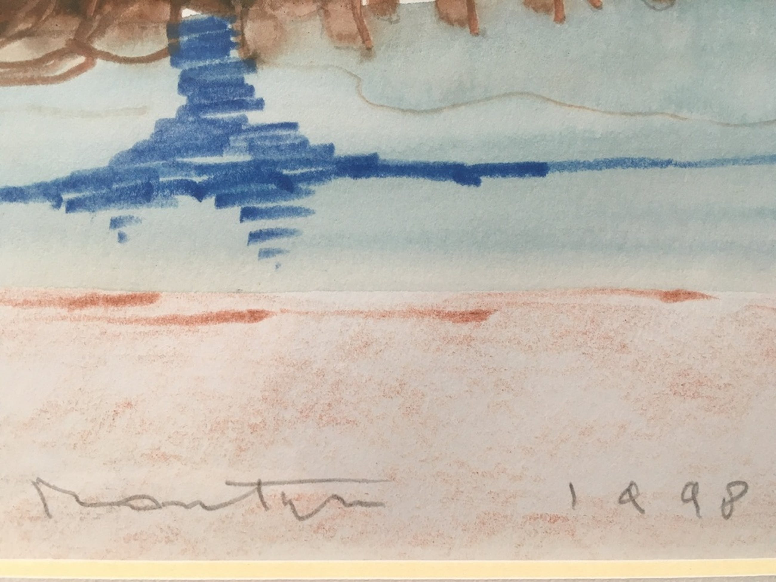 Uniek werk van Jan Montyn uit 1998, aquarel en potlood, gesigneerd onderaan in het midden. Montyn verwierf faam met zijn etsen maar liet ook een mooi oeuvre na van aquarellen, tekeningen en schilderijen. Dit werk draagt geen naam maar stelt ongetwijfeld een dorp voor langs de oevers van een rivier in Zuidoost-Azie.