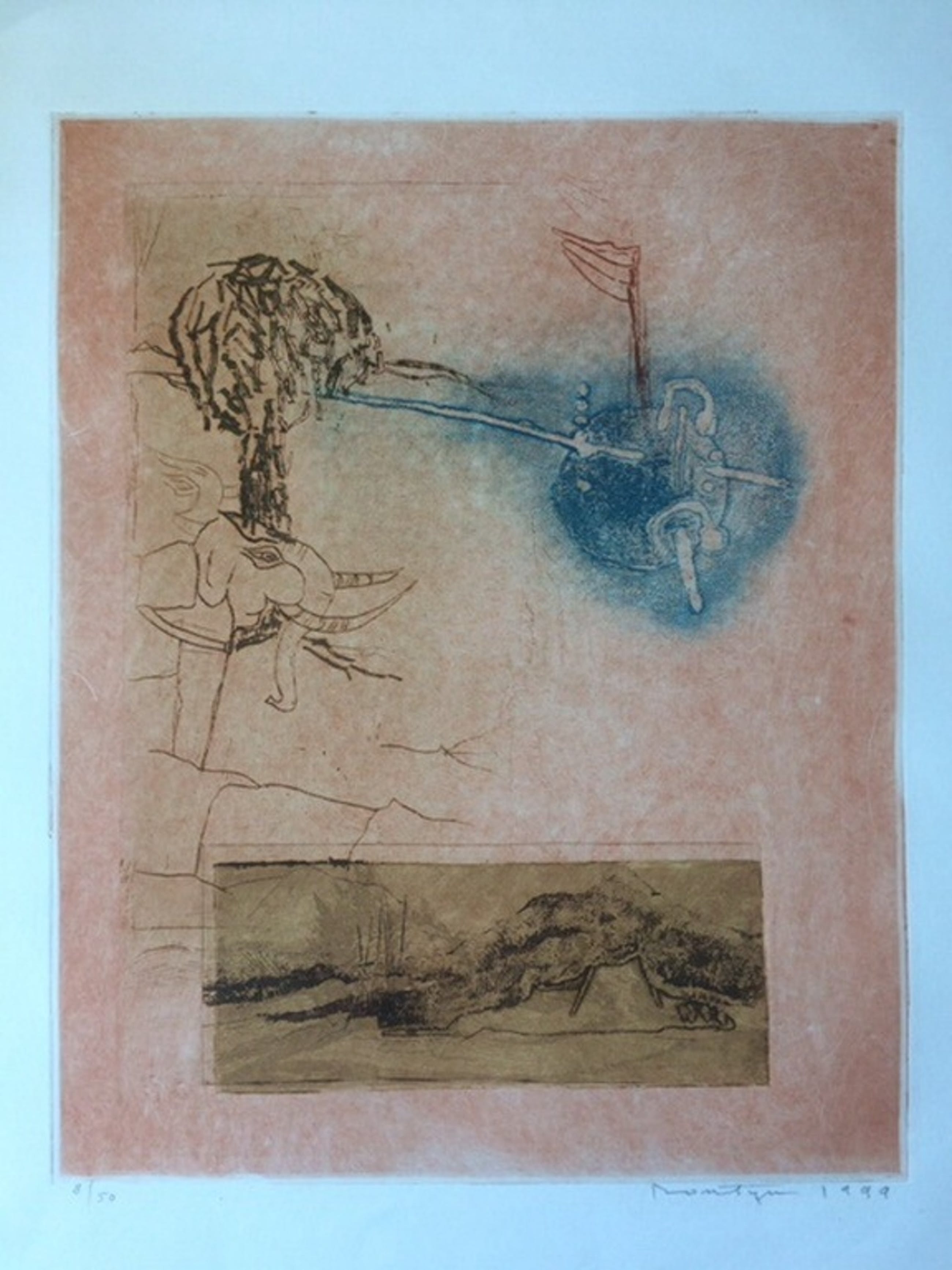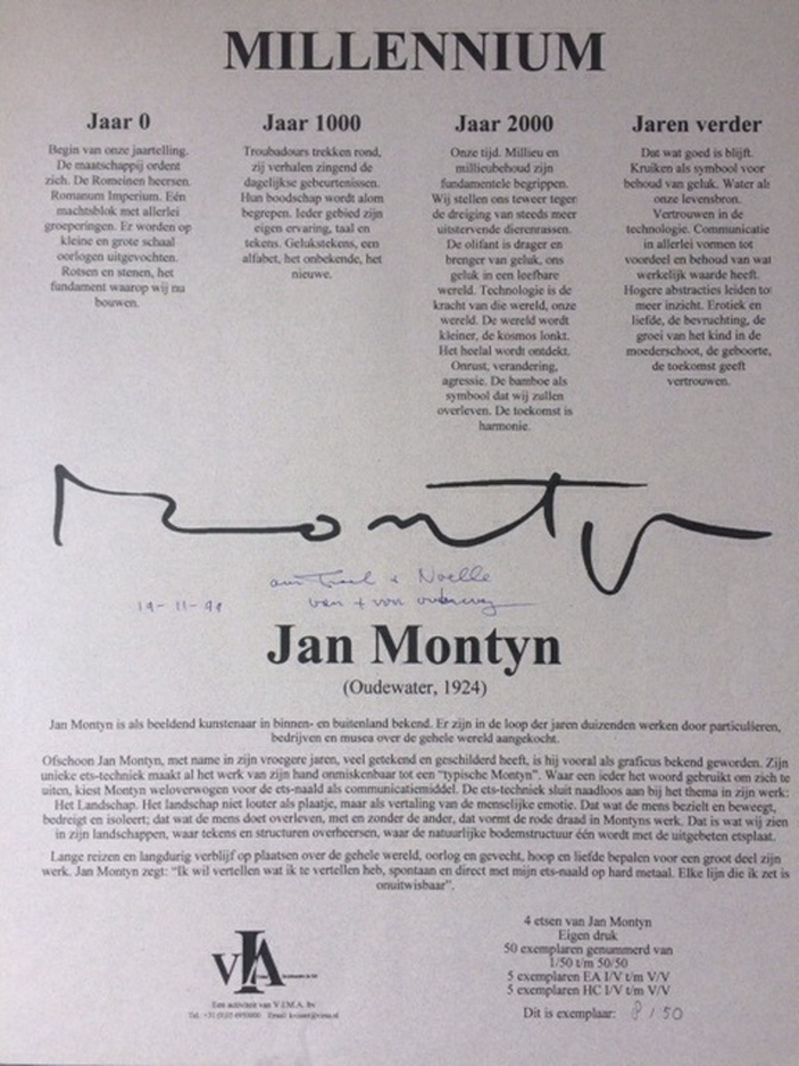 Geinspireerd door de grootsheid van de eeuwwisseling vervaardigde Jan Montyn in het jaar 1999 in een oplage van 50 stuks de map Millennium, een set van vier etsen. De handgesigneerde prenten refereren aan het Jaar nul, het jaar 1000, het jaar 2000 en aan Jaren Verder (" Dat wat goed is blijft"). Deze map draagt nummer 8/50 en verkeert in uitstekende conditie. De vier prenten, formaat 50x65 cm, gaan vergezeld van een schutblad waarin de werken nader worden toegelicht. Er is een persoonlijke opdracht van de kunstenaar bijgeschreven die duidelijk maakt dat de aanbieder van deze werken de map persoonlijk bij de kunstenaar heeft verworven.