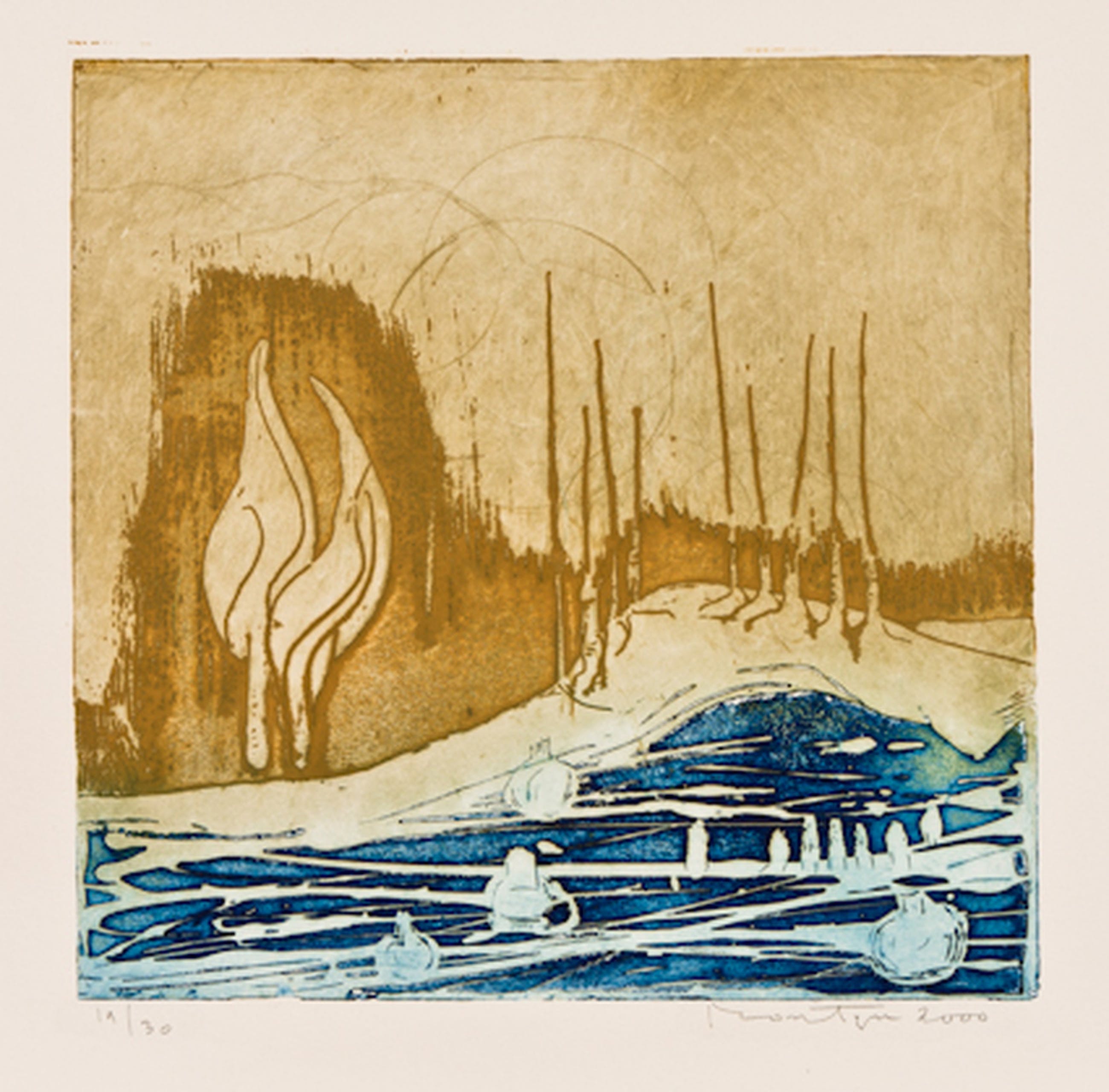 Prachtige kleurenets van Jan Montyn uit de serie "Het gedroomde land" op geschept papier. Met potlood gesigneerd, gedateerd (2000) en genummerd (14/30). Netjes ingelijst.