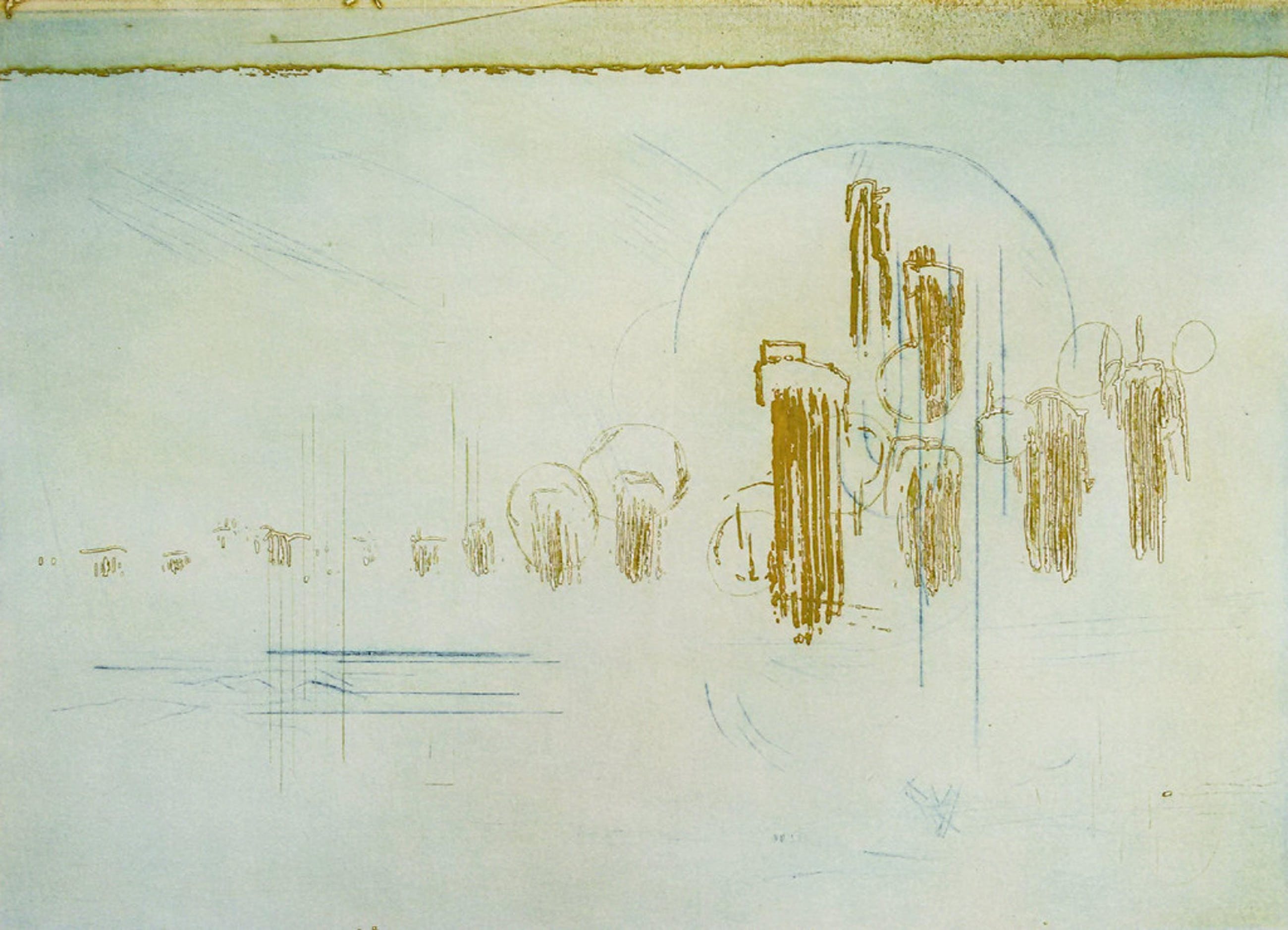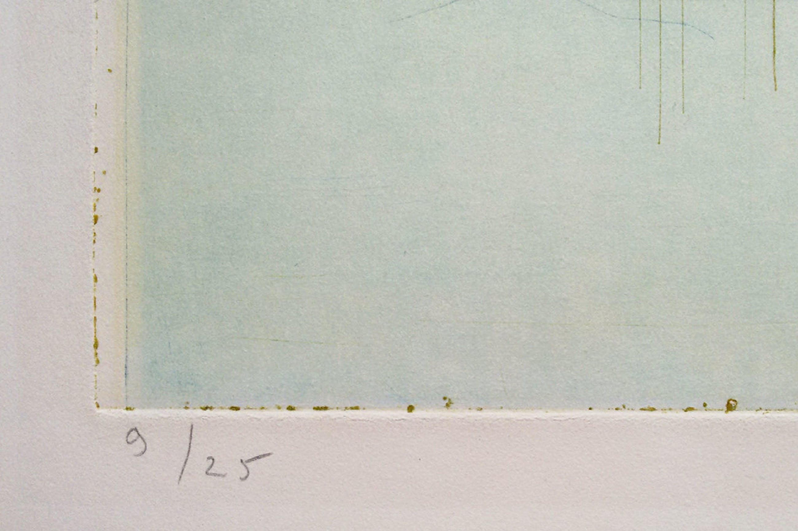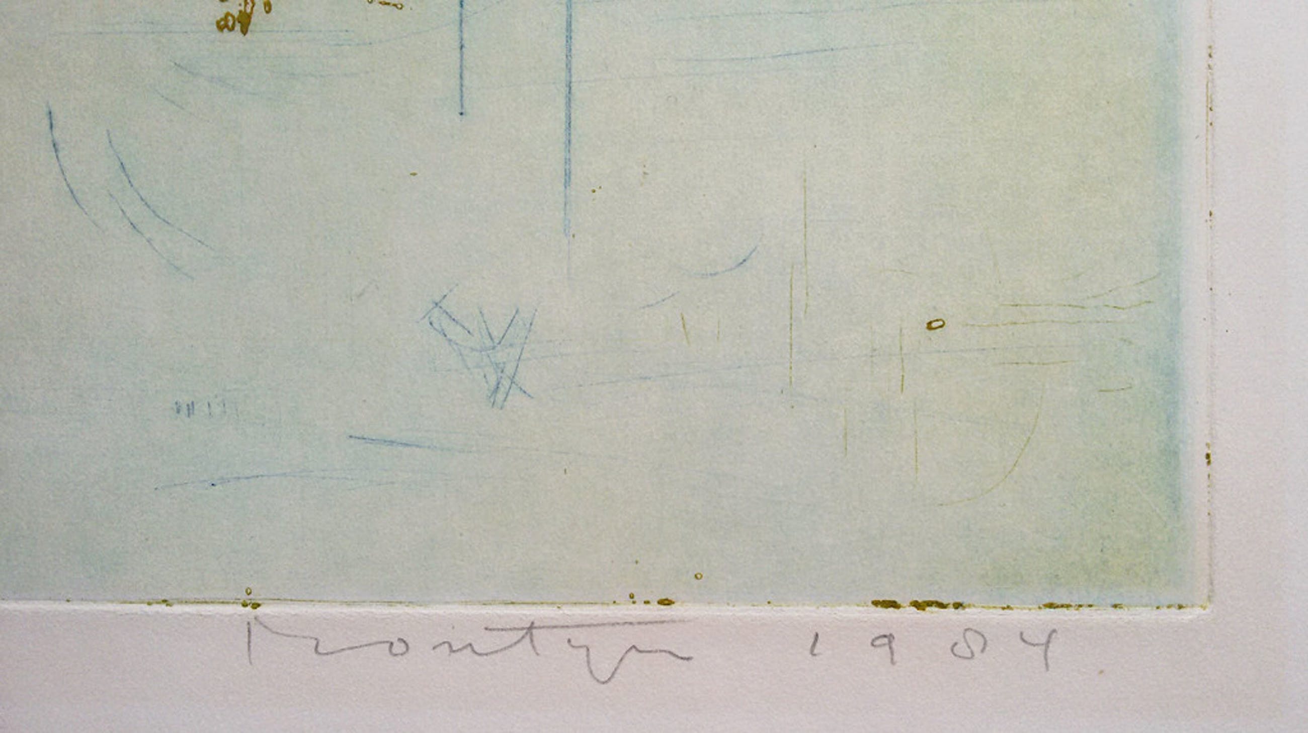 Verstild, abstract werk van Jan Montyn uit 1984. Aquatint ets op papier, met potlood gesigneerd, gedateerd en genummerd (9/25). Afkomstig uit de kunstcollectie van ABNAMRO, in zeer goede conditie. Werk heeft ingelijst gezeten want aan de achterkant van het blad zitten taperesten en er is een hele lichte verkleuring binnen een voormalig passe-partout. Ingelijst met passe-partout is het werk perfect.