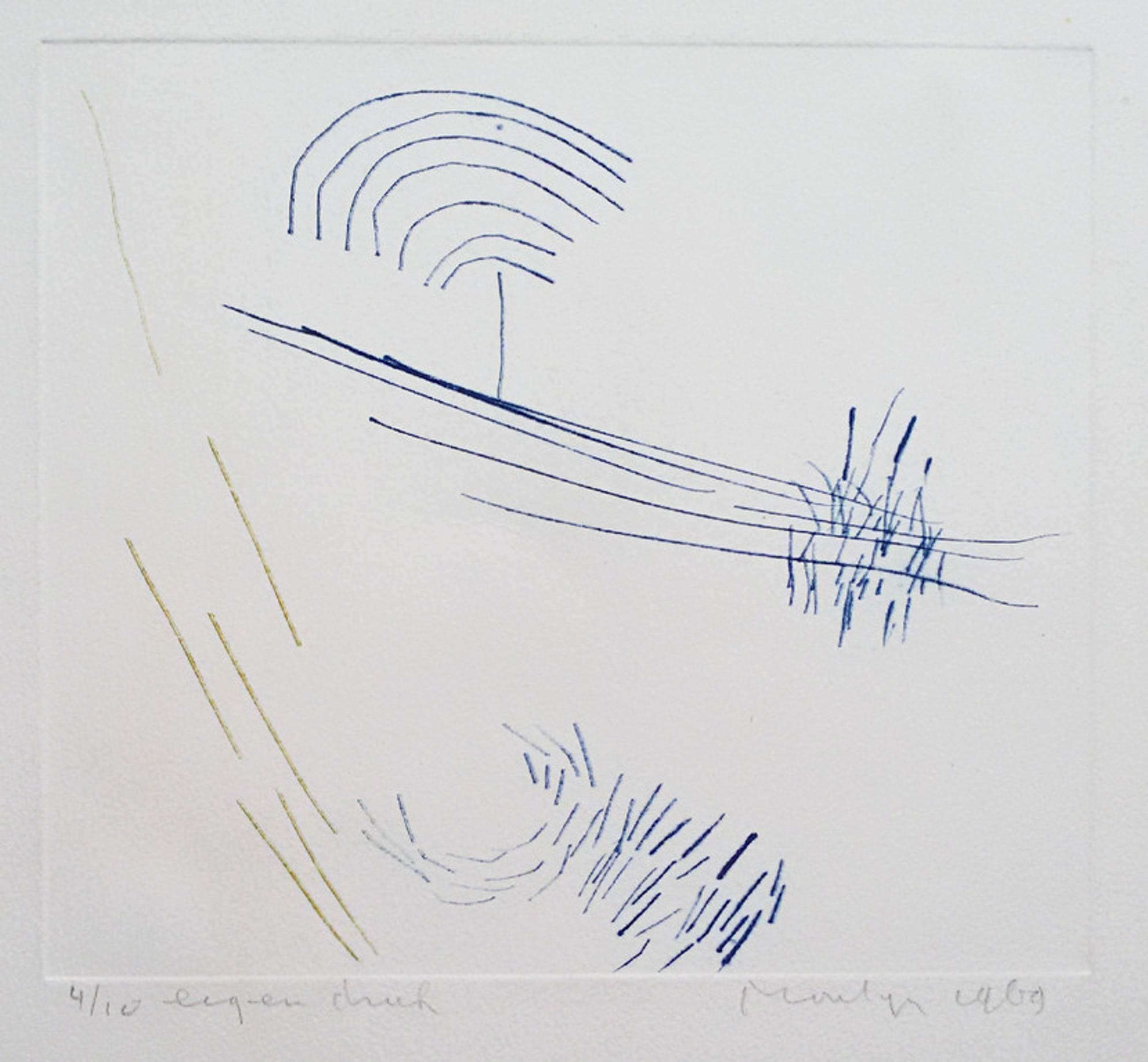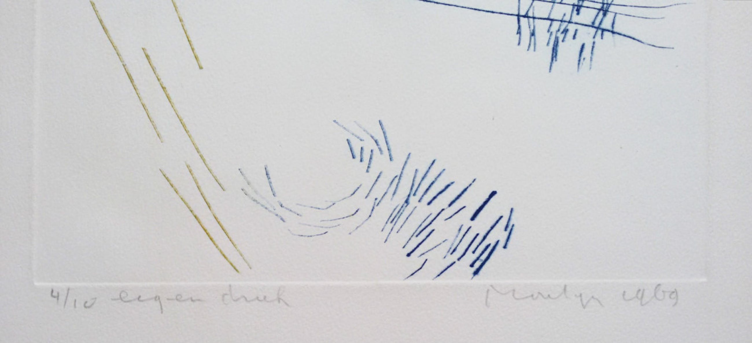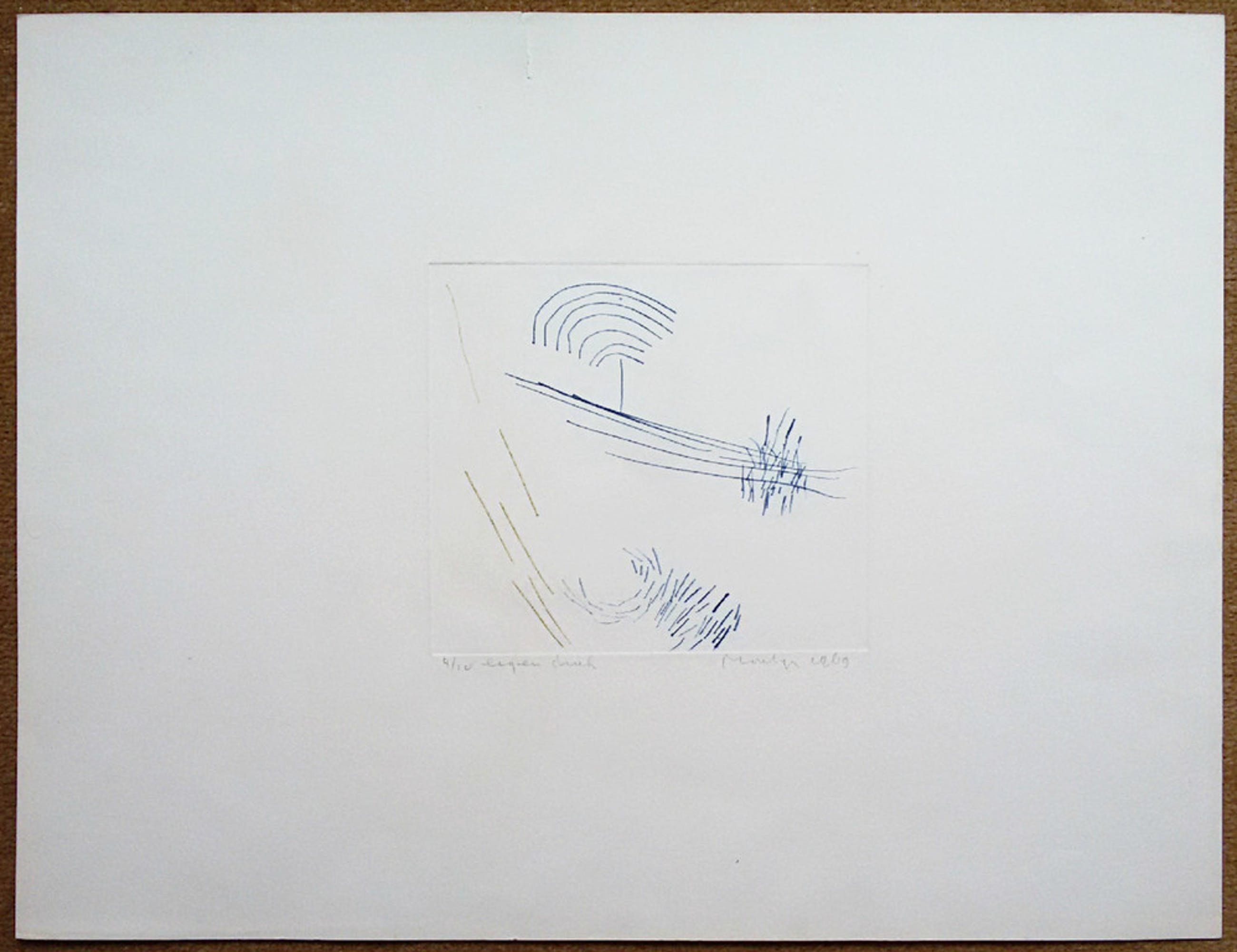 Zeer abstract werk van Jan Montyn uit 1969. Droge naald ets op dik papier, met potlood gesigneerd, gedateerd en genummerd (4/10). In zeer goede conditie, er zit alleen een scheur van 4 cm in de uiterste bovenrand van het blad (maar wel 10 cm verwijderd van het beeld). Ingelijst met passe-partout is het werk perfect.