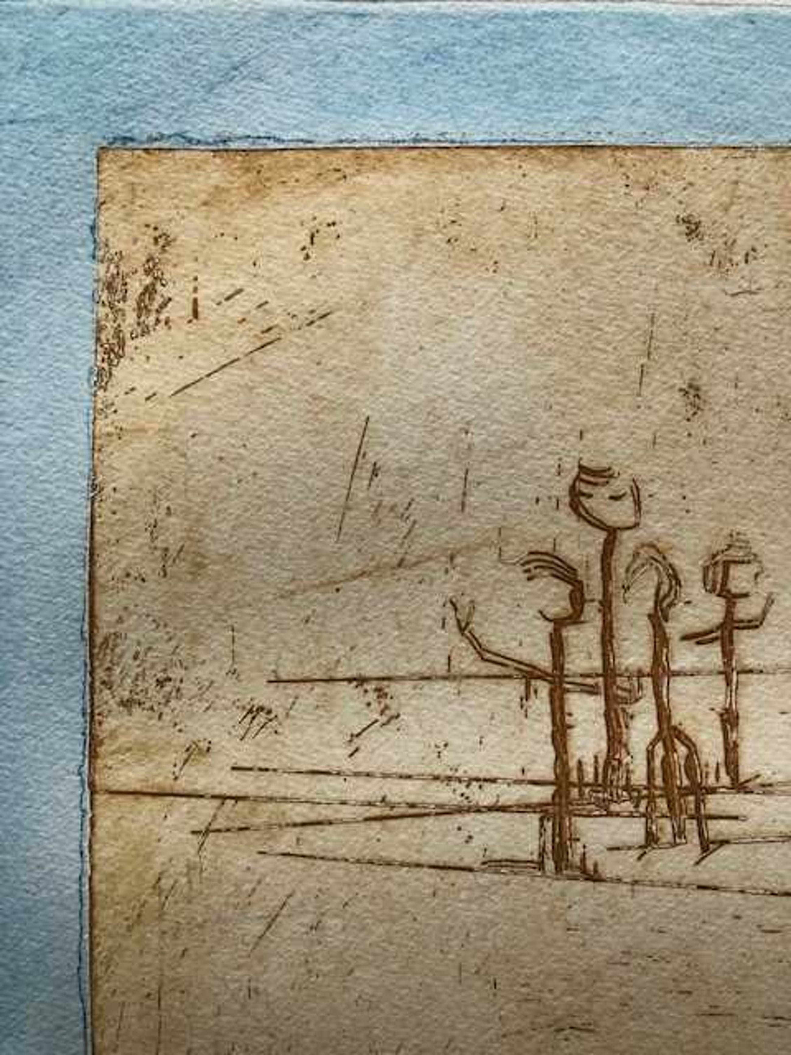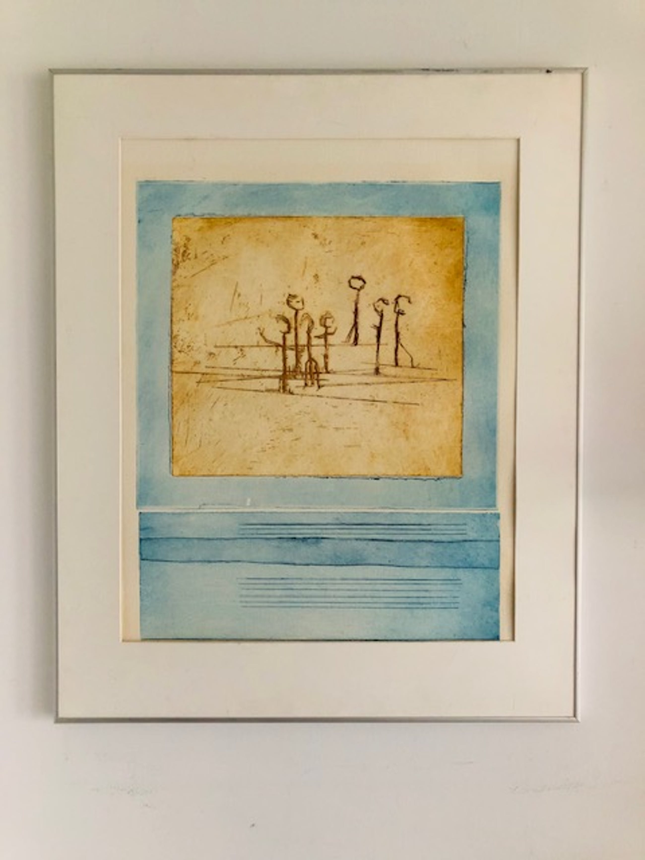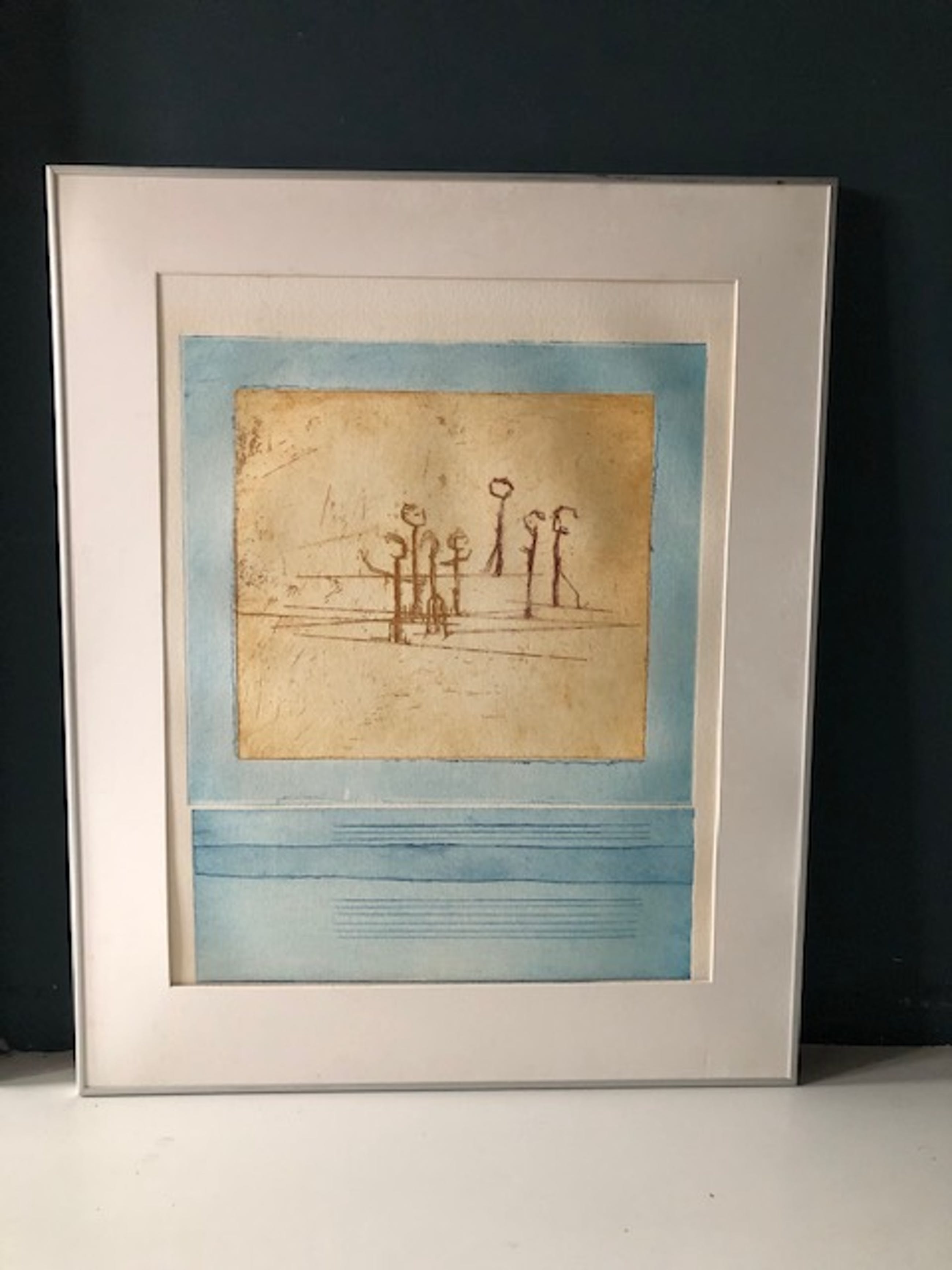 Licht verkleurd, vooral het passe-partout heeft slijtplekjes. Papier is licht bobbelig. Lijst heeft gebruikssporen.
