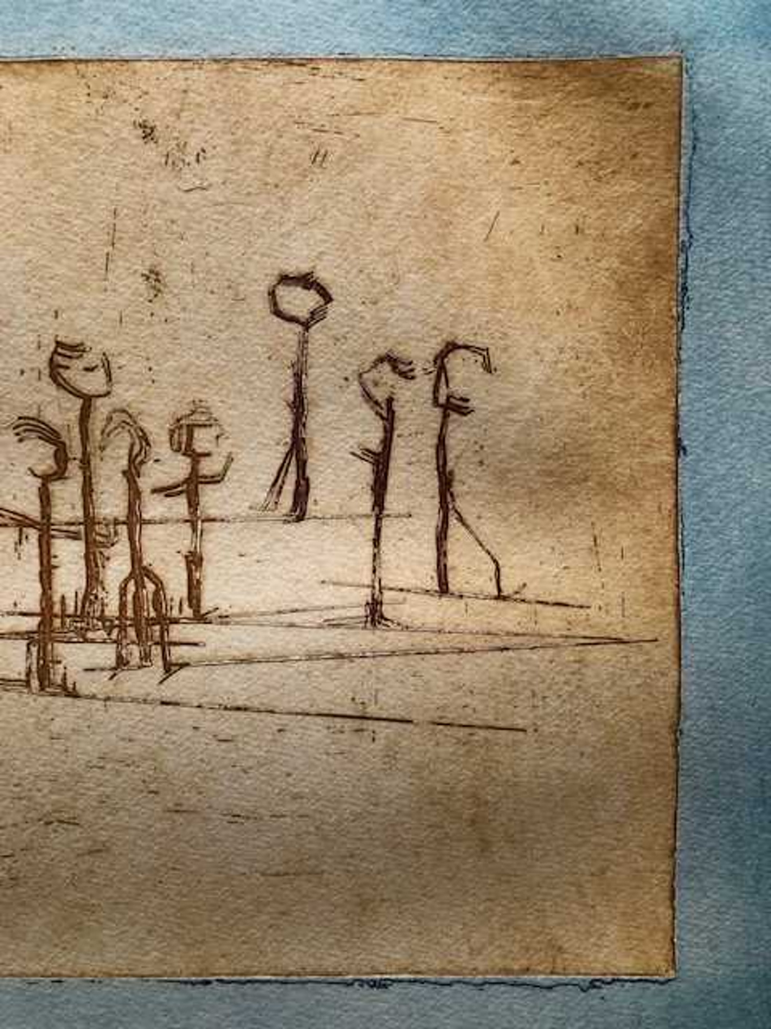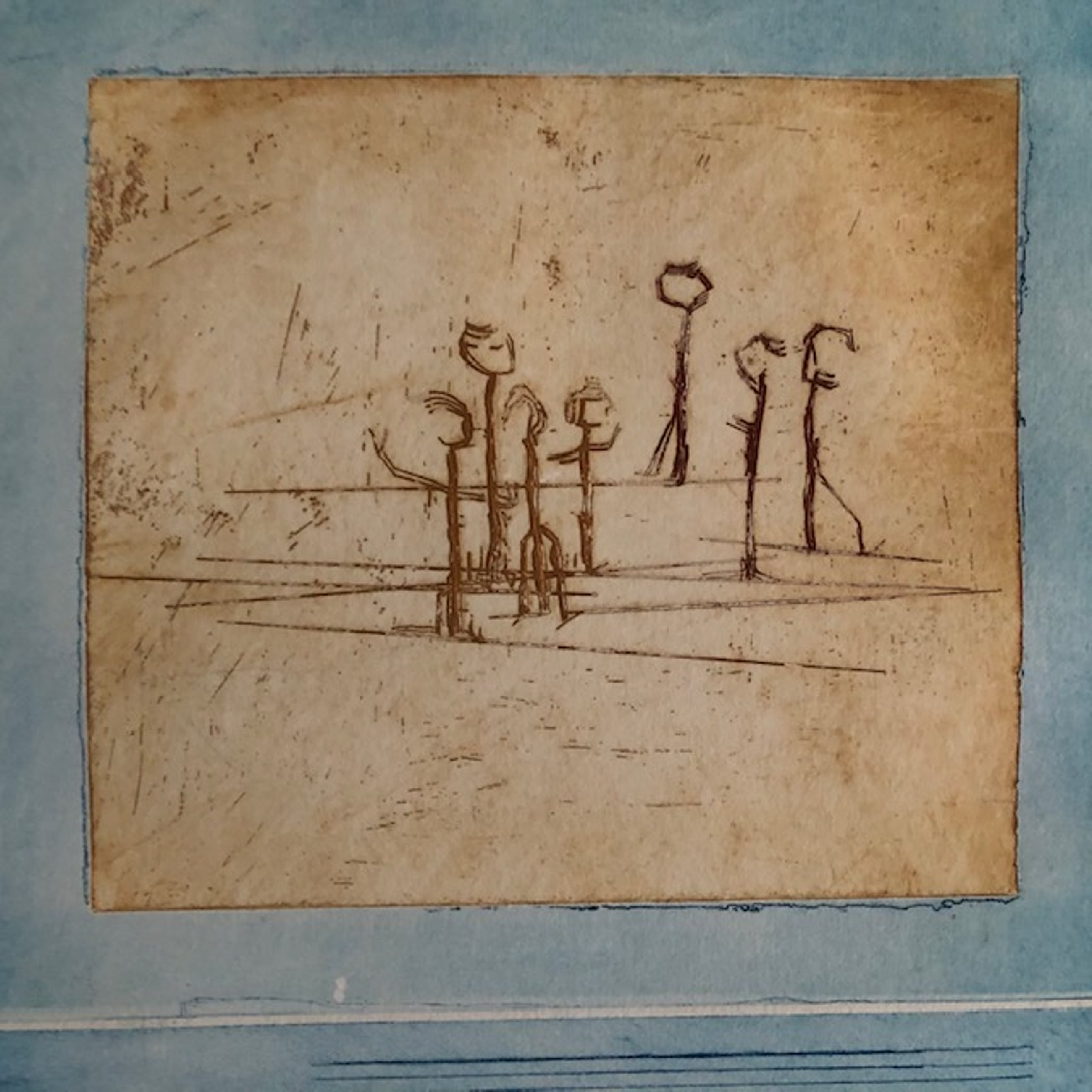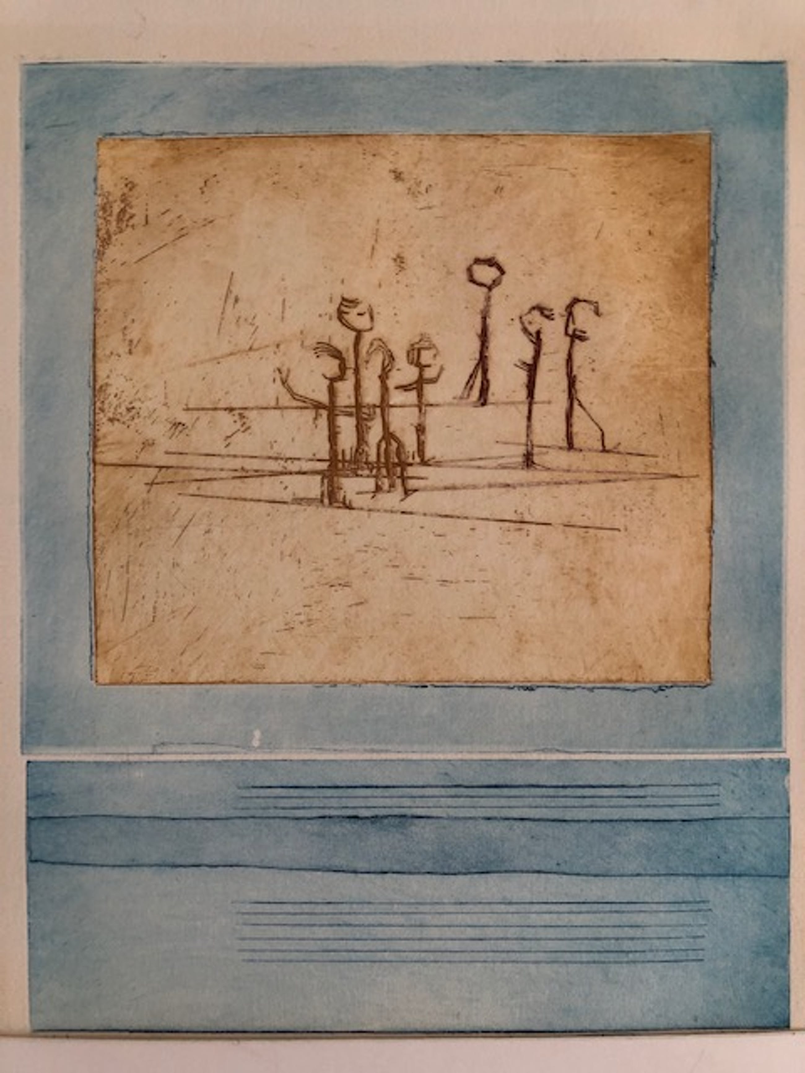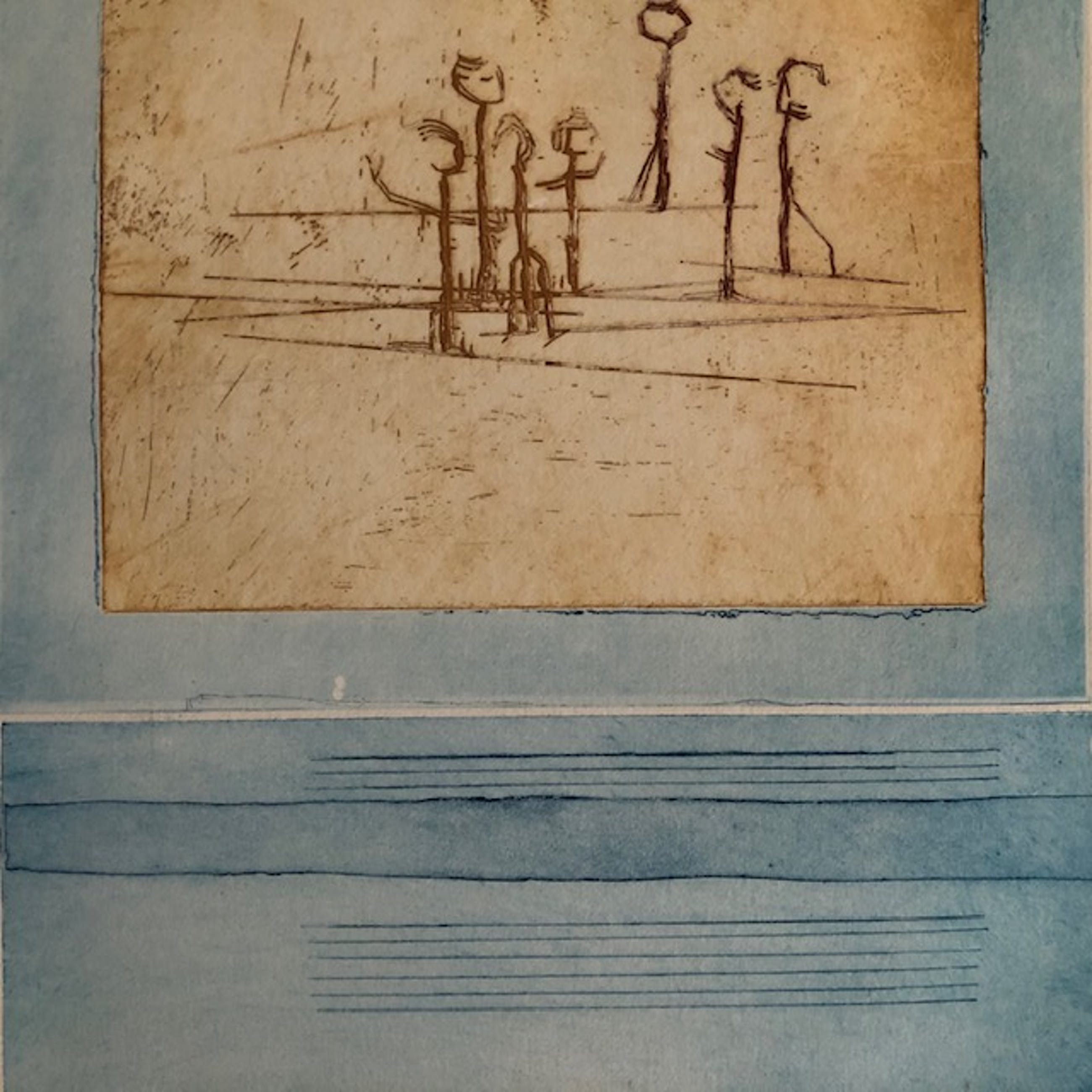 Licht verkleurd, vooral het passe-partout heeft slijtplekjes. Papier is licht bobbelig. Lijst heeft gebruikssporen.