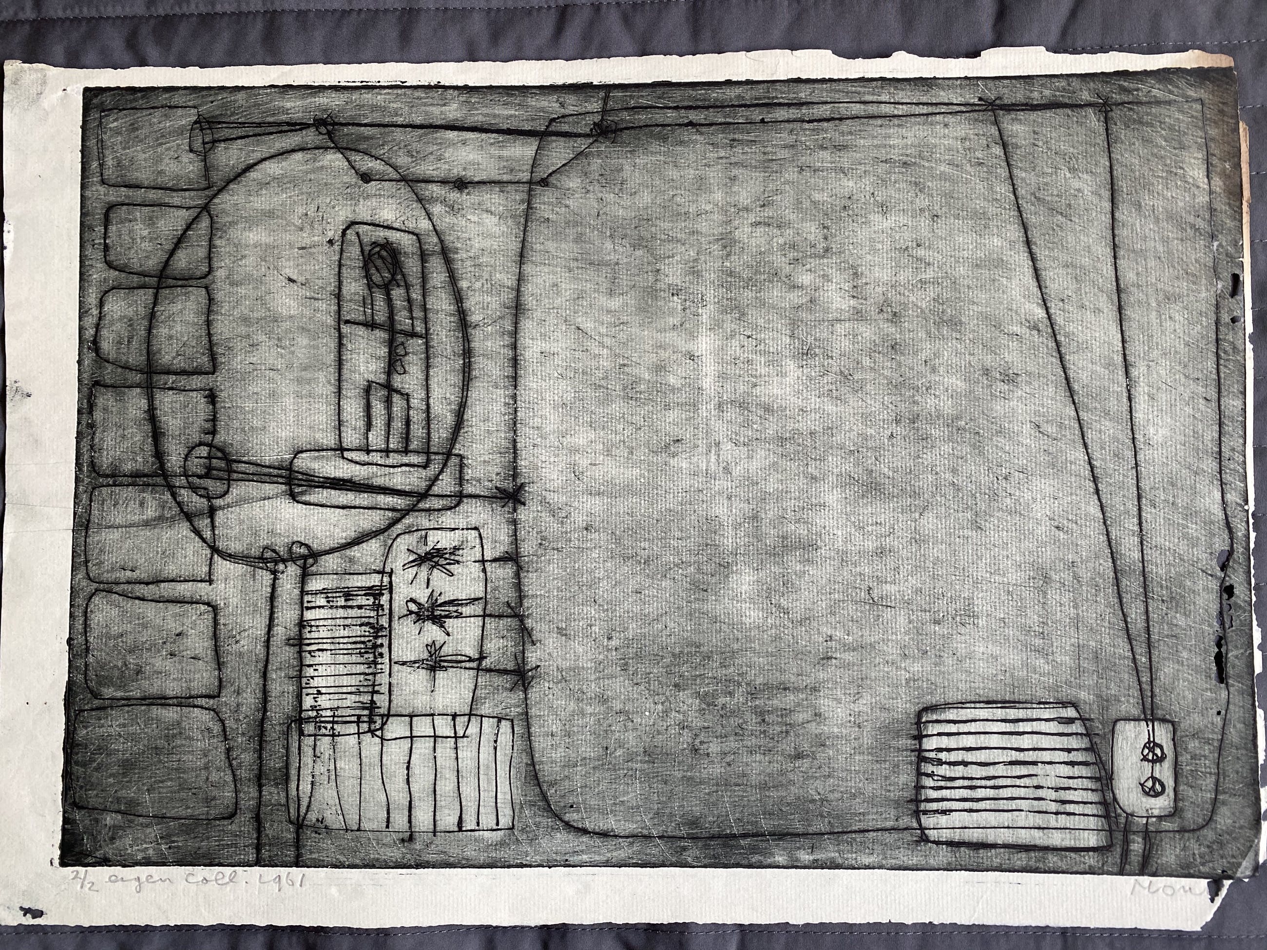 Leuke ets, helaas beschadigd. Waarschijnlijk door etszuur. Kleine oplage 2/2 1961. Voor liefhebbers en kenners een waardevolle toevoeging. Vroeg werk, gedrukt op dun papier.