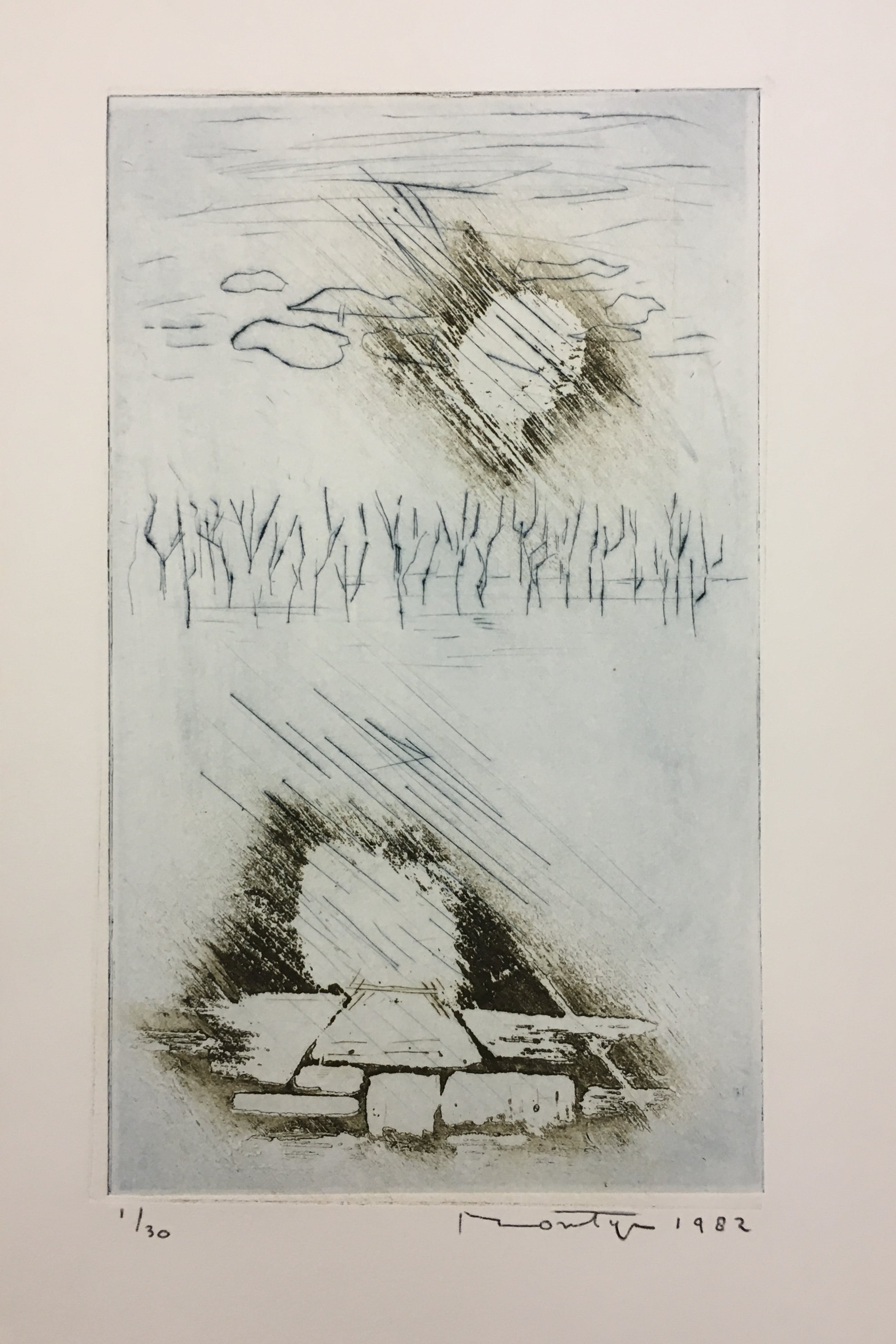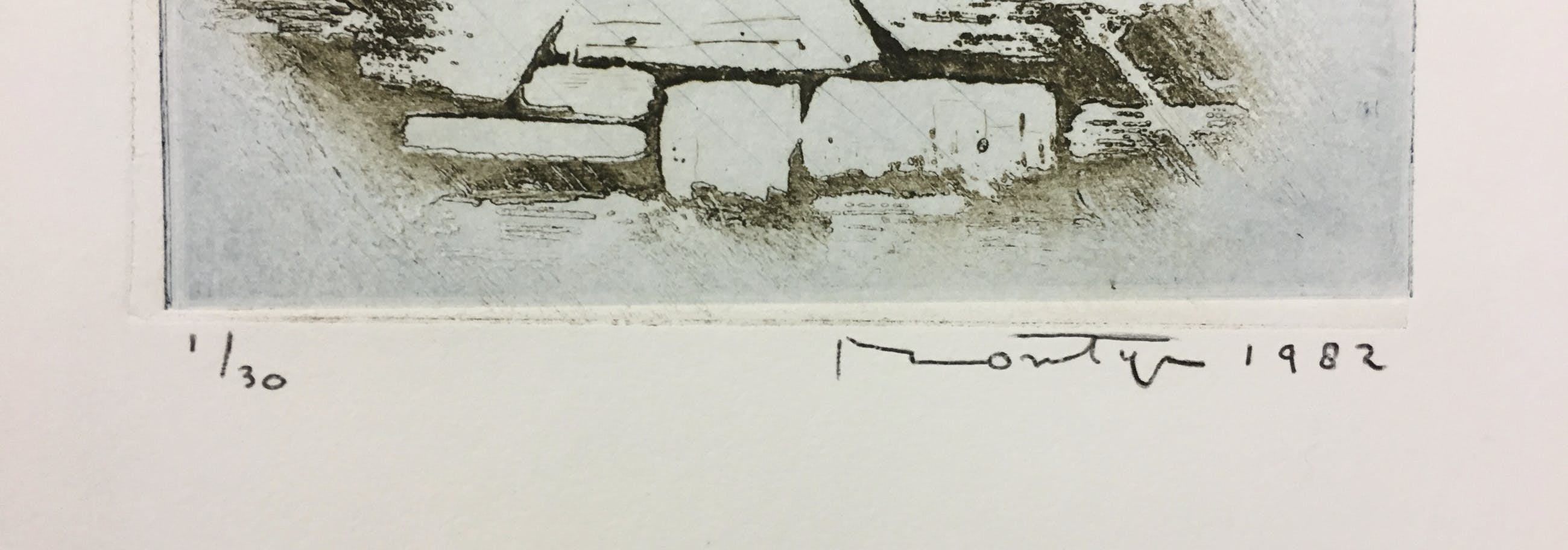 Bijzondere kleuren ets van Montyn. “Winterlandschap” In prachtige staat. Uit 1982.