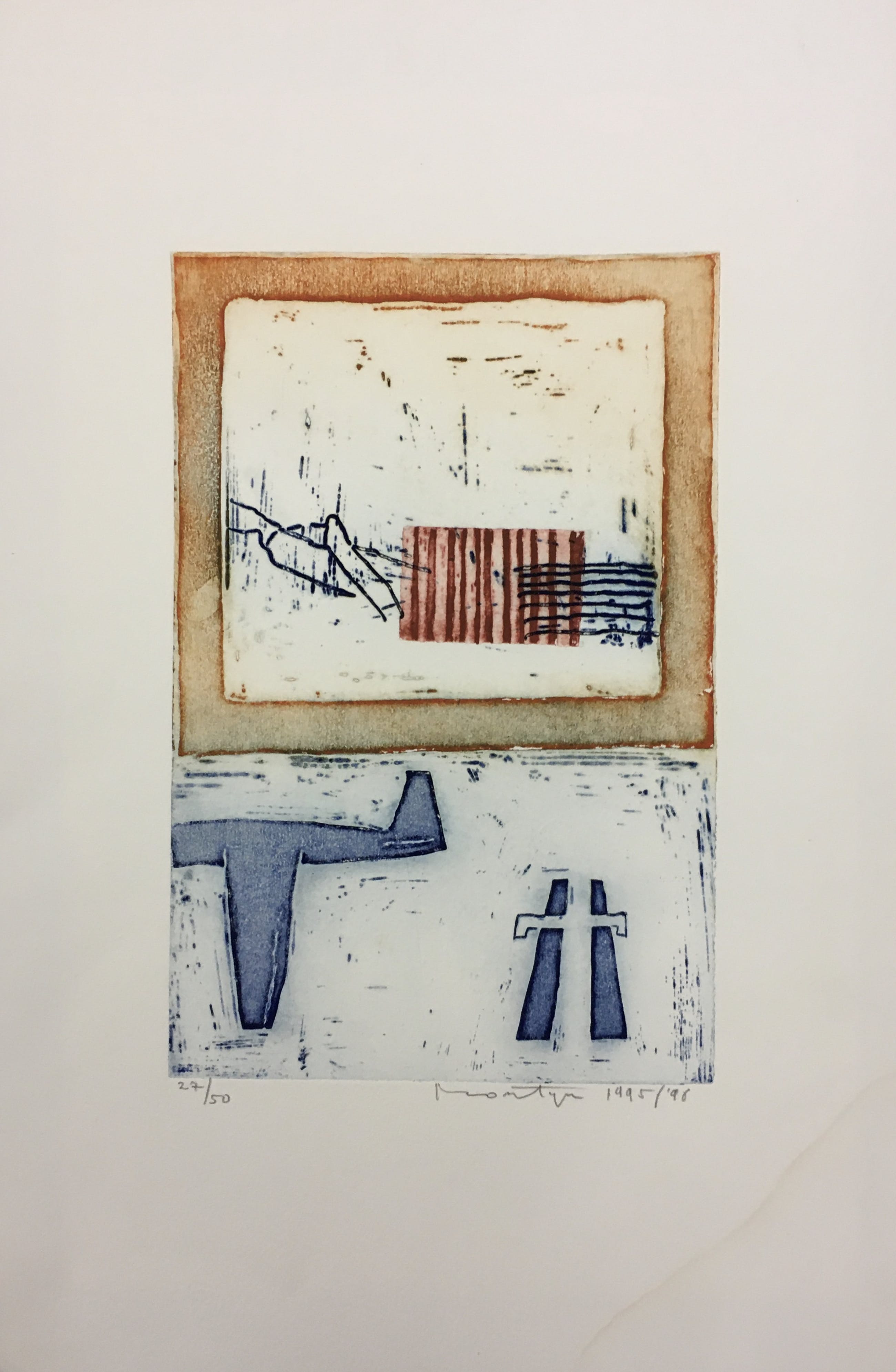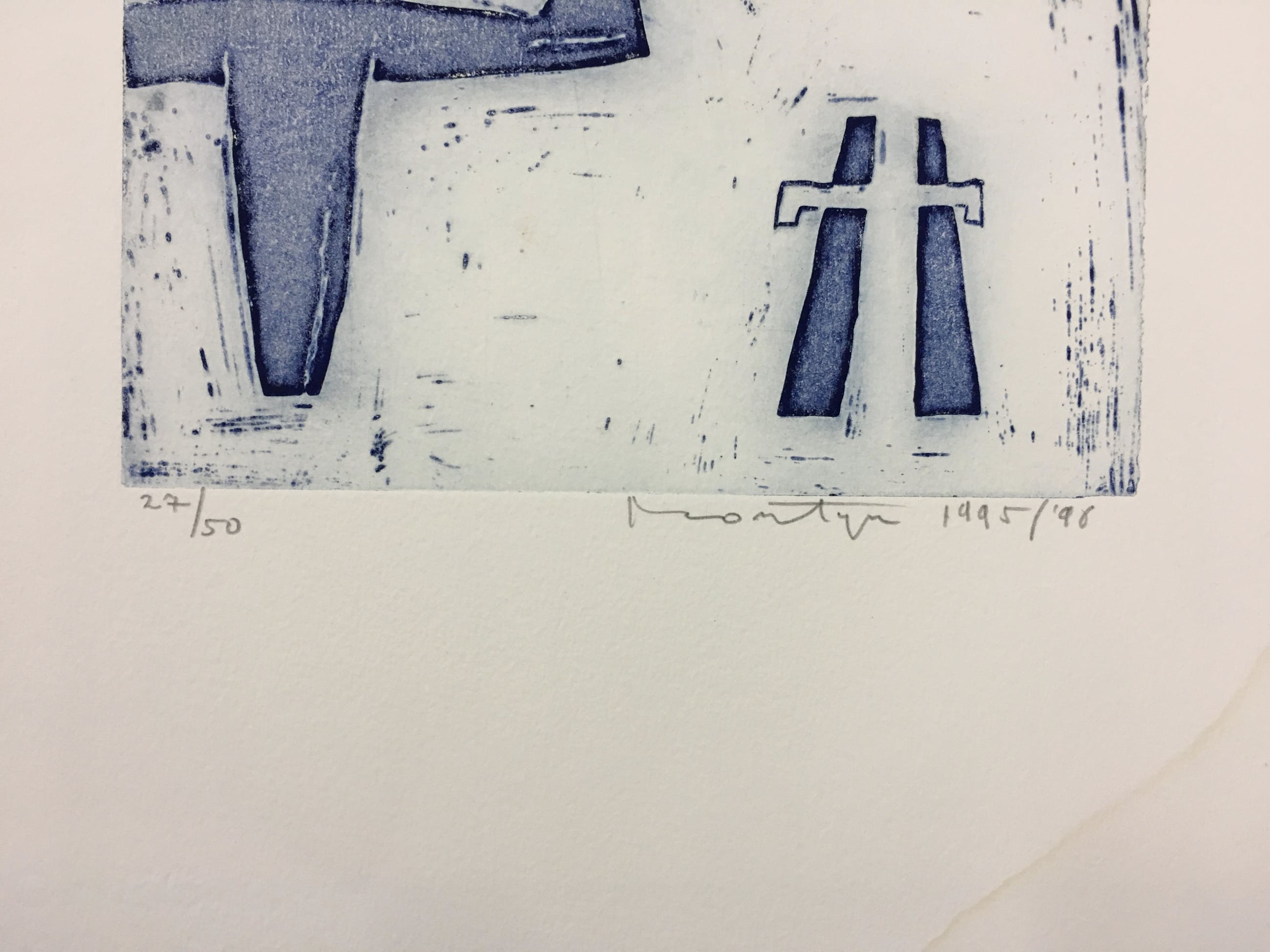 Mooie kleuren ets van Montyn. Op het hoekje rechts onder wat vochtschade zoals te zien op de foto. Voor de rest in perfecte staat.