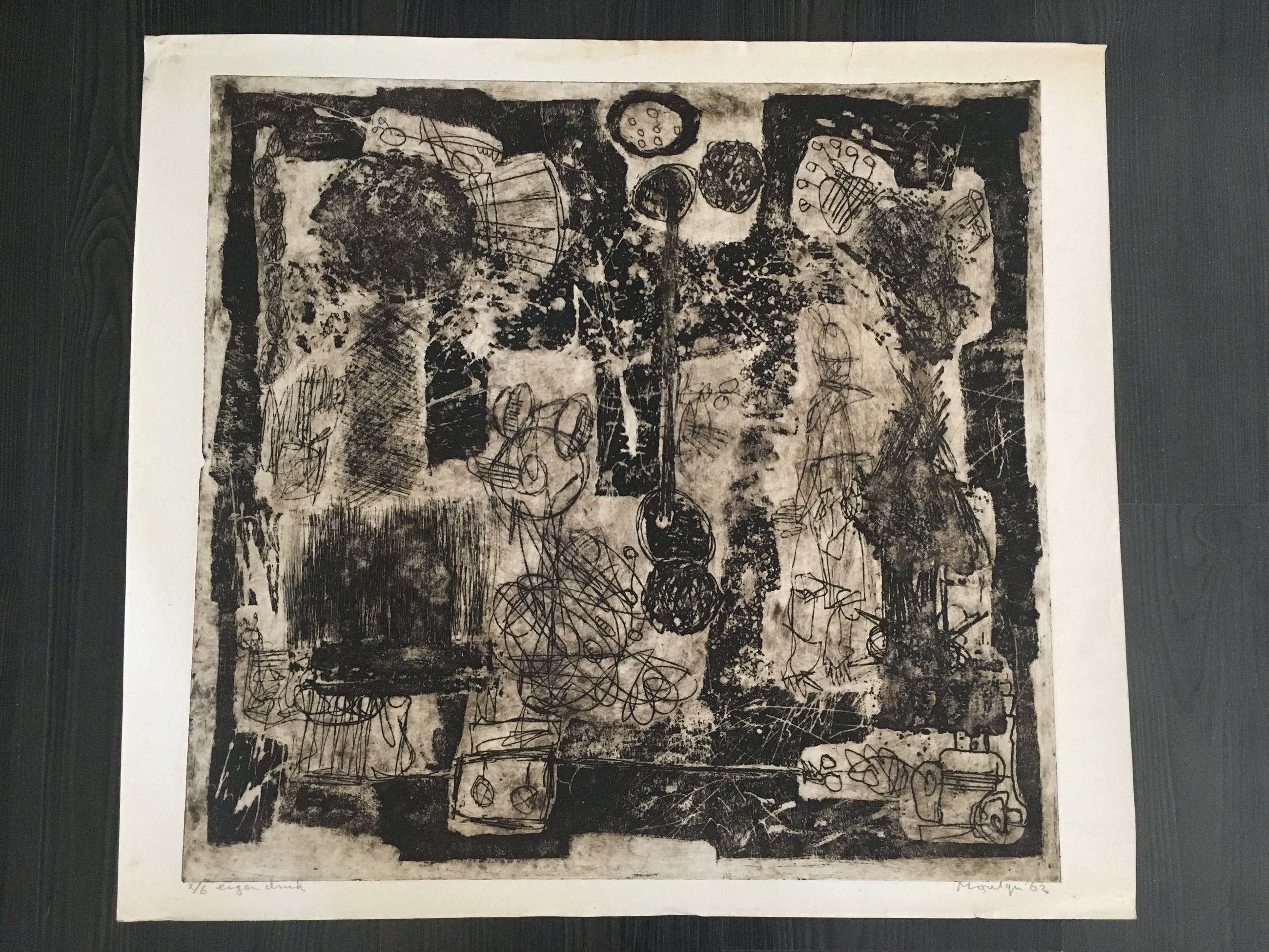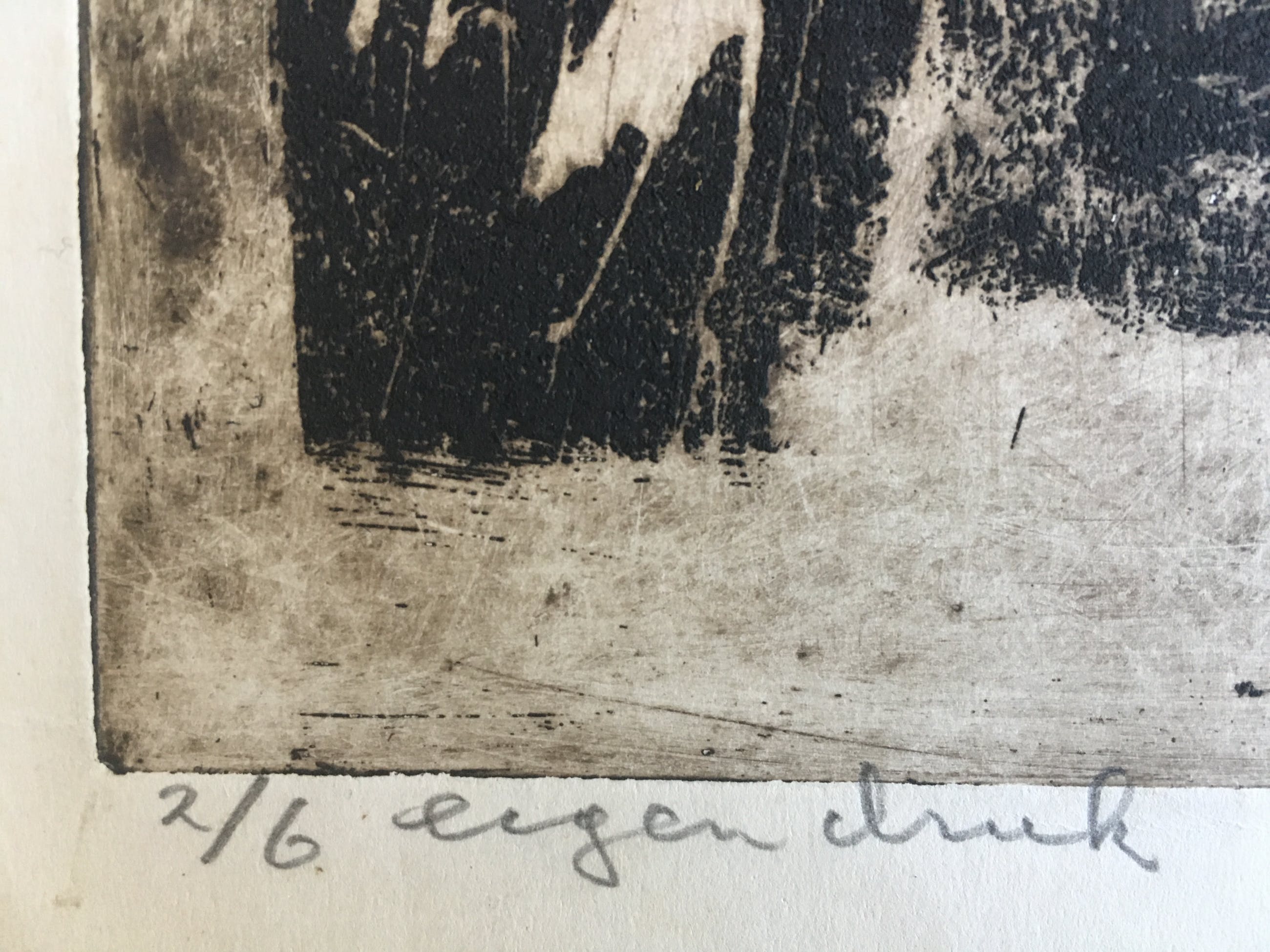 Fraaie ets uit 1962 oplage 2/6 eigen druk.Verkregen uit nalatenschap. De randen zijn oud en de bovenrand heeft een klein scheurtje, maar in passe partout valt dit weg.Zal ingelijst erg mooi op de wand staan.Voor de liefhebber.