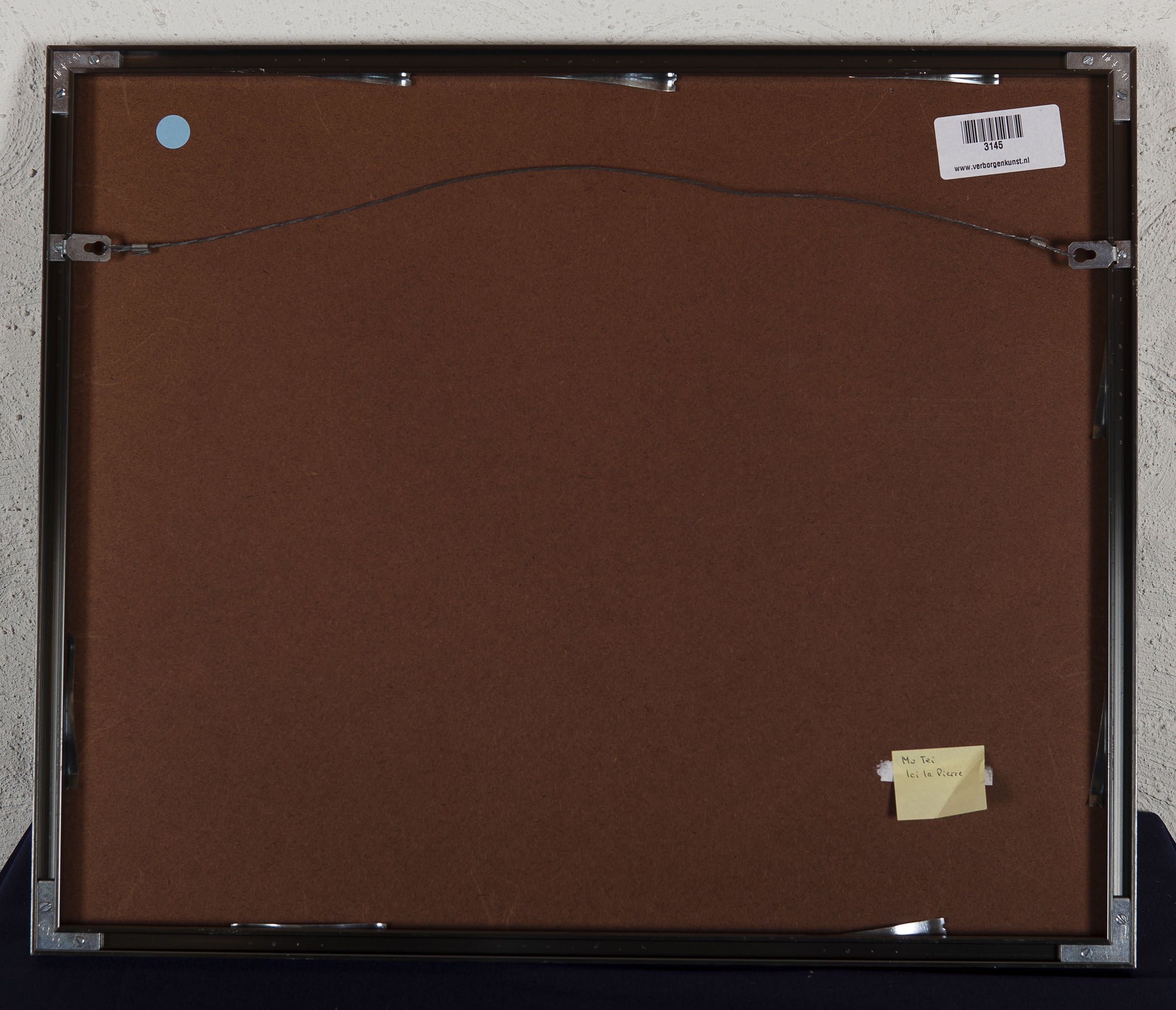 | Er zit een Post-it op de achterzijde met de titel - blad is verschoven in lijst en heeft minuscule bruine vlekken aan bovenzijde - glasplaat gebroken in l.o. hoek | |