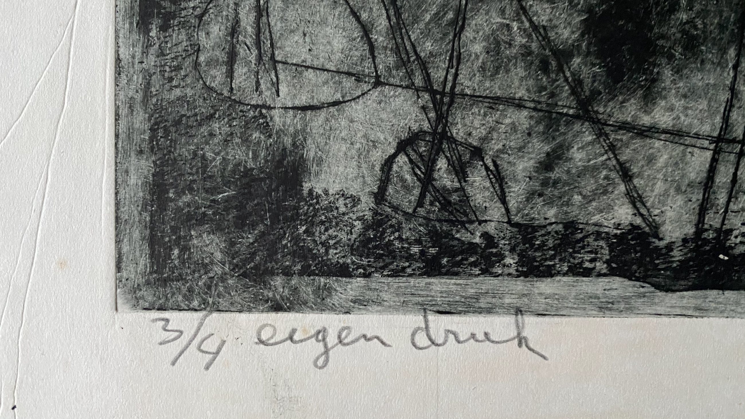 Uit nalatenschap verkregen ets van Jan Montyn uit 1963. Titel: nieuw portret. Oplage 3/4 eigen druk. Een fraaie voorstelling en gezien de ouderdom in goede staat. De gele rand zal grotendeels wegvallen in een passe-partout. Voor de liefhebber.