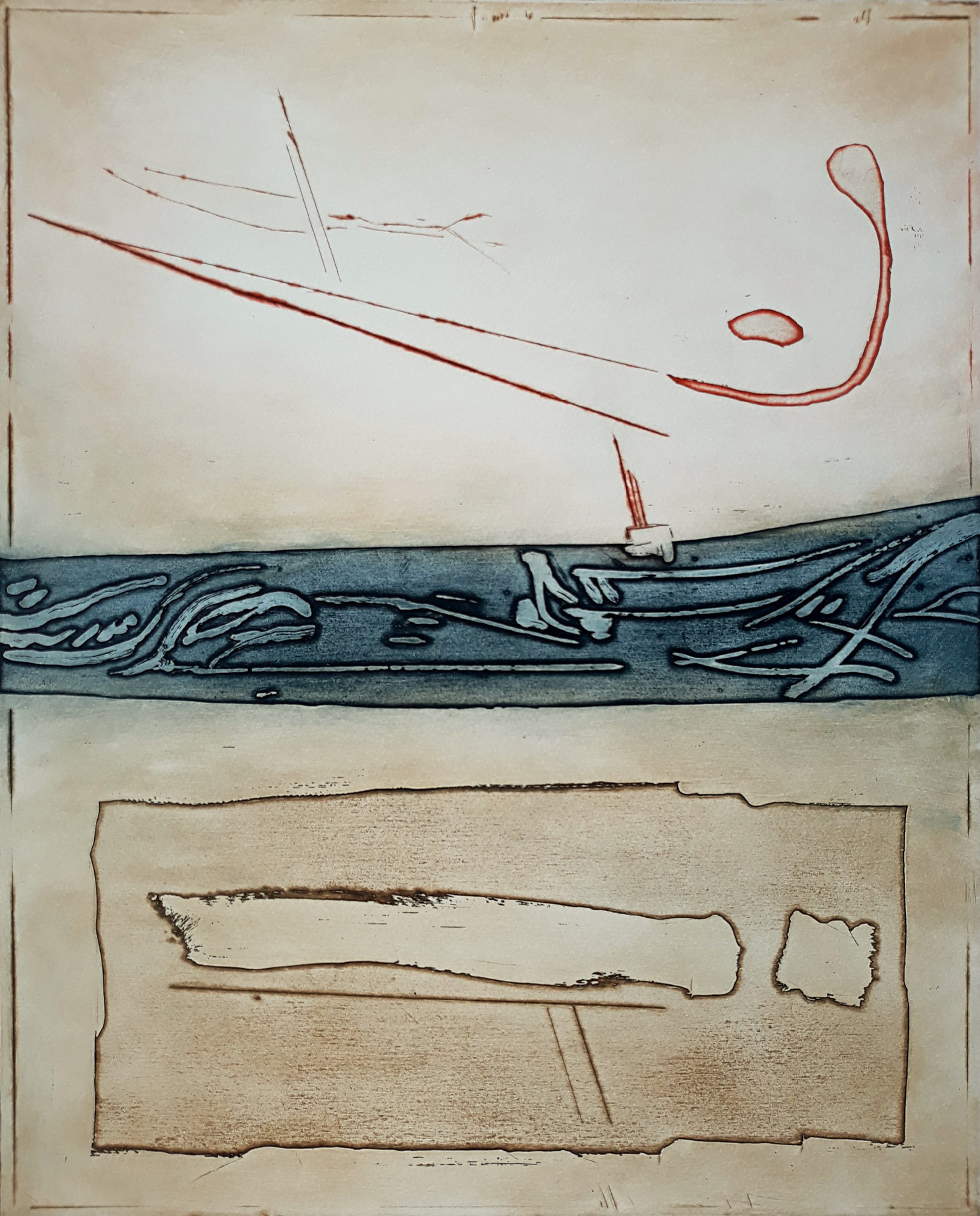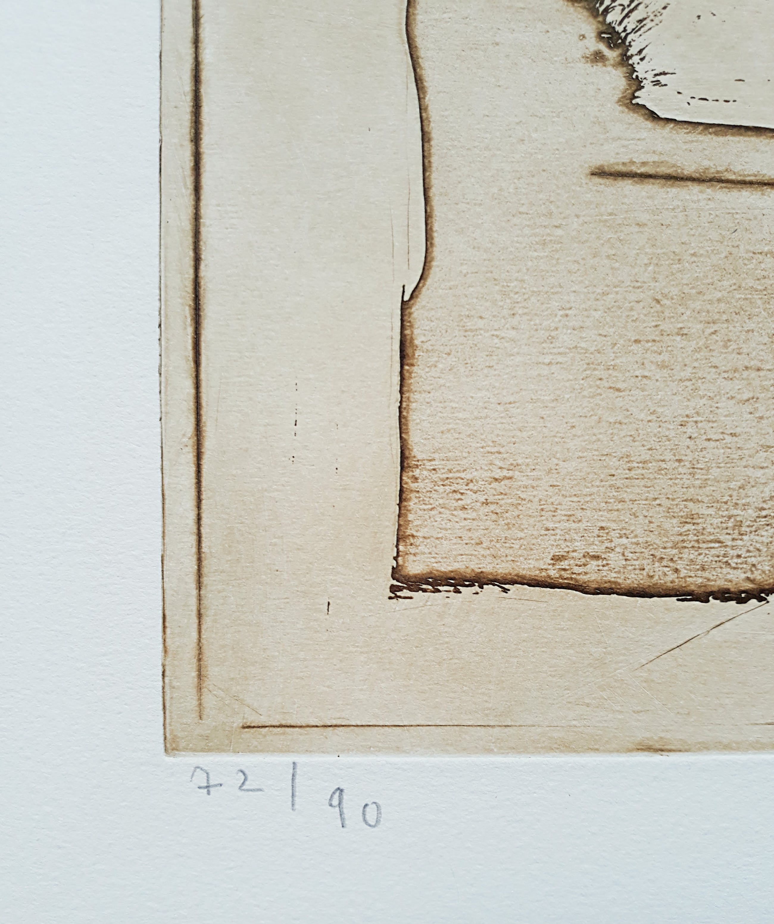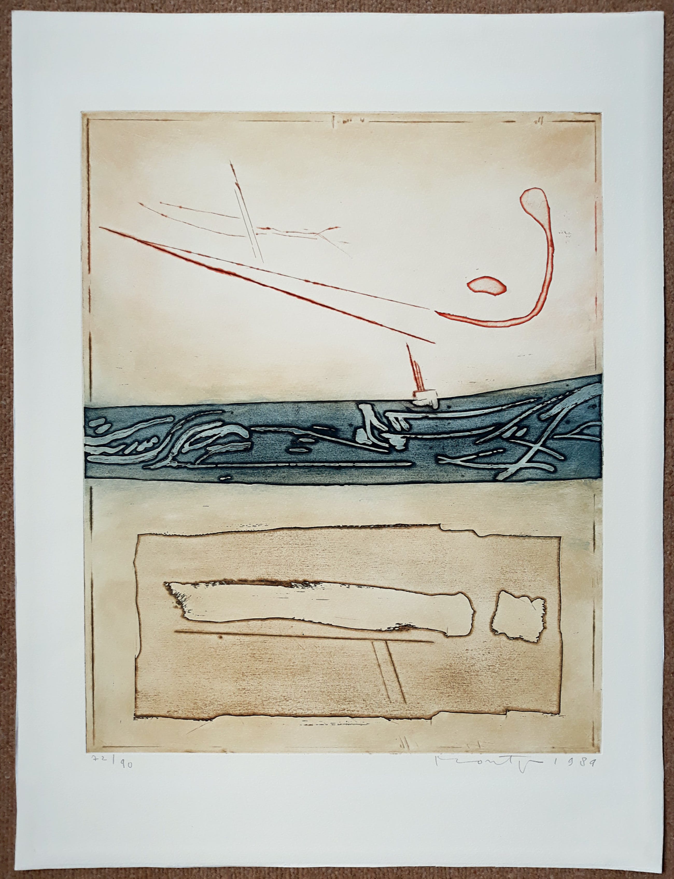 Mooie, karakteristieke compositie Jan Montyn uit 1989. Aquatint ets op Arches papier, met potlood gesigneerd, gedateerd en genummerd (72/90). Afkomstig uit de kunstcollectie van ABNAMRO; in zeer goede conditie. Blad heeft ingelijst gezeten want er zit tape langs de randen aan de achterkant van het blad en er is een nauwelijks waarneembare verkleuring van het blad binnen een vorig passe-partout. Opnieuw ingelijst met nieuw passe-partout is het werk uitstekend.