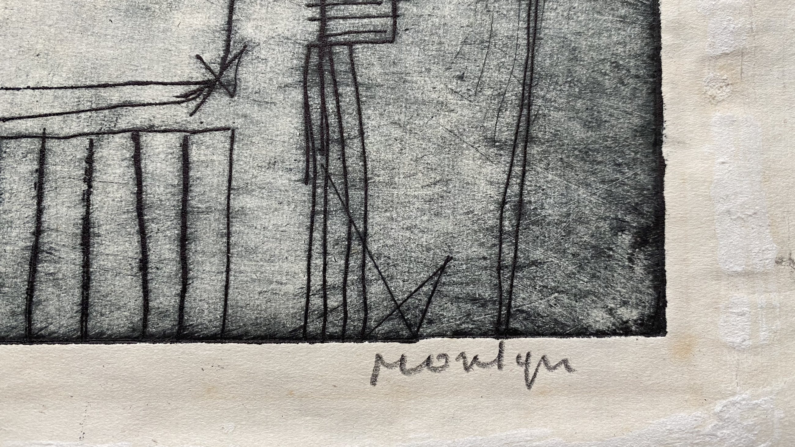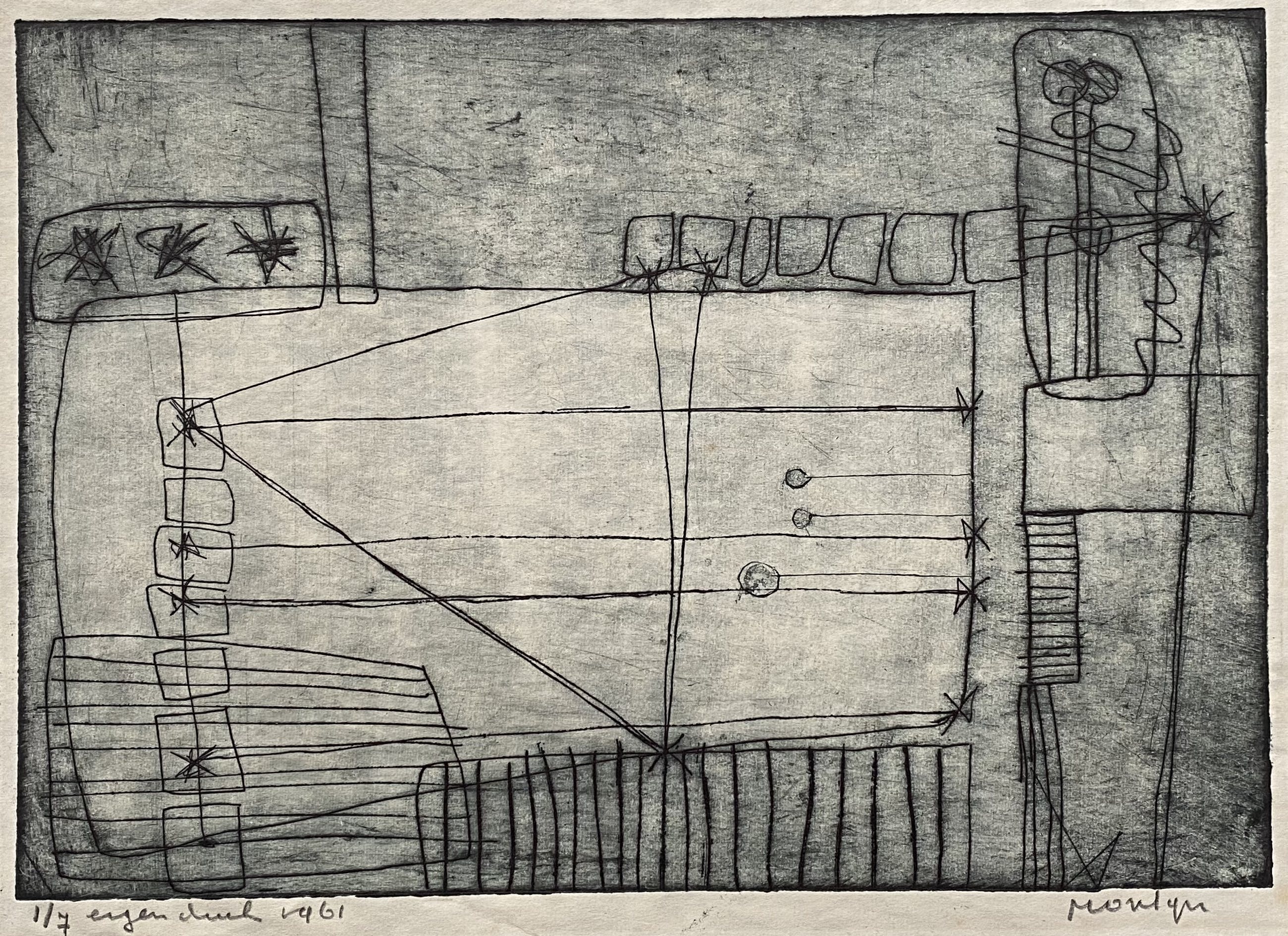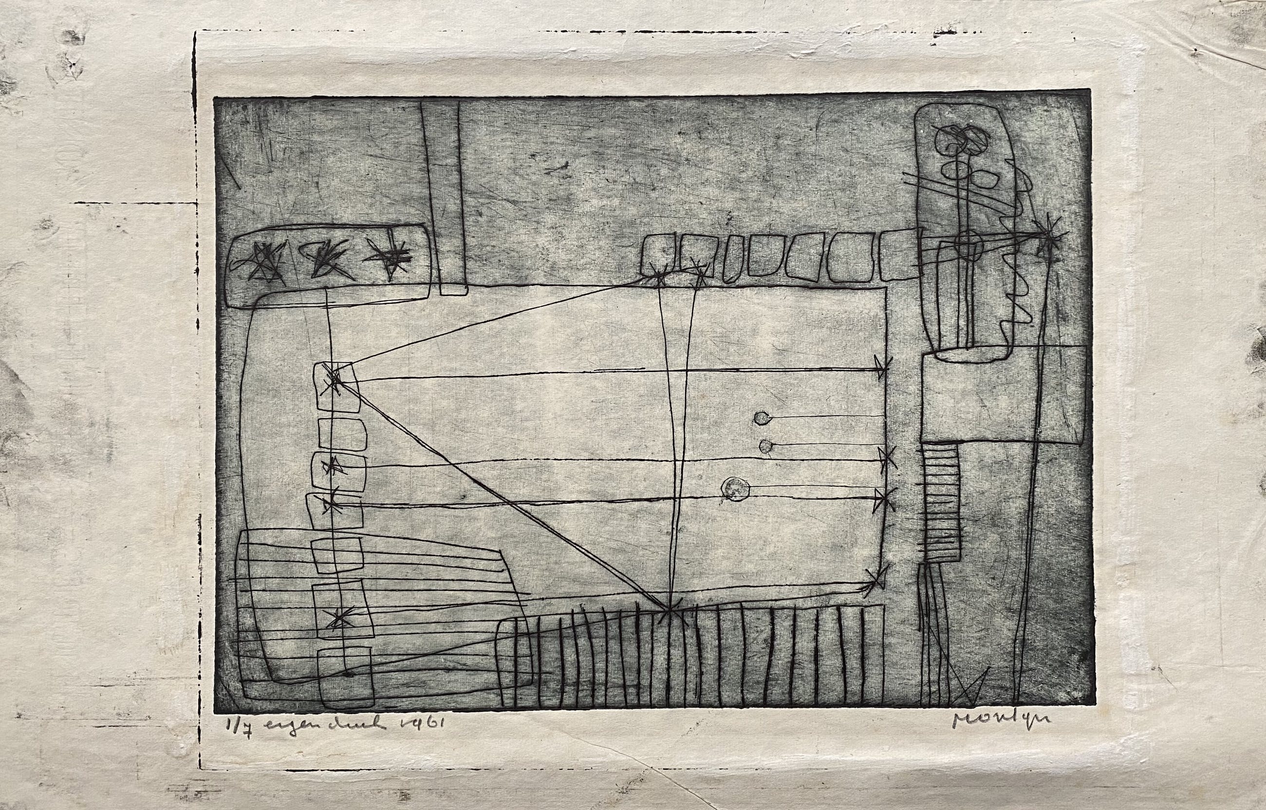 Uit nalatenschap verkregen prachtige ets uit 1961 van Jan Montyn. Oplage 1/7 eigen druk. De ets is gedrukt op dun papier en in goede staat. Wat lijmresten, omdat de ets ingelijst is geweest. Maar in een passe-partout zal de ets prachtig staan aan de wand. Voor een liefhebber.