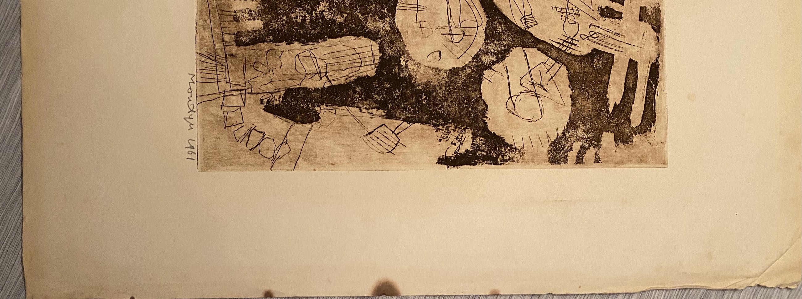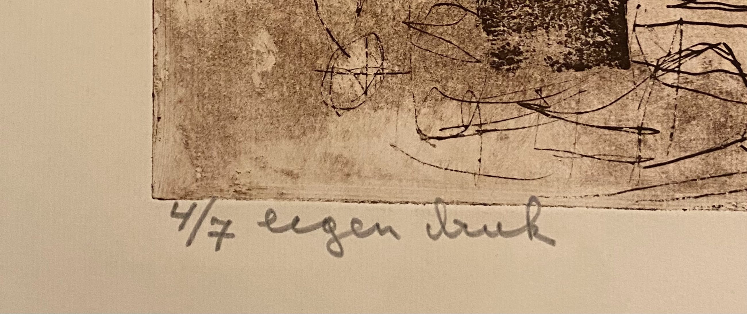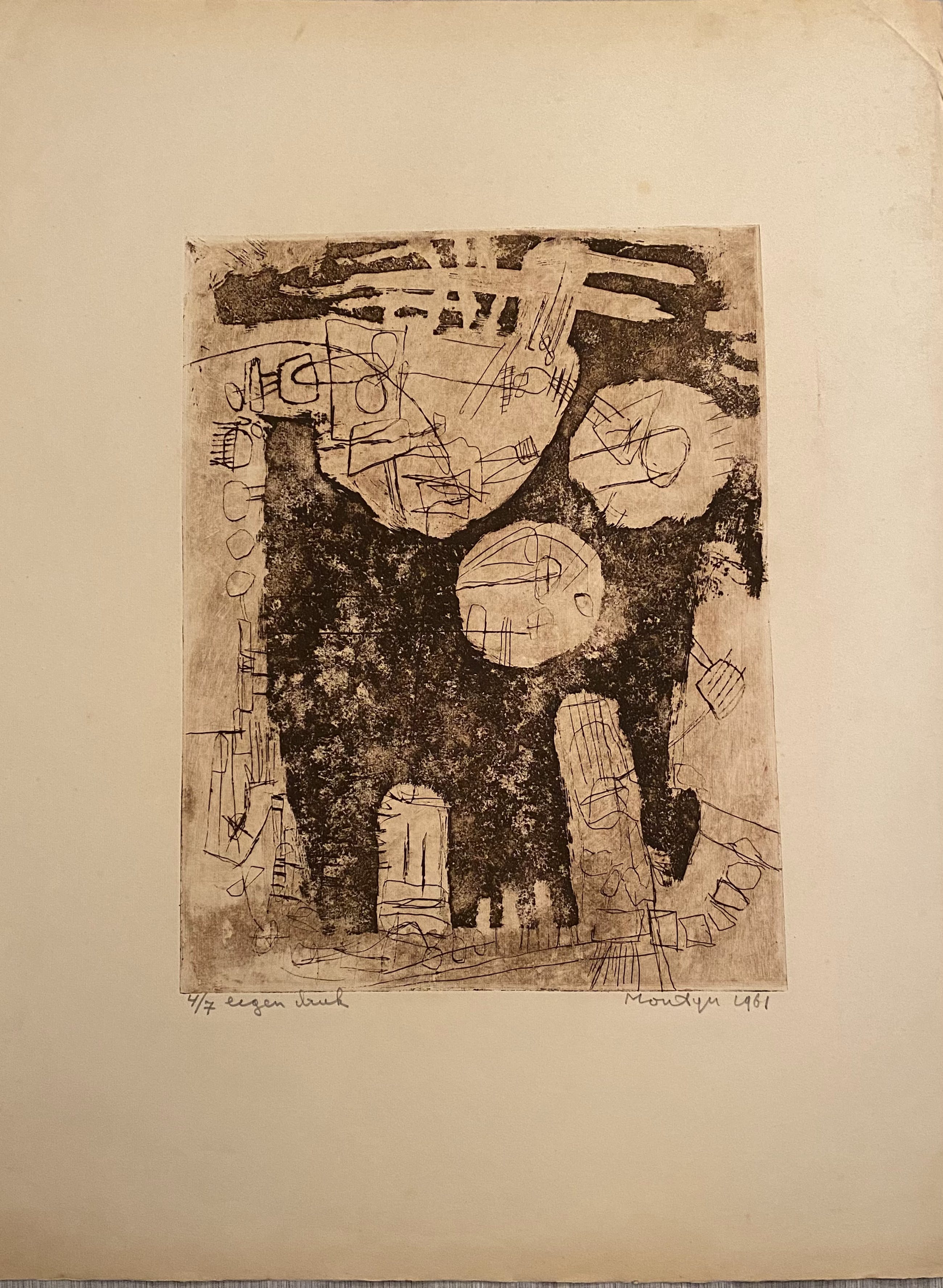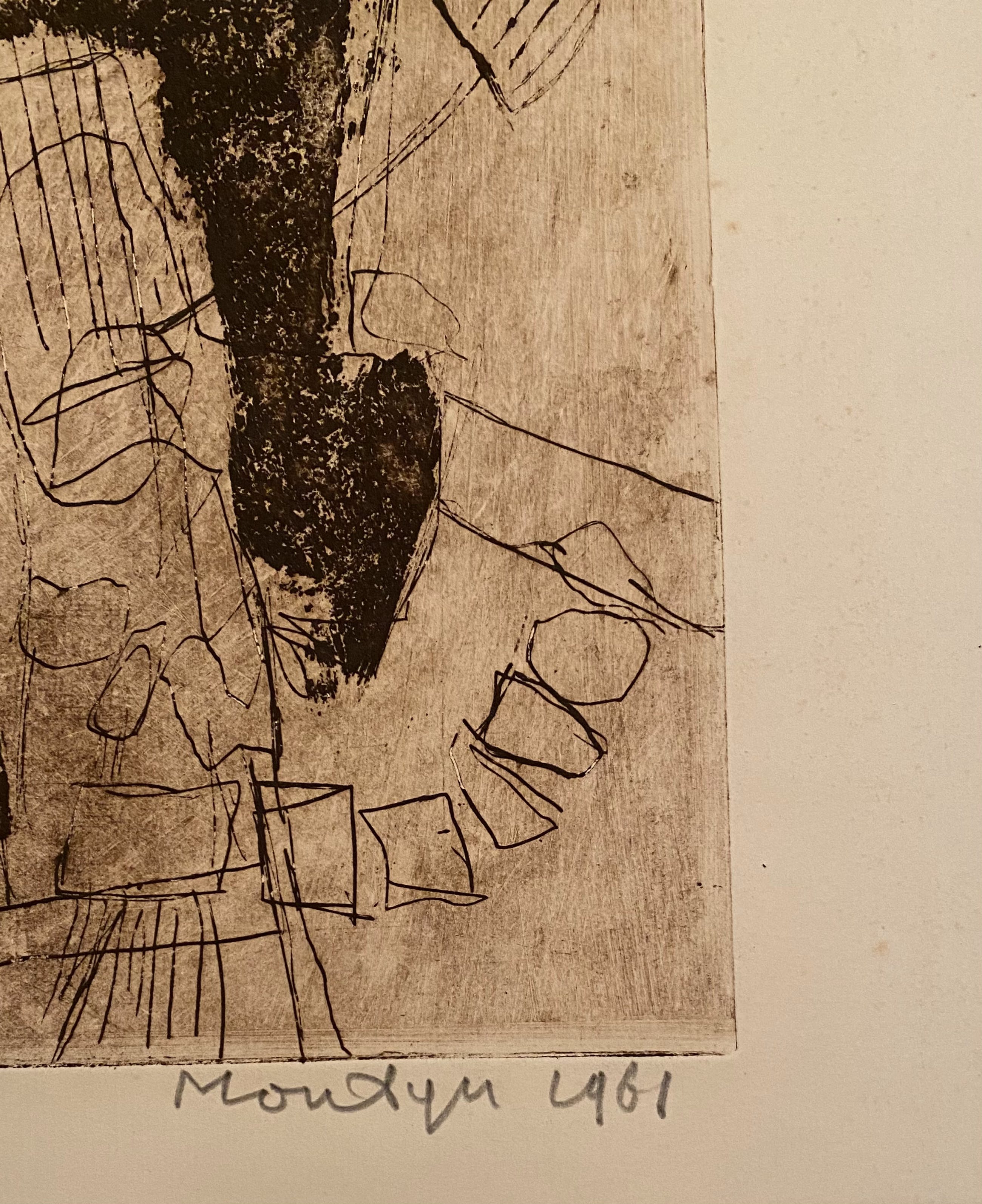 Uit nalatenschap verkregen ets van Jan Montyn uit 1961. Oplage 4/7 eigen druk. De fraaie ets is getiteld 'Opbouw'. De afmetingen van de prent zijn 39 hoog en 30 breed. Inclusief rand 65 hoog en 51 breed. Voor de liefhebber.