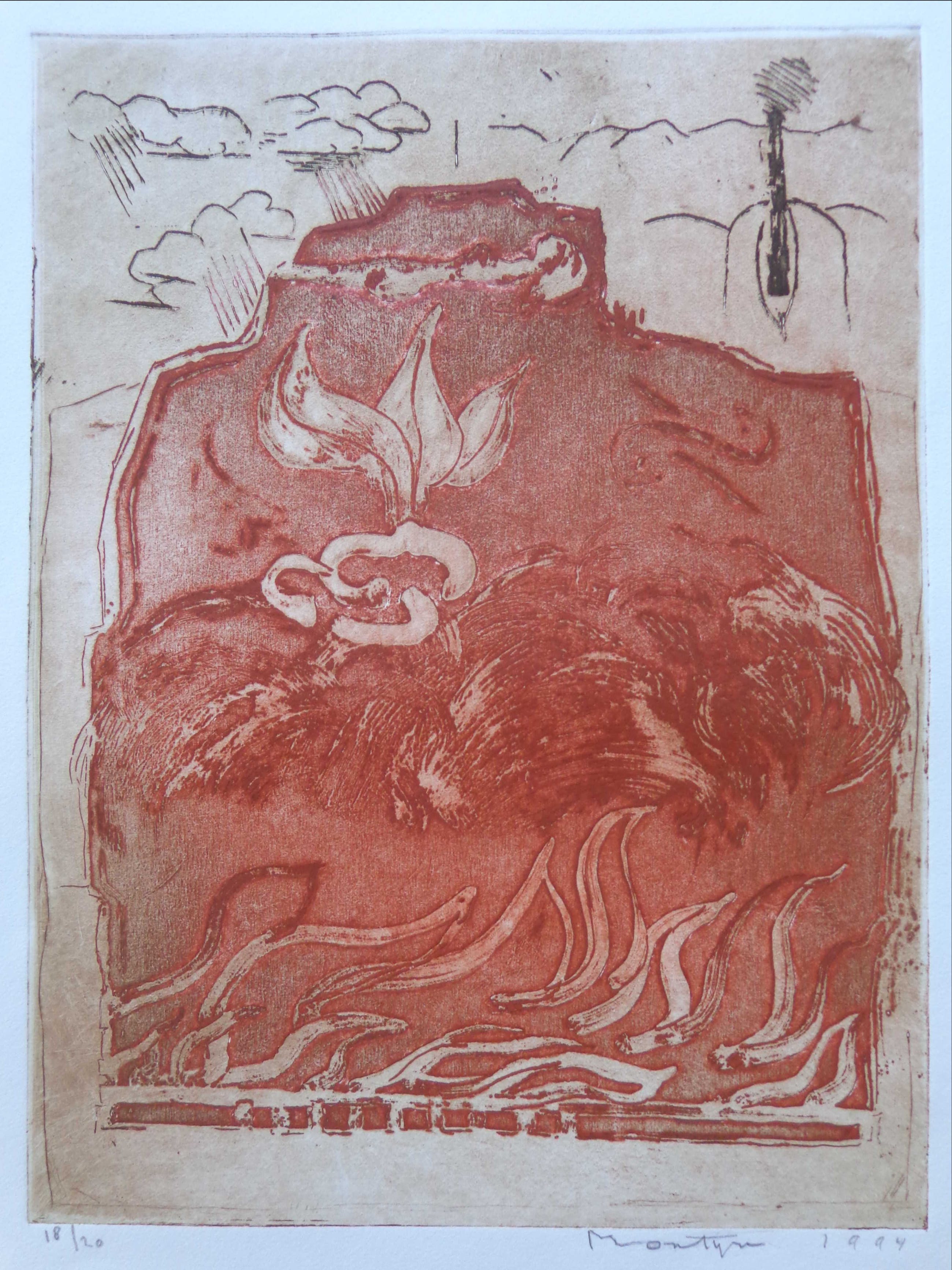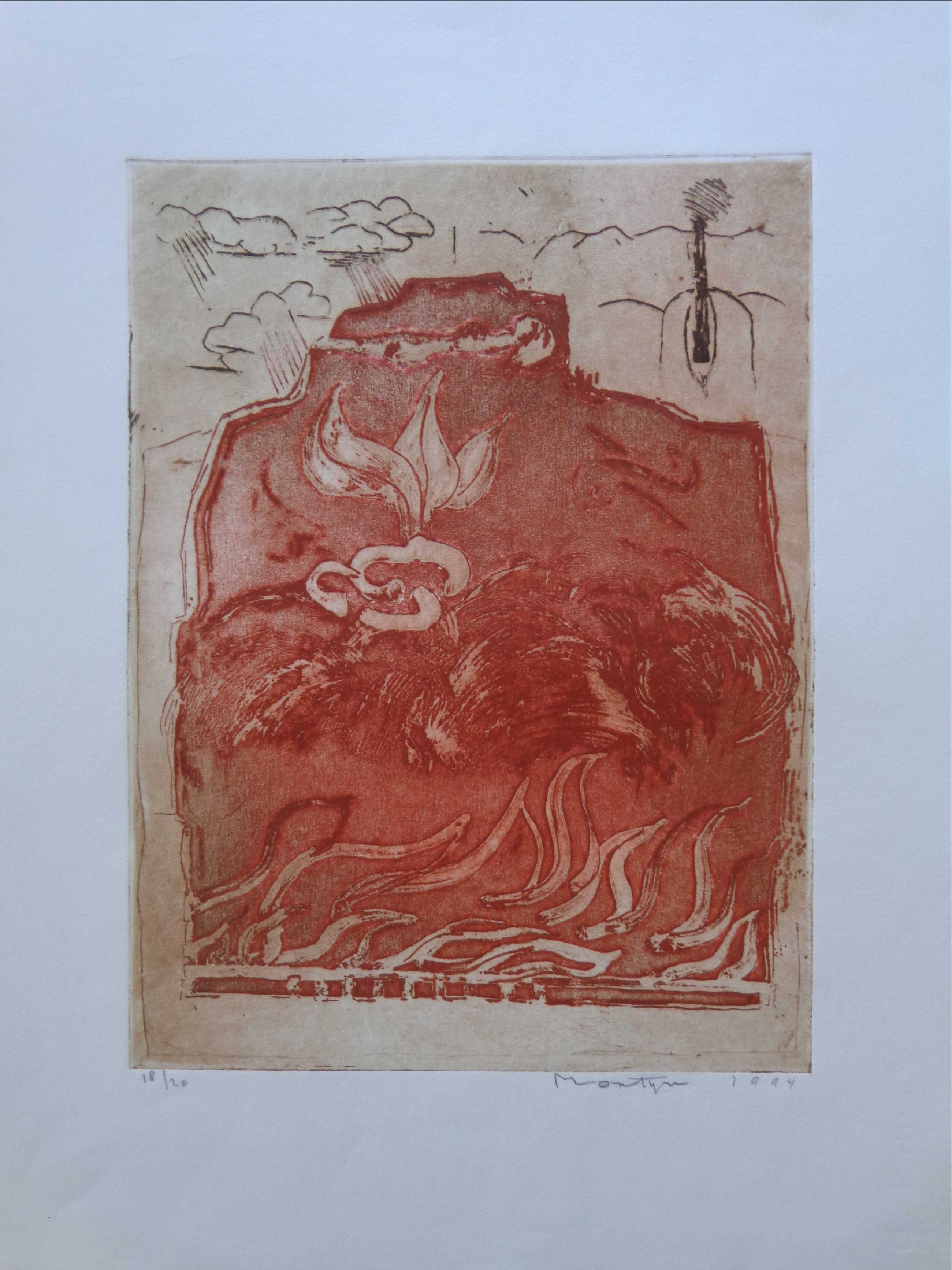 Jan Montyn (1924-2015). Titel: "Pokhara I Nepal". Kleurets op papier. Gesigneerd met potlood. Ex.nr. 18/20. 1994. Proper blad. Blad: 65x50cm. Niet ingelijst.