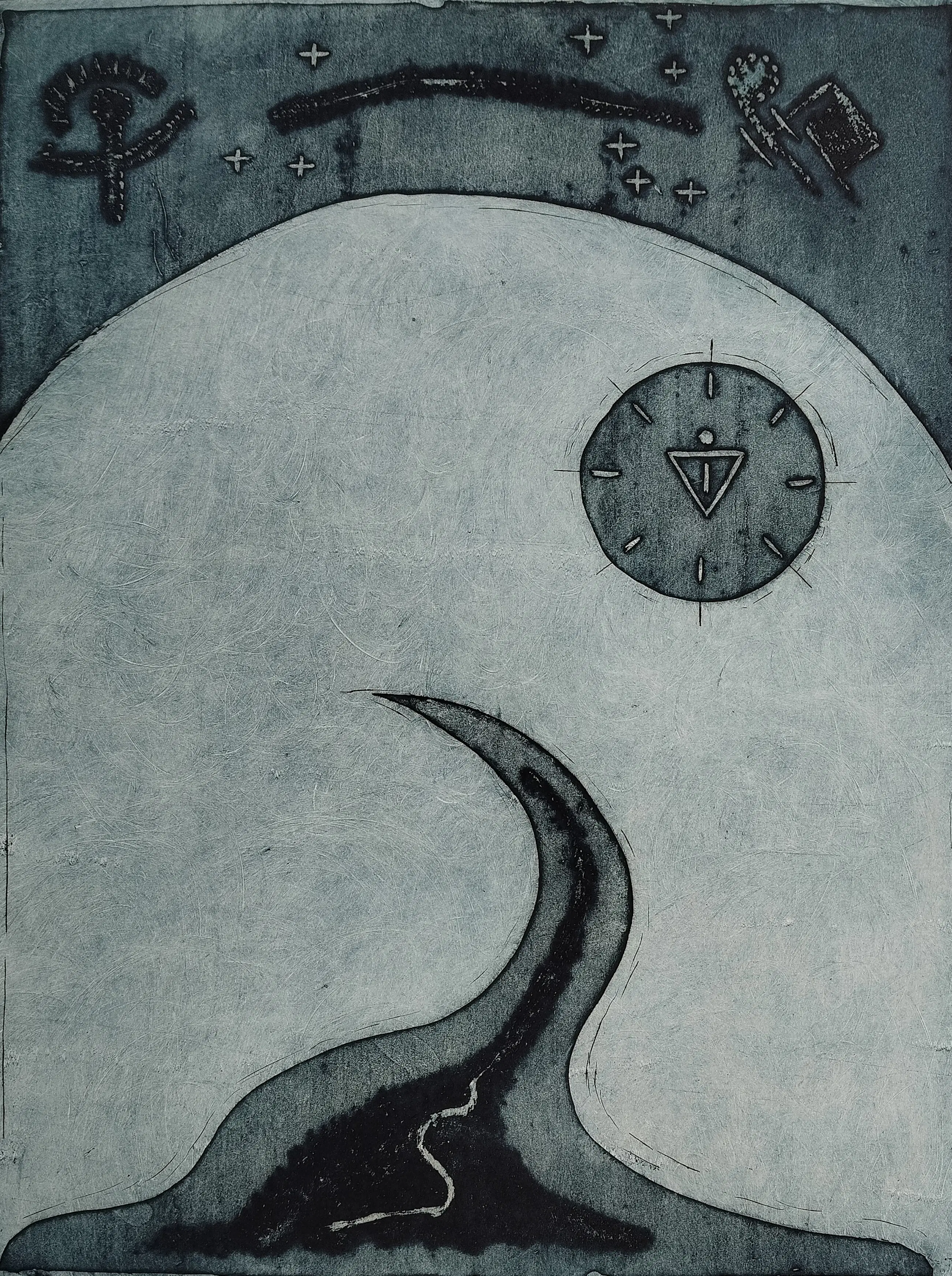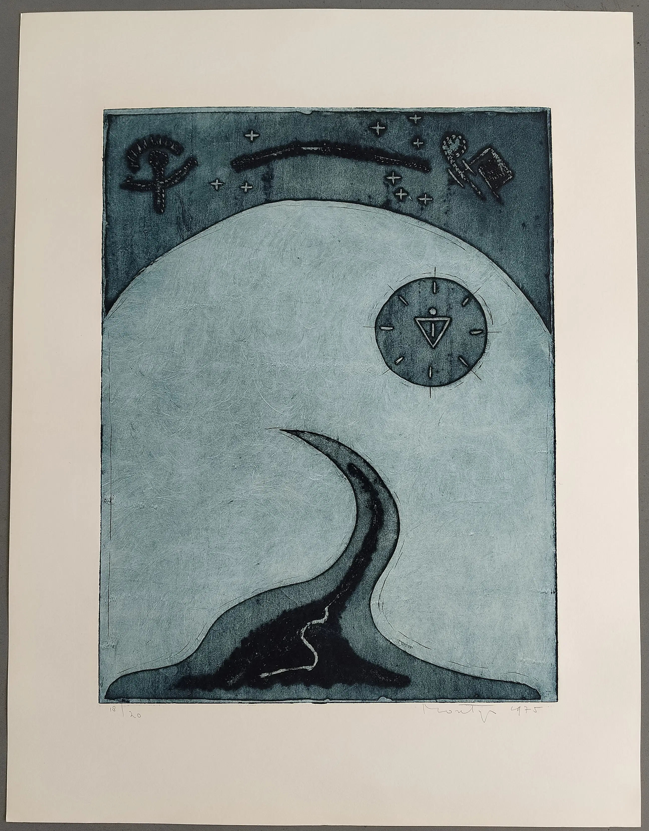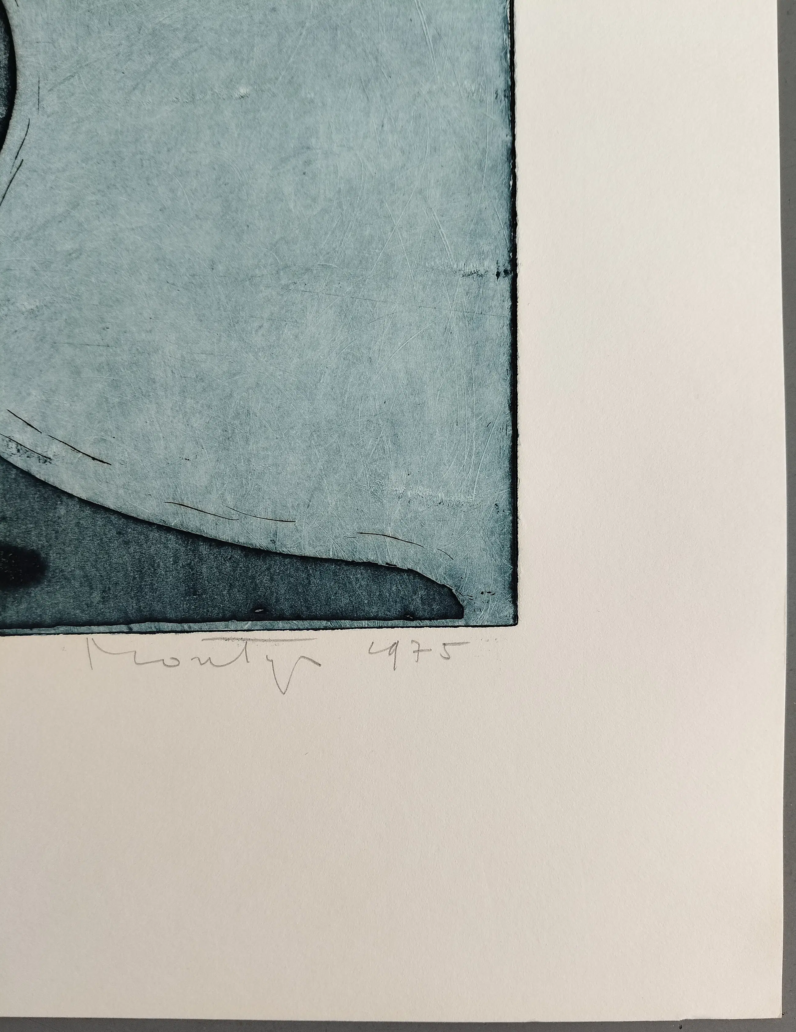 Gesigneerde ets van de kunstenaar Jan Montyn (1924 - 2015), gedrukt in 1975 met een oplage van 20 stuks. Rechtsonder is het werk gesigneerd in potlood met Montyn en gedateerd 1975, linksonder genummerd met 18/20. Papiermaat 64.5 x 49.5 cm. (hxb) Langs de randen zitten wat kleine lichte stoot kreukjes/vouwtjes. Verder is de ets in prima staat en is nooit ingelijst geweest.