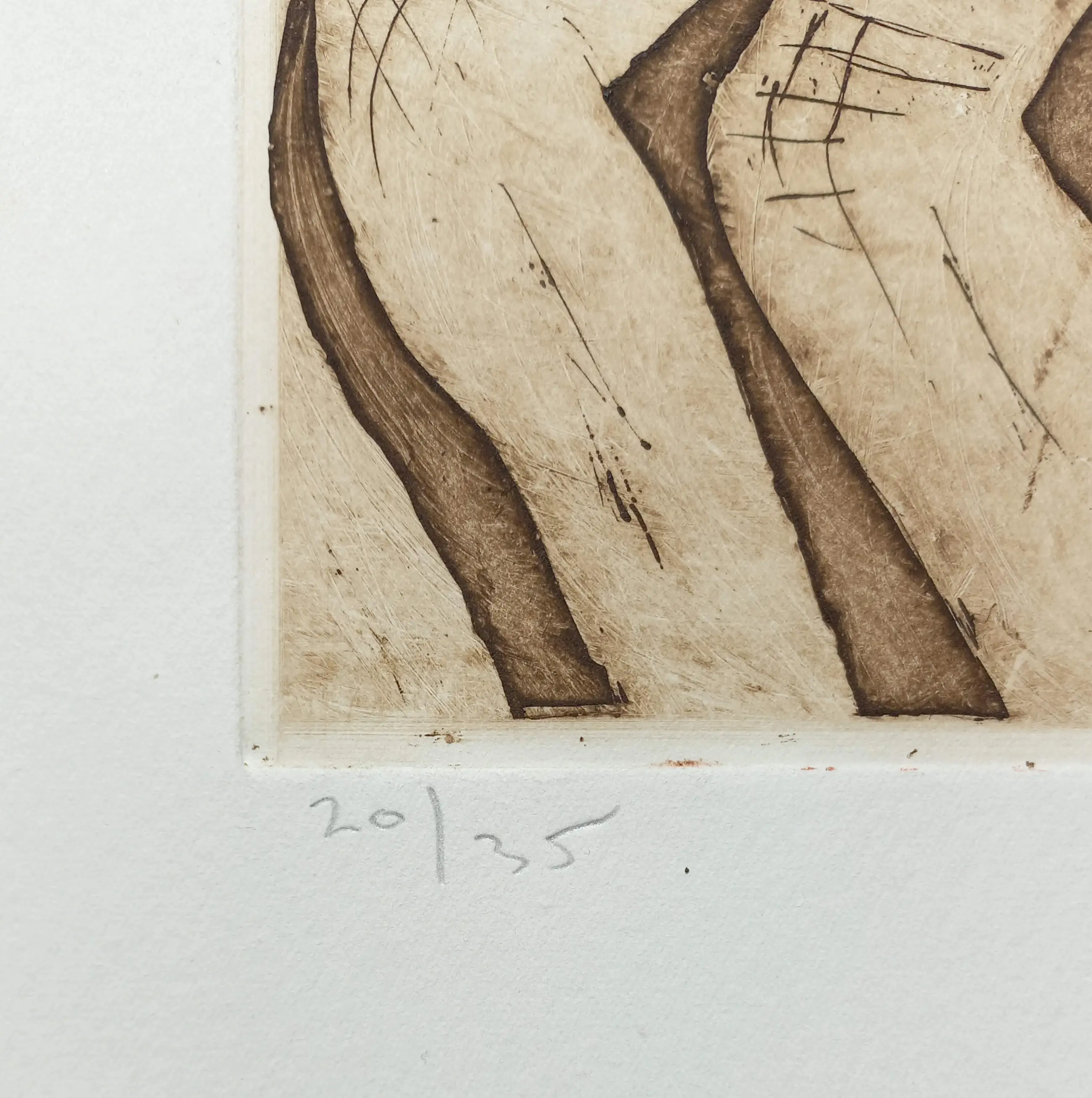 Zeer mooie compositie van Jan Montyn uit één van zijn beste periodes. Aquatint ets op geschept papier, met potlood gesigneerd, gedateerd (1976) en genummerd (20/35). In zeer goede conditie.