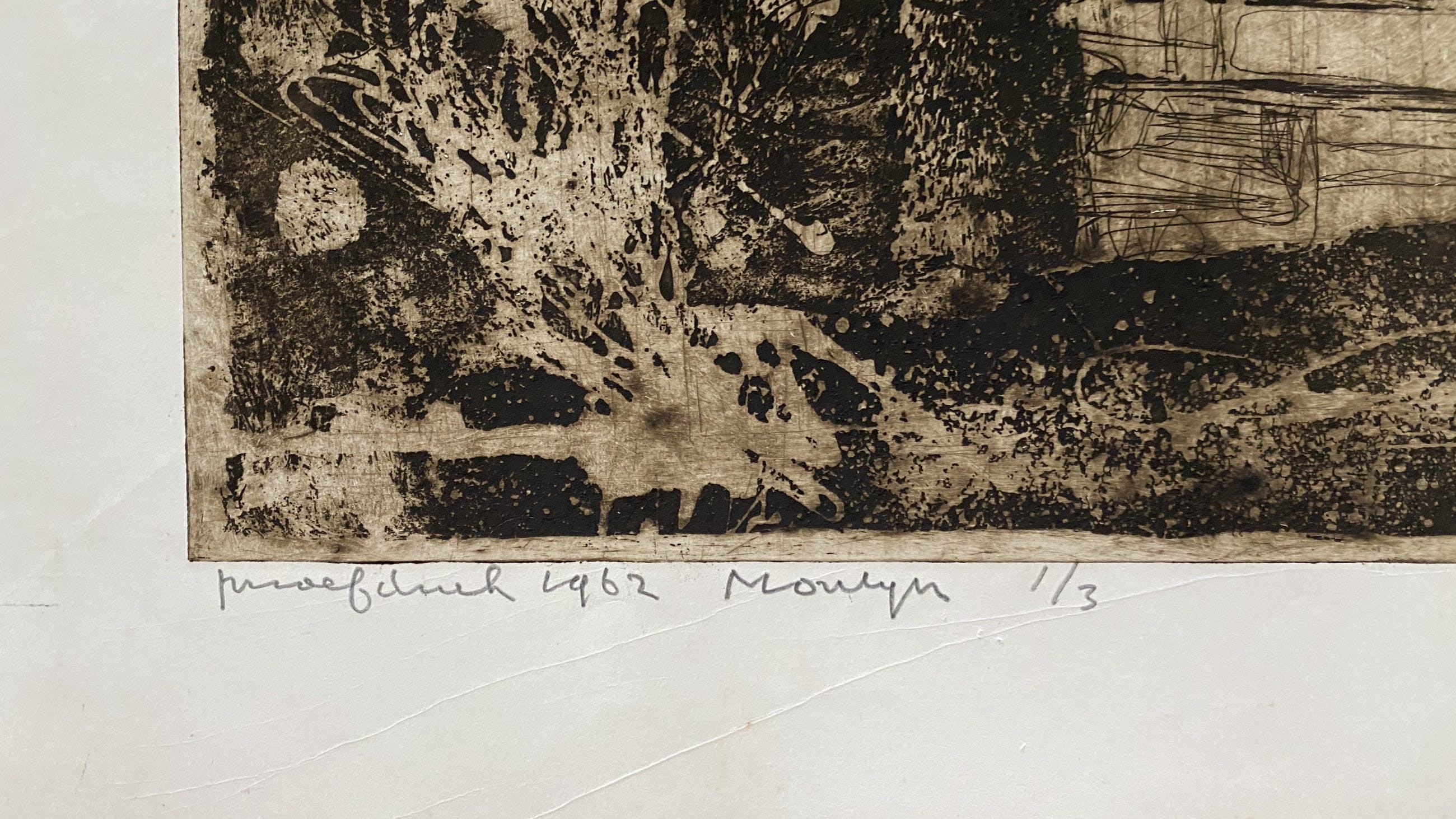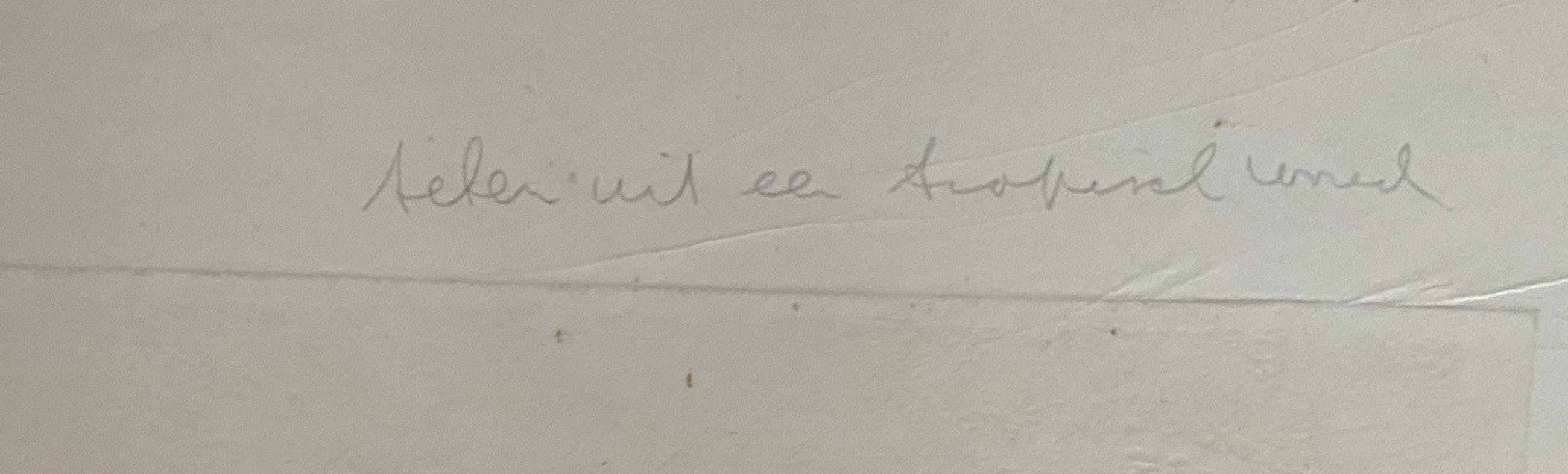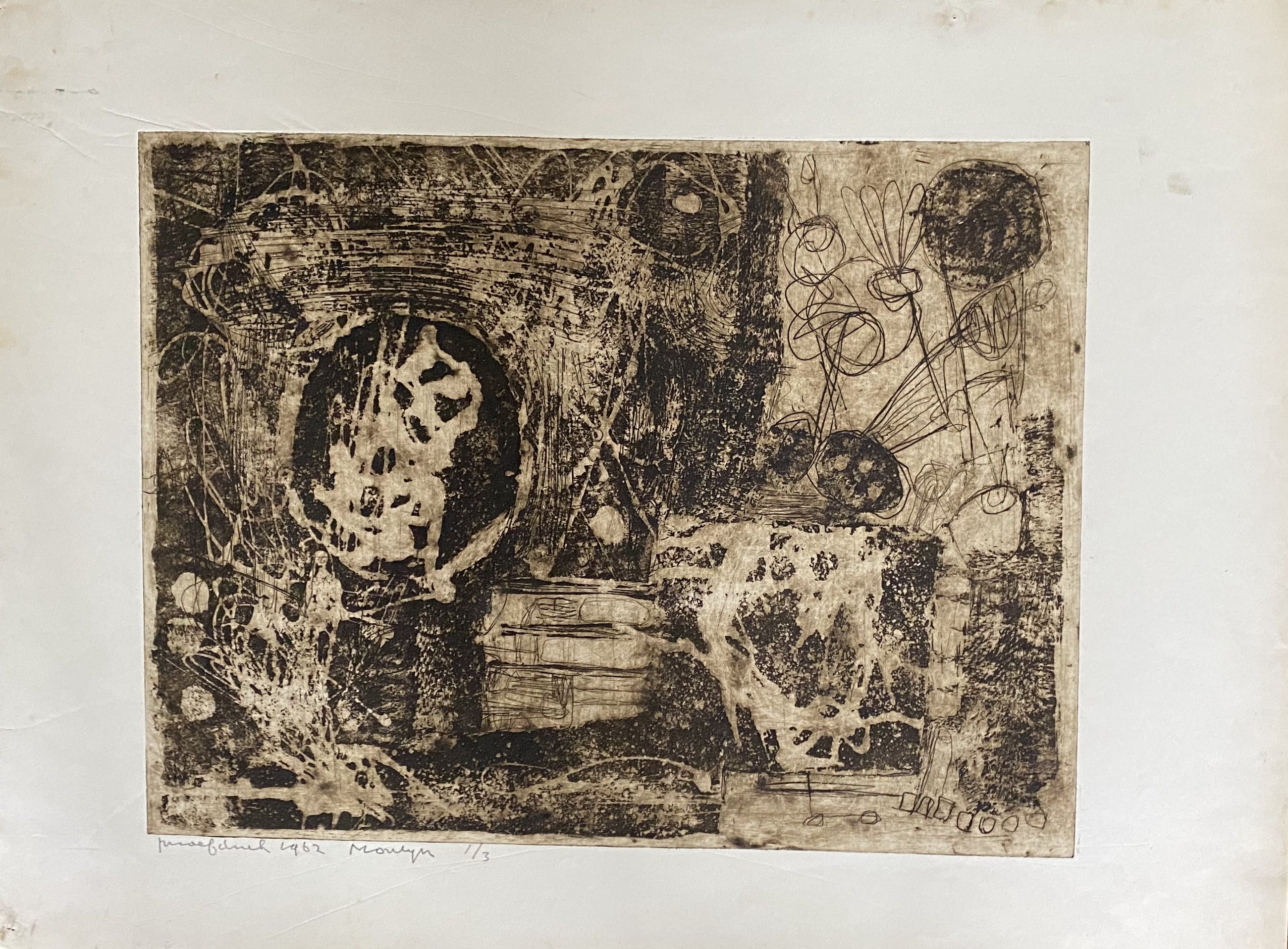 Unieke ets van Jan Montyn uit 1962. Oplage 1/3 proefdruk. Uit nalatenschap verkregen. De ets is gedrukt op dik papier en in goede staat. Een paar punaise gaatjes in de rand, maar deze vallen weg in een passe-partout. Voor een liefhebber.