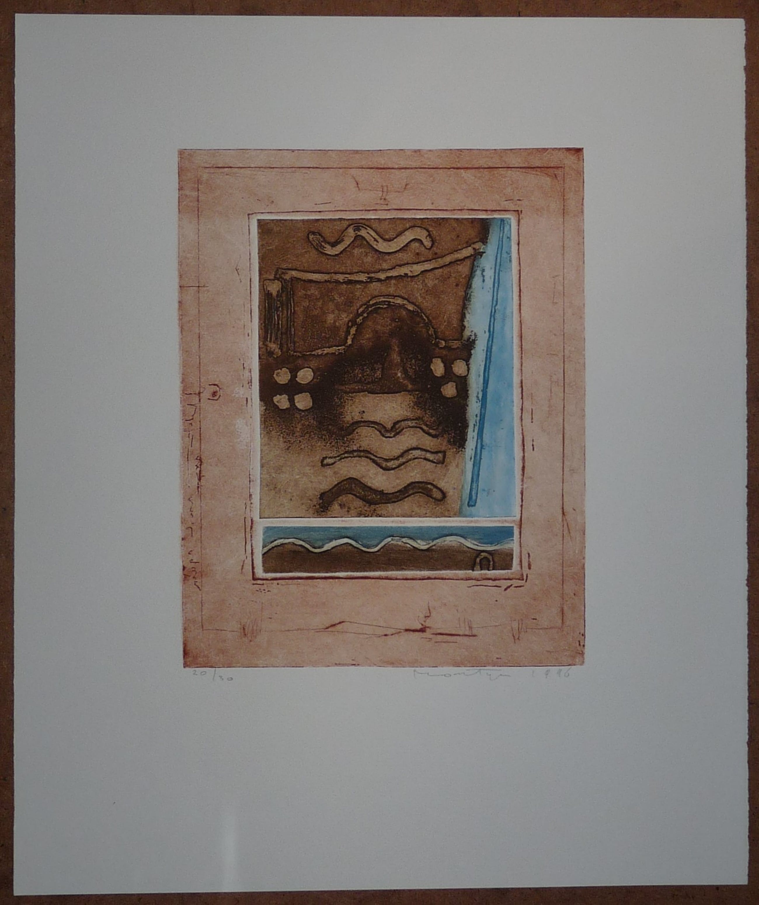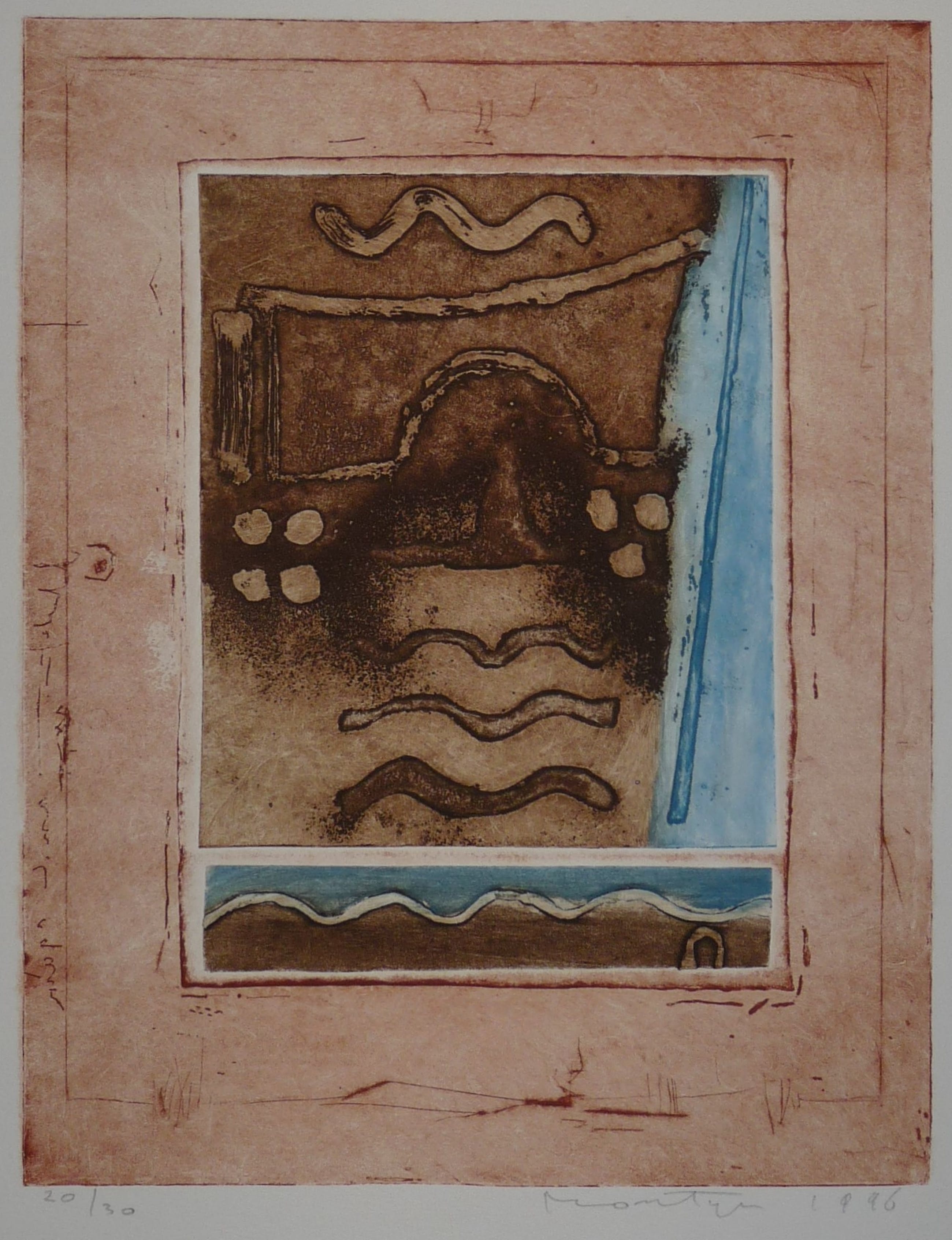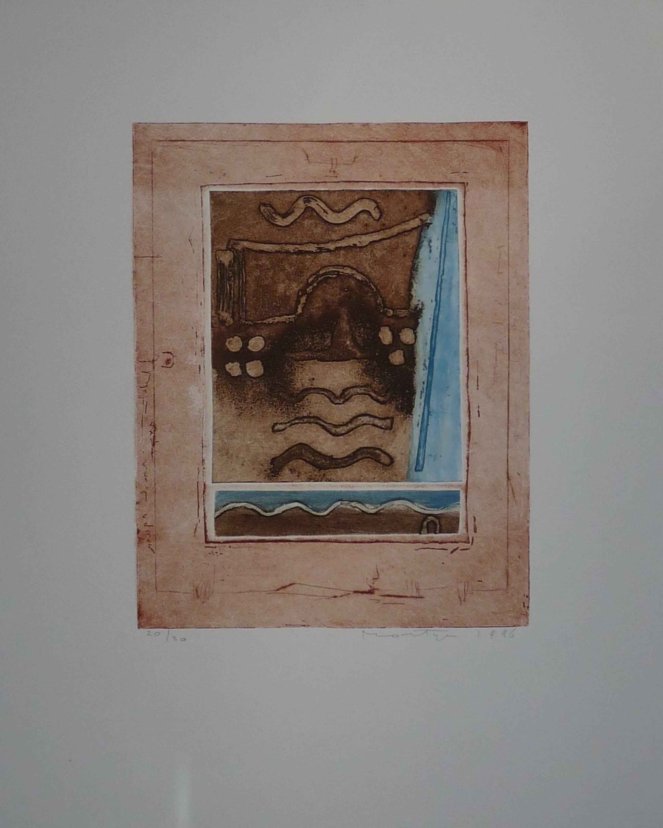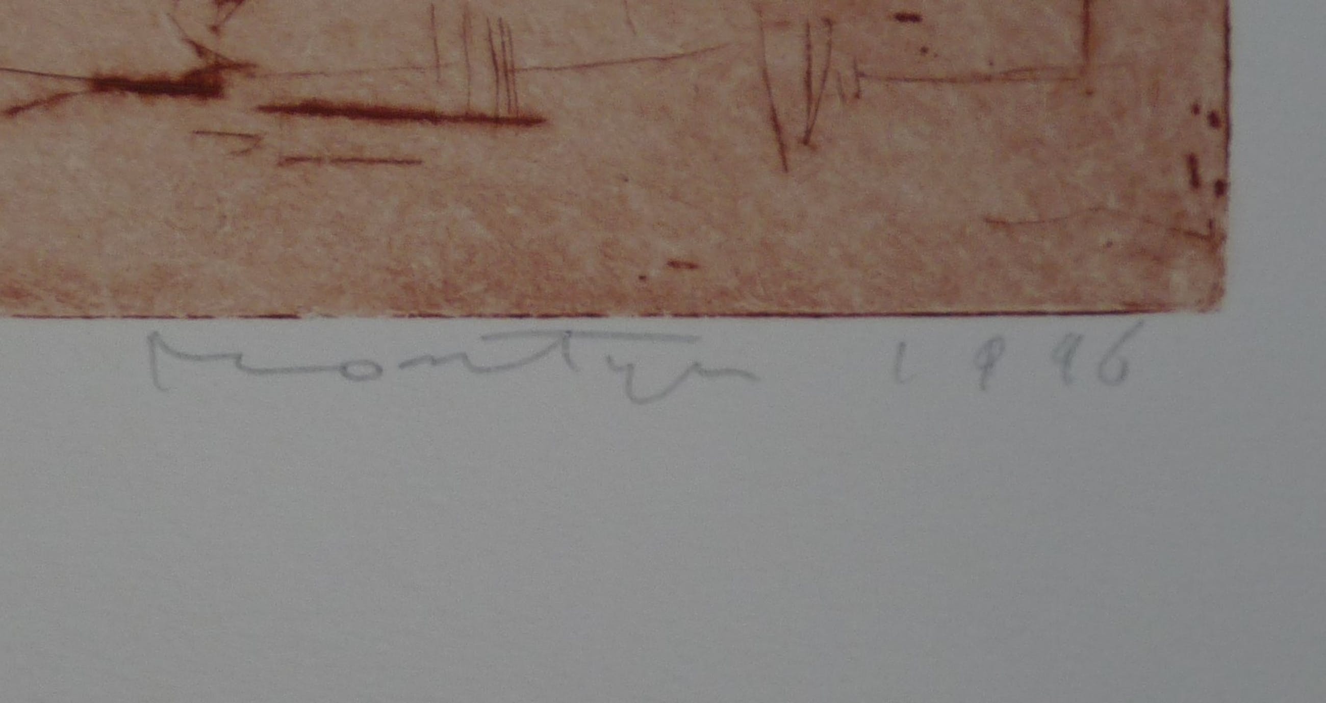 *Fraaie kleurenets op papier van de Nederlandse kunstenaar Jan Montyn. *Papiermaat 60 x 50 cm. Beeldmaat 35,5 x 27,5 cm. *Van links naar rechts in potlood: 20/30 - Montyn 1996 *Verzending is aangetekend, verzekerd en goed verpakt.