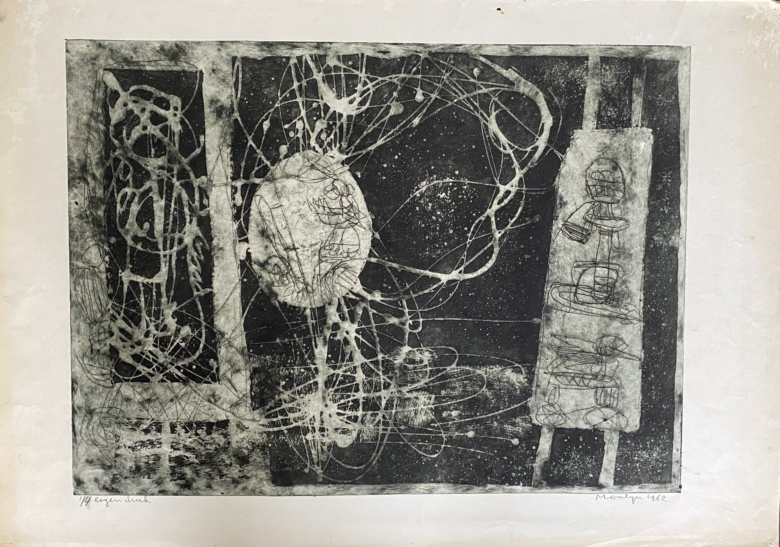 Fraaie ets van Jan Montyn uit 1962, verkregen uit nalatenschap. Oplage 1/4 eigen druk. De ets is gedrukt op dik papier en in goede staat gezien de leeftijd. Wel wat beschadigingen aan de rand, zie foto's. Groot exemplaar. Voor een liefhebber.